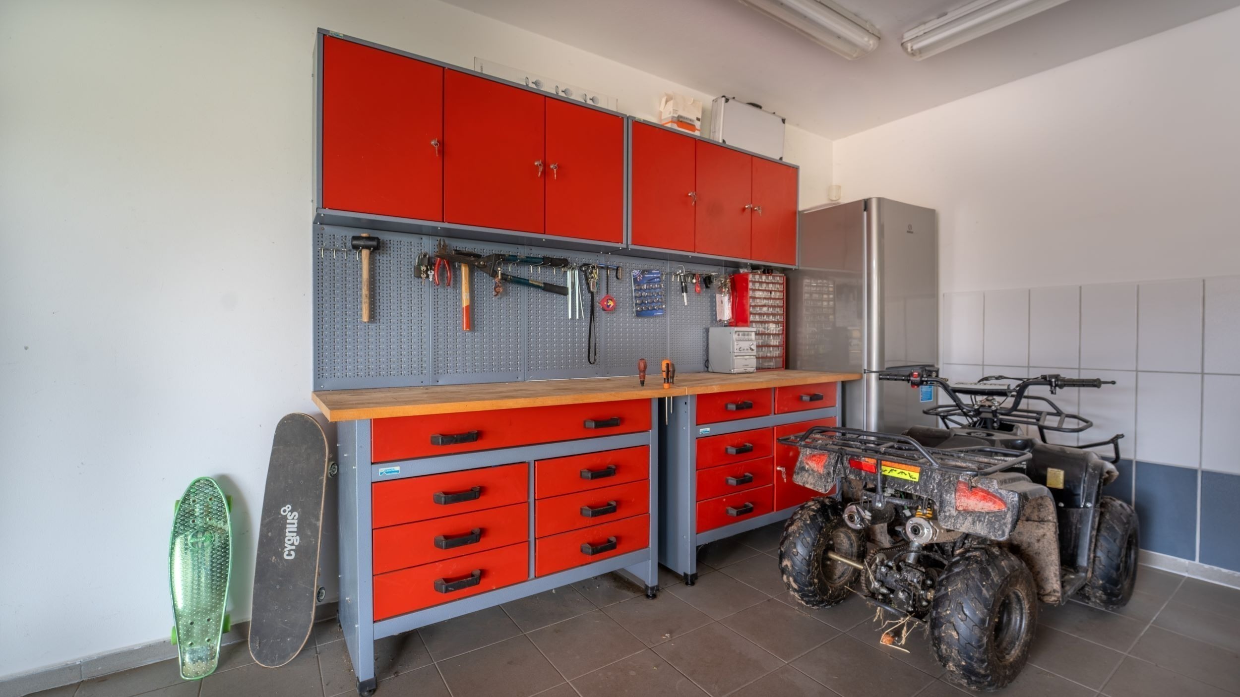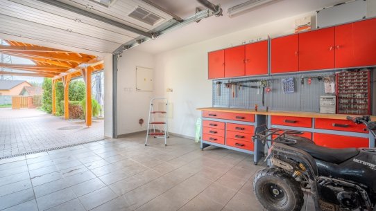 K domu patří garáž pro dvě vozidla s dílenskou sestavou. Z auta půjdete domů vždy suchou nohou – na příjezdovou cestu navazuje kryté parkovací stání až pro čtyři vozidla a zároveň ochrání vás i vaše vozidla před rozmary počasí.