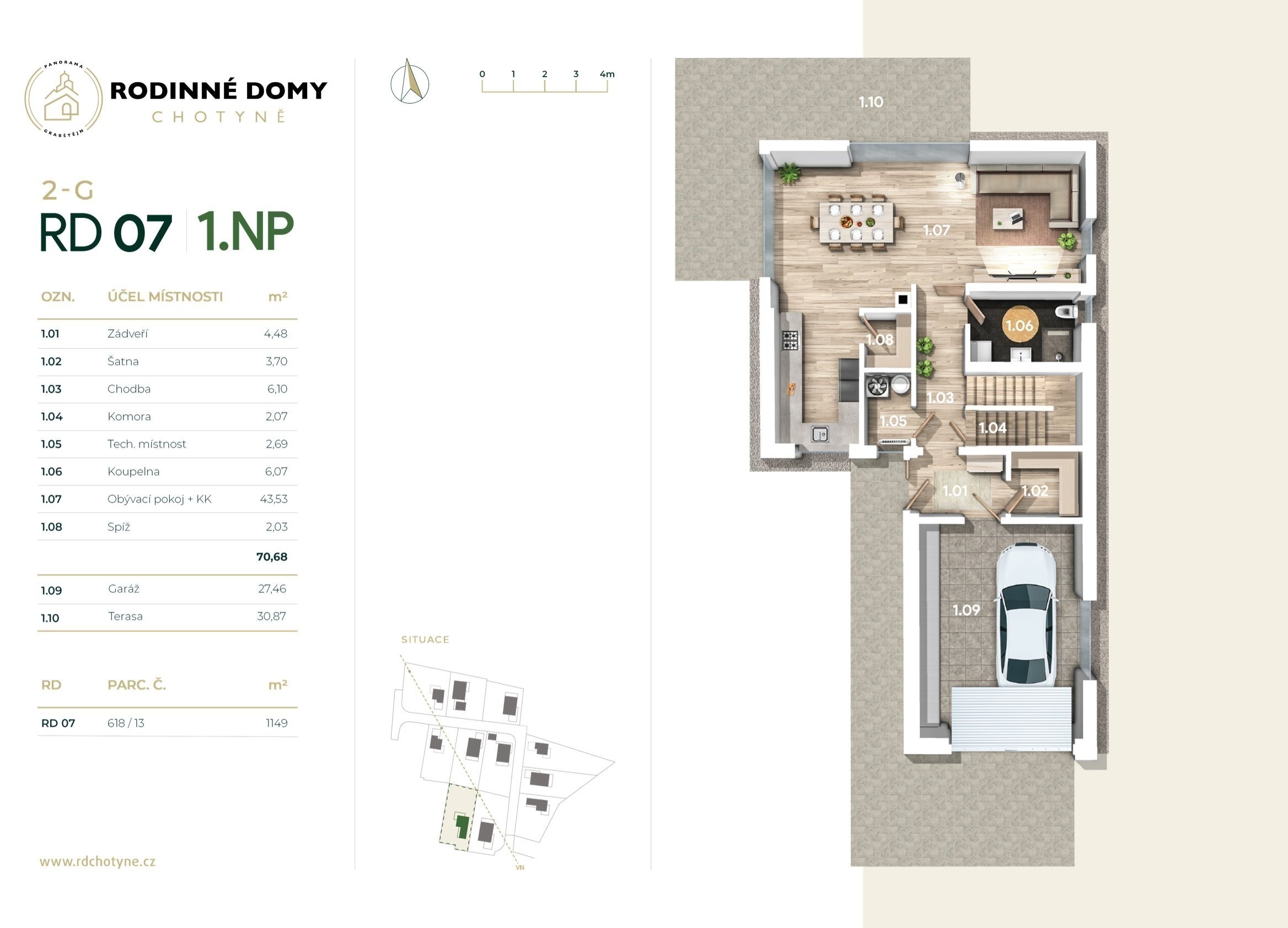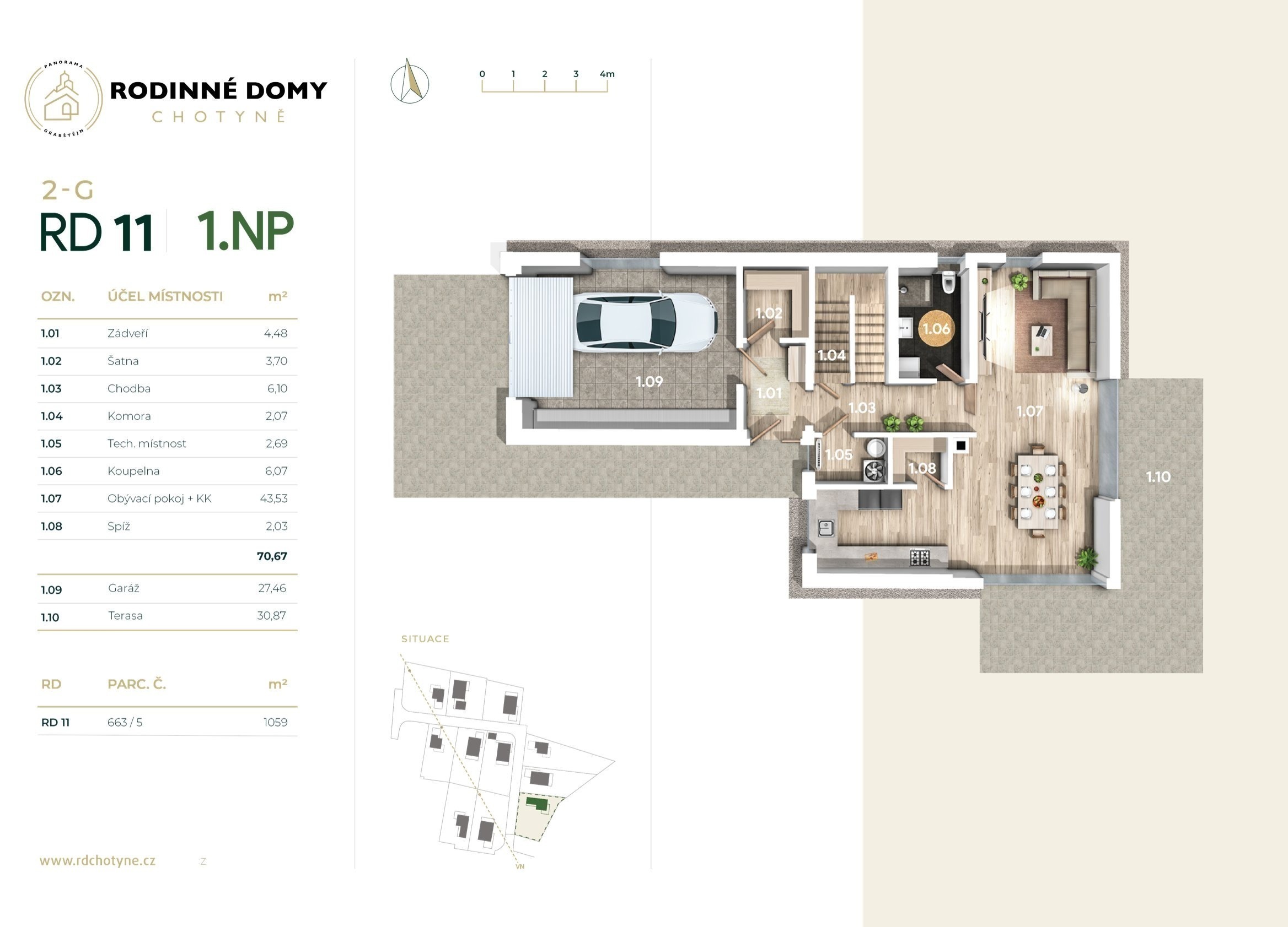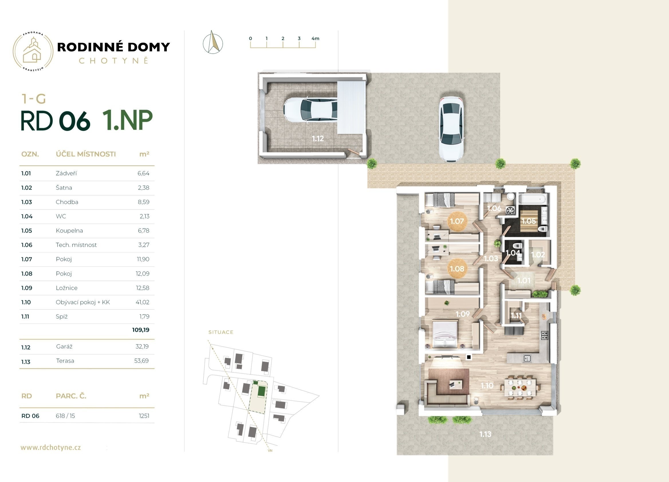 Výstavba bude dokončená na konci roku 2025, ale svůj budoucí domov si můžete prohlédnout už teď. Stačí si domluvit prohlídku vzorového domu – ten je kompletně zařízený a vy tak získáte jasnou představu, jak se vám bude v Chotyni bydlet.