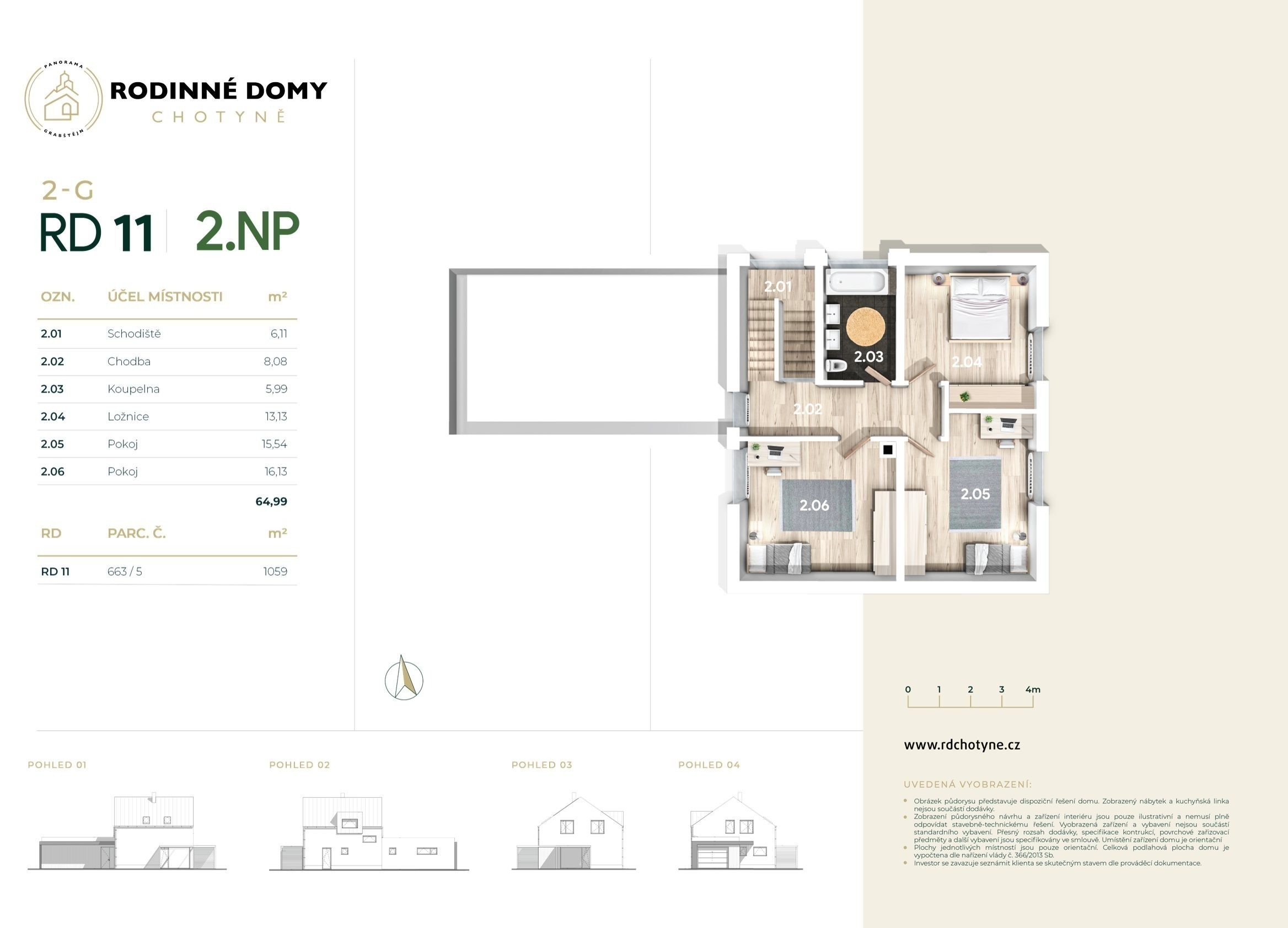 Vybírat si můžete z jednopodlažních nebo dvoupodlažních domů s dispozicí 4+kk a výměrou od 146 do 209 m². Každý z domů bude mít vlastní zahradu s výměrou 972 až 1 396 m² a kryté stání nebo garáž.