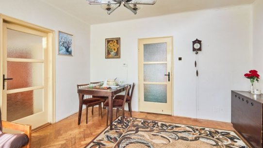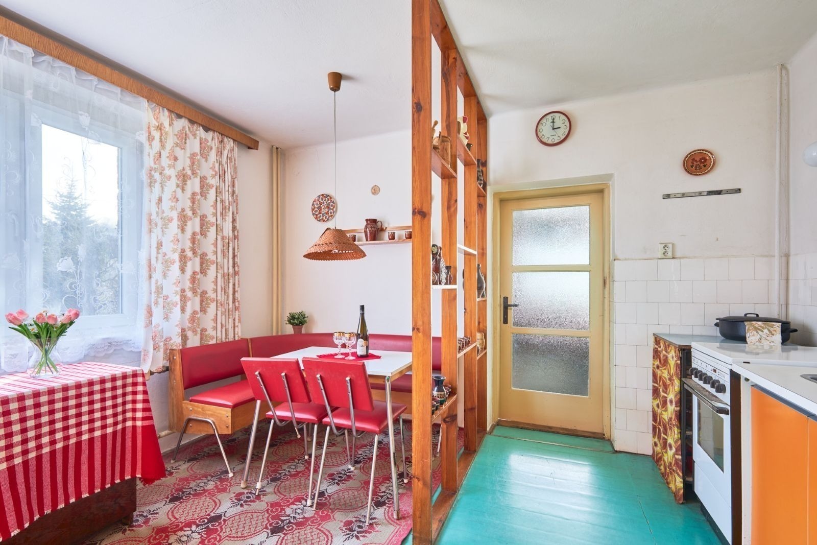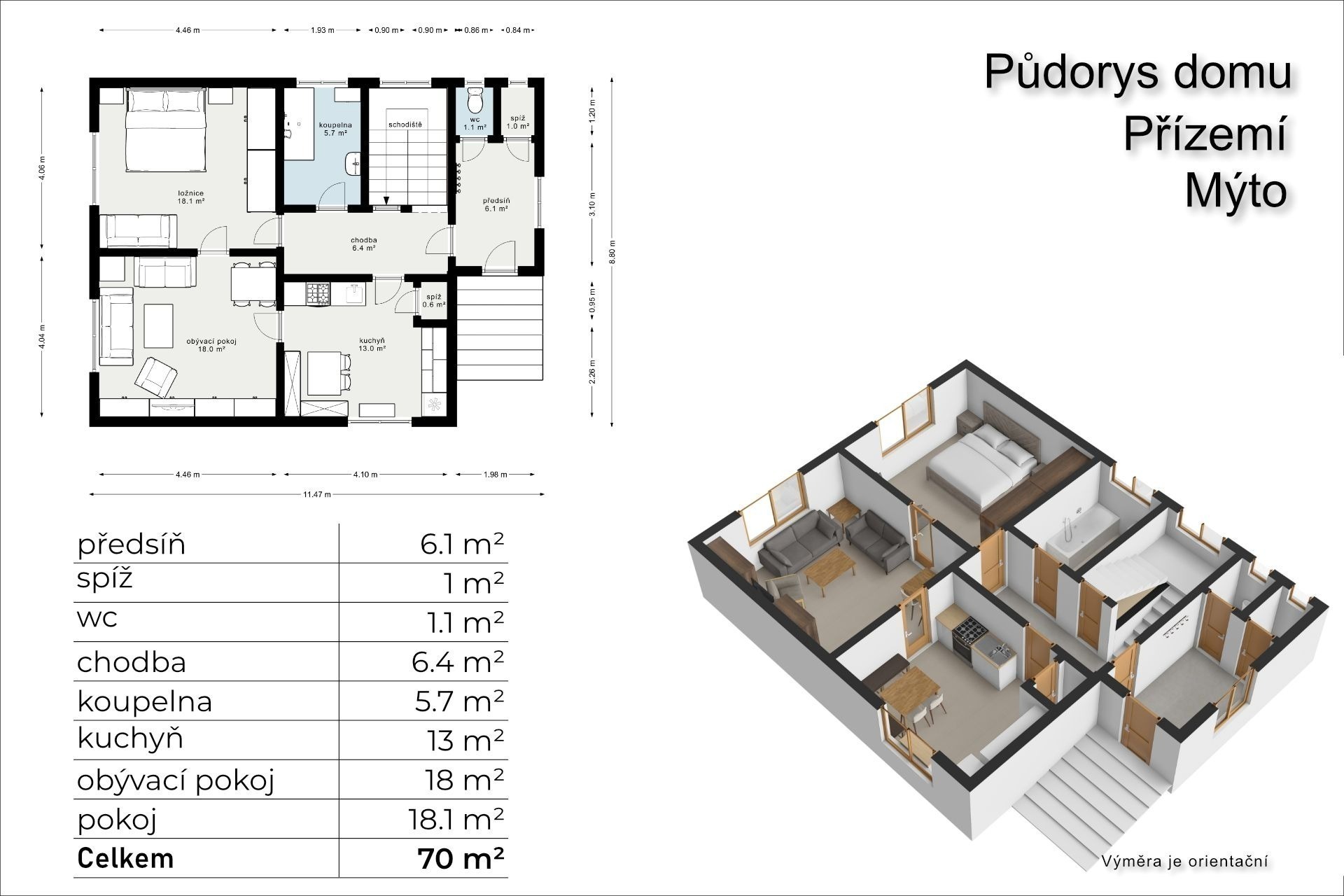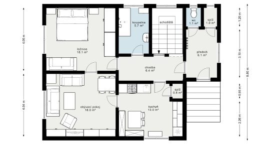 Obývací pokoj je od kuchyně stavebně oddělený, ale pro svačinou k televizi to mít daleko nebudete – obě místnosti jsou propojené dveřmi. V přízemí je ještě jeden pokoj, koupelna a samostatná toaleta.