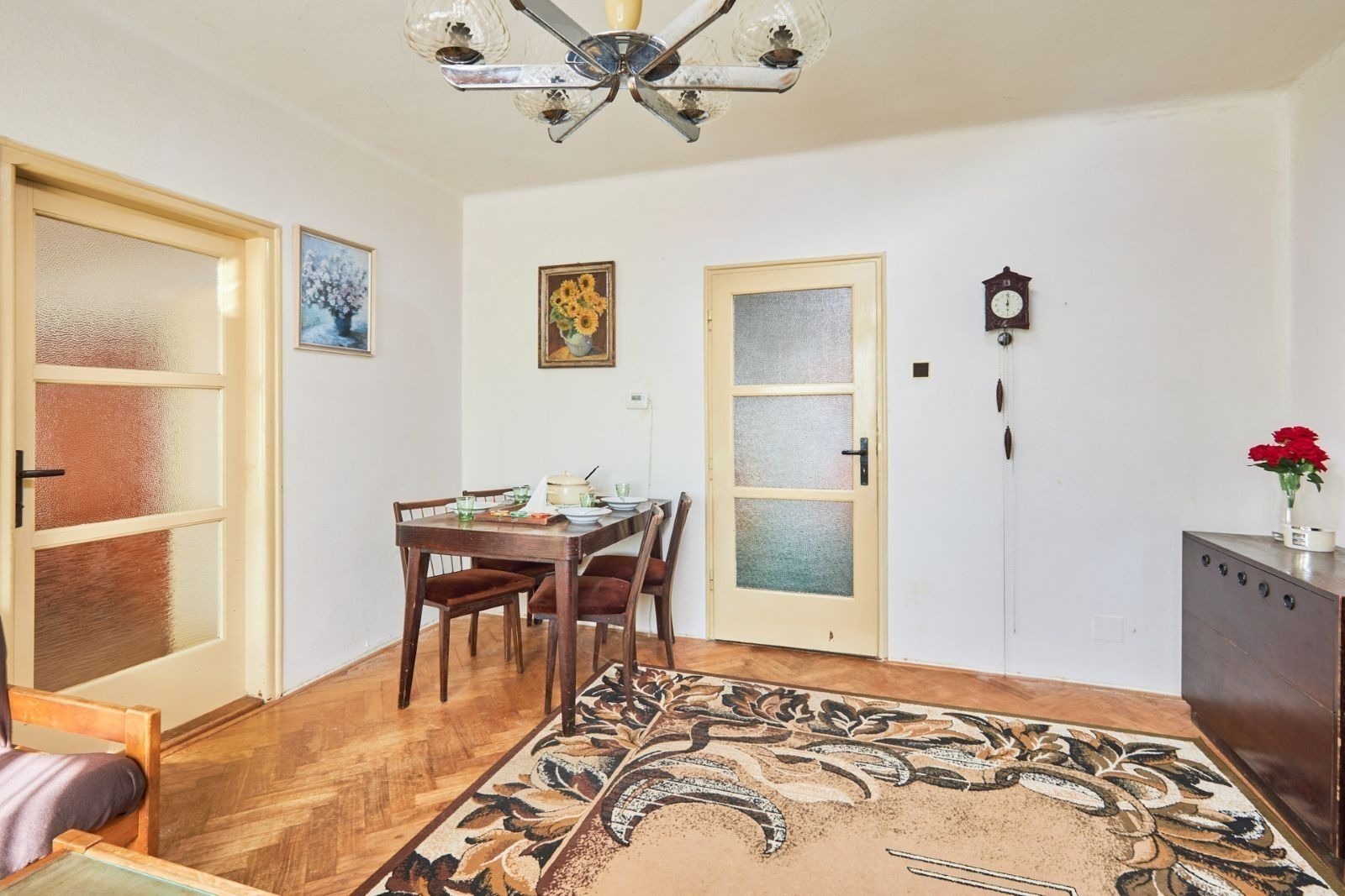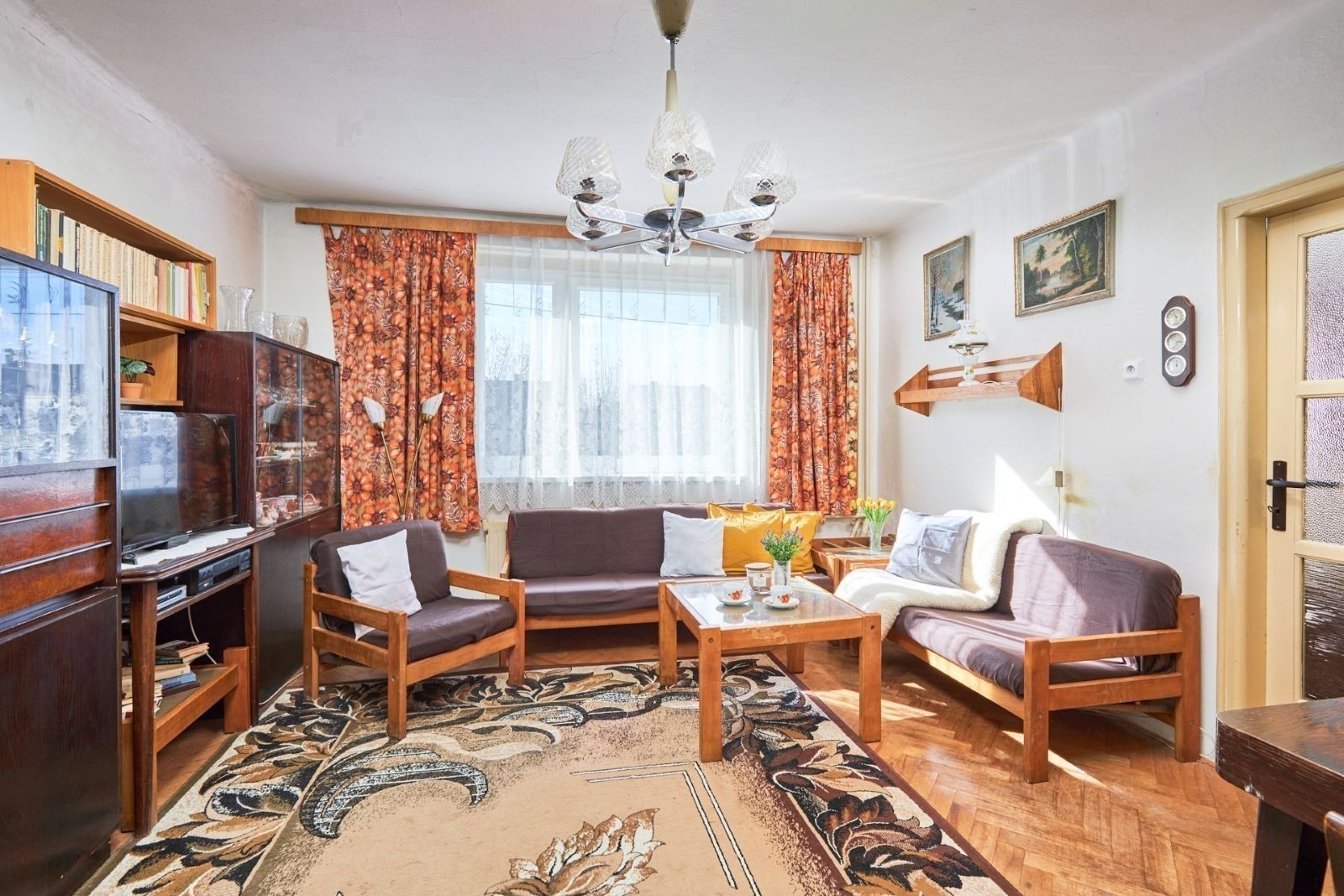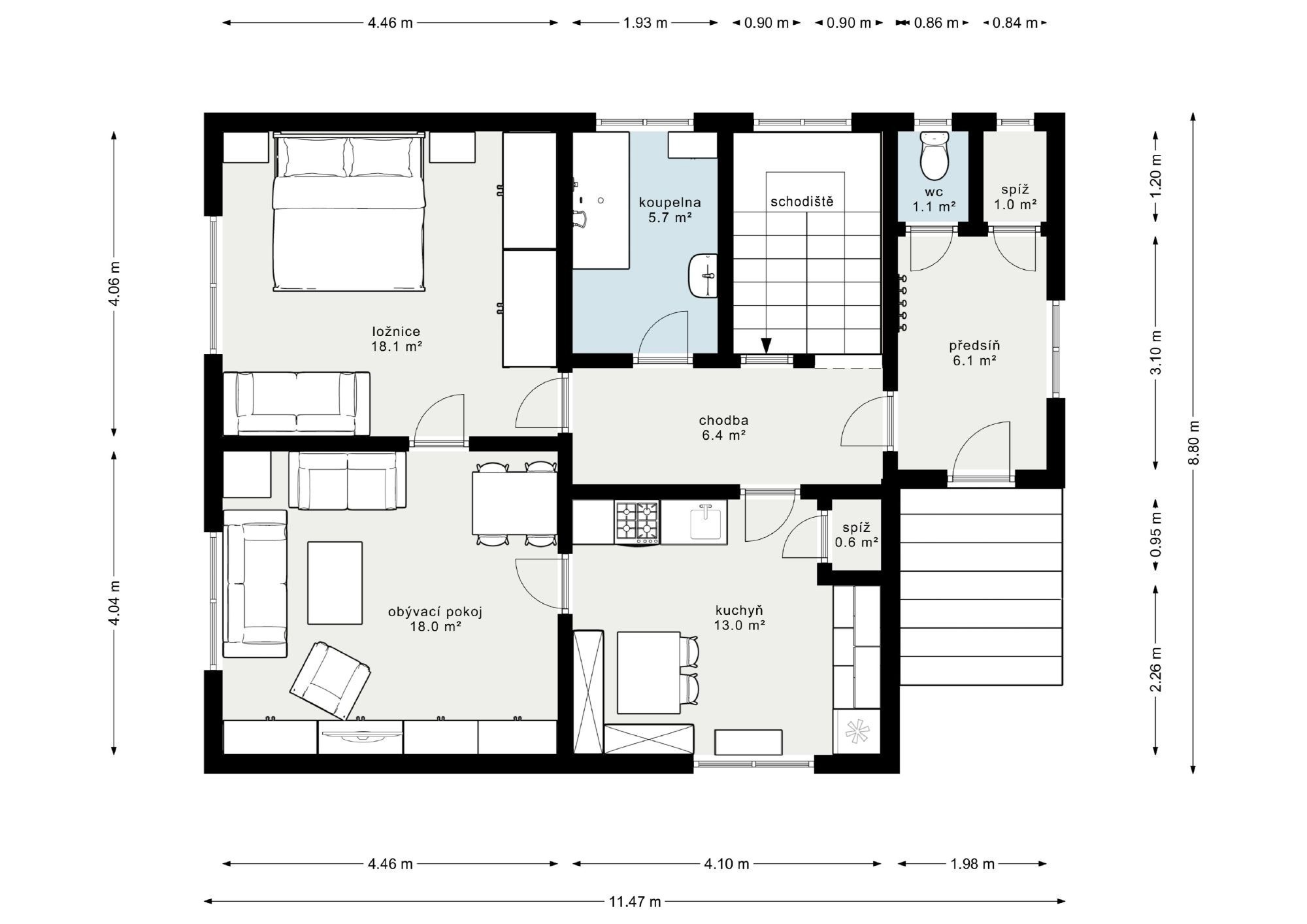 Obývací pokoj je od kuchyně stavebně oddělený, ale pro svačinou k televizi to mít daleko nebudete – obě místnosti jsou propojené dveřmi. V přízemí je ještě jeden pokoj, koupelna a samostatná toaleta.
