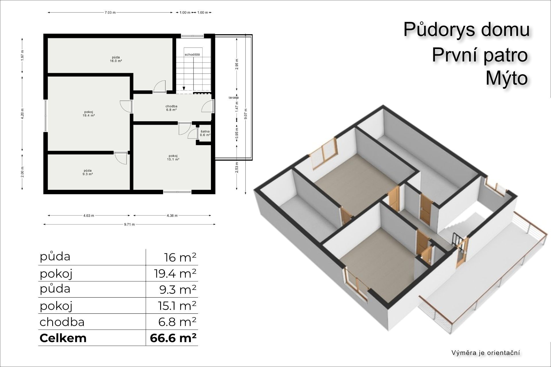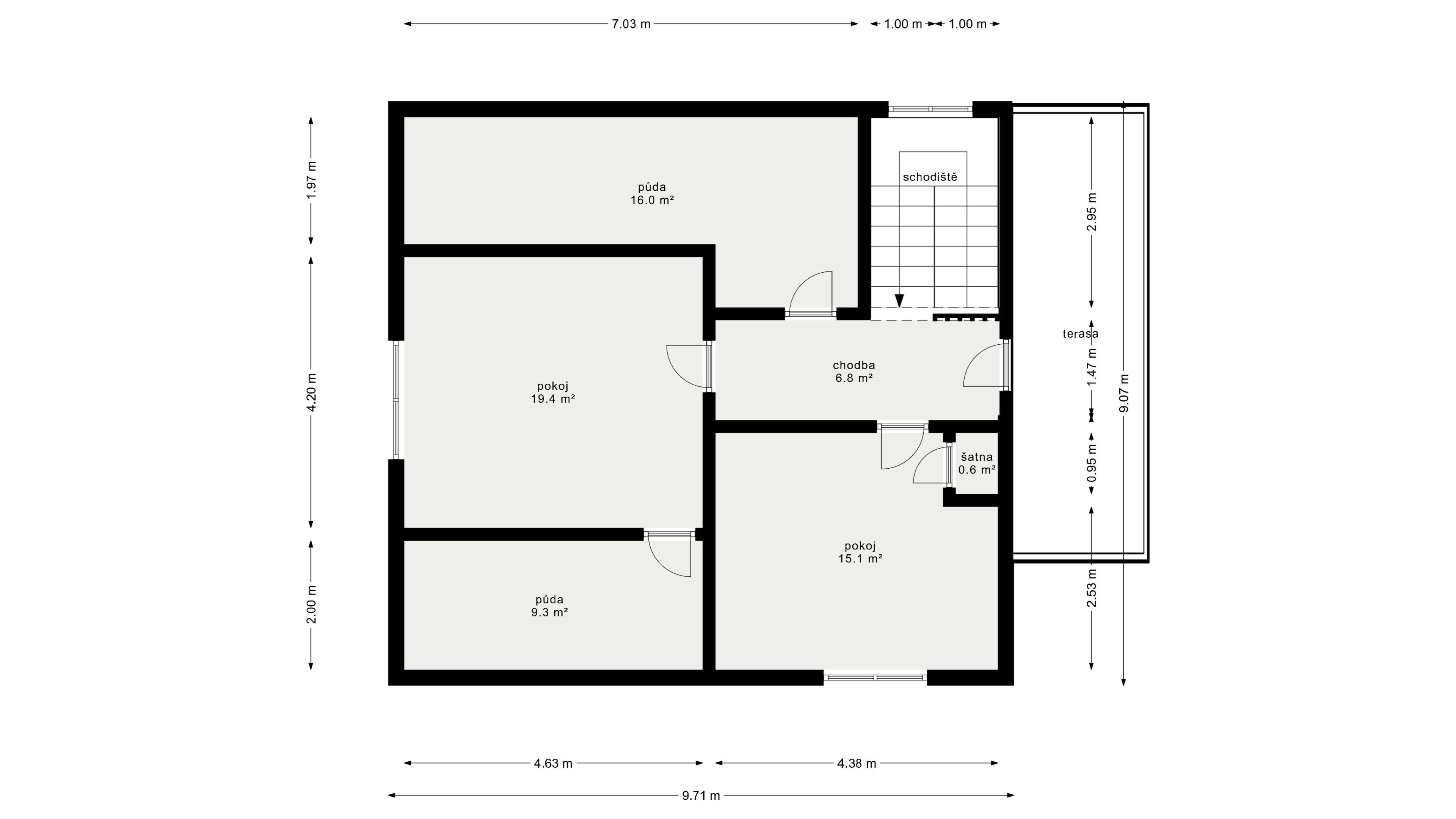 Po schodech vyjdete do patra, kde jsou další dva prostorné pokoje a terasa s výhledem do zahrady, kde si to za slunečných dní opravdu užijete. Nouzi nebudete mít ani o úložné prostory. Kromě dvou spíží v přízemí jsou tu i půdní prostory a velký sklep.