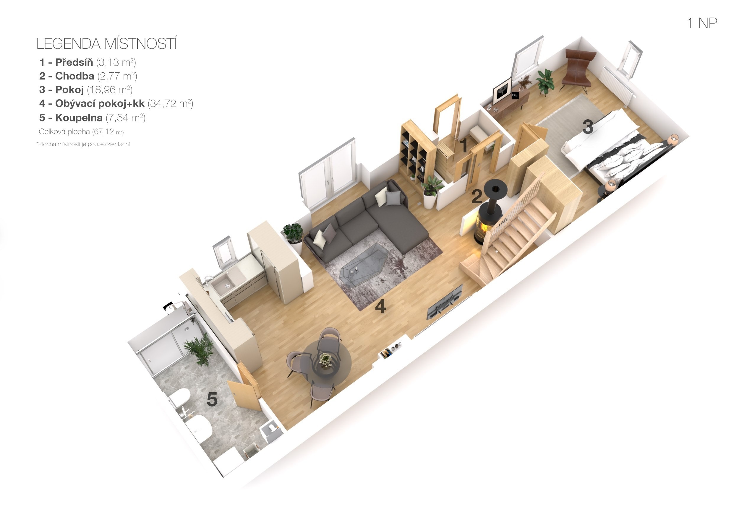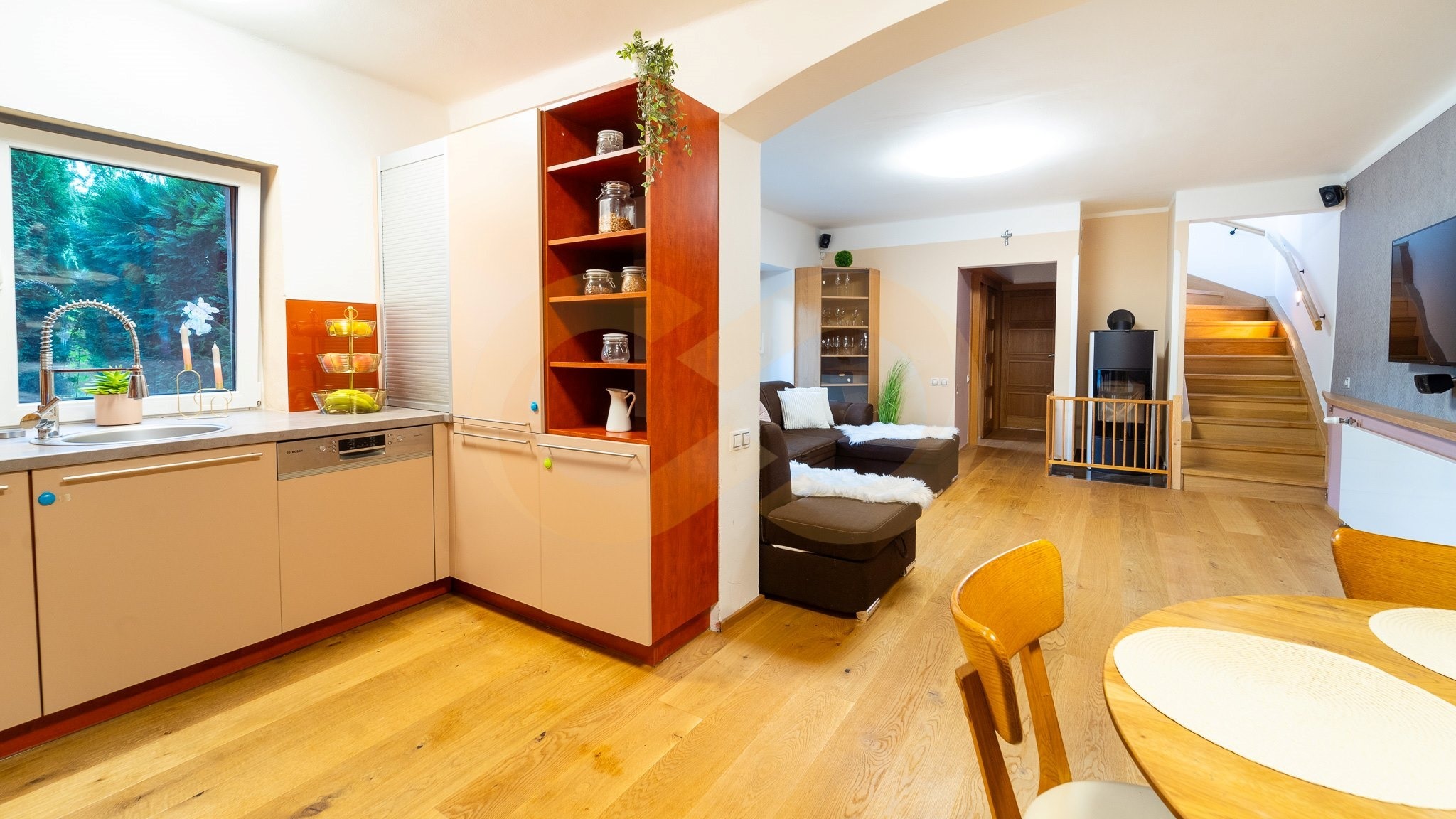 V přízemí domu se za zádveřím a chodbou nachází hostinský pokoj se saunou. Na druhé straně domu je obývací pokoj s krbovými kamny a vstupem na zahradu, na něj navazuje kuchyňská linka s jídelnou. Vedle kuchyně je koupelna, v níž je ukrytý elektrický kotel 14 kW, bojler, pračka a sušička.