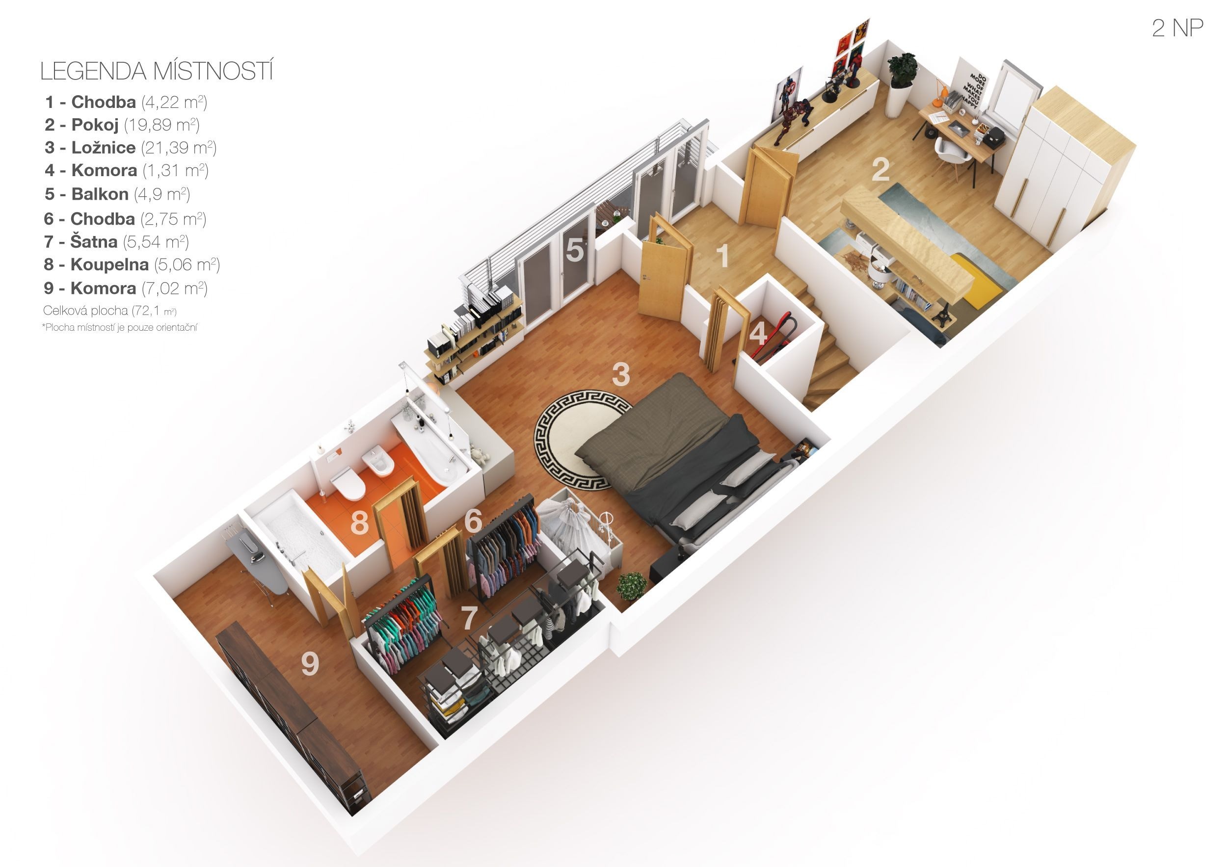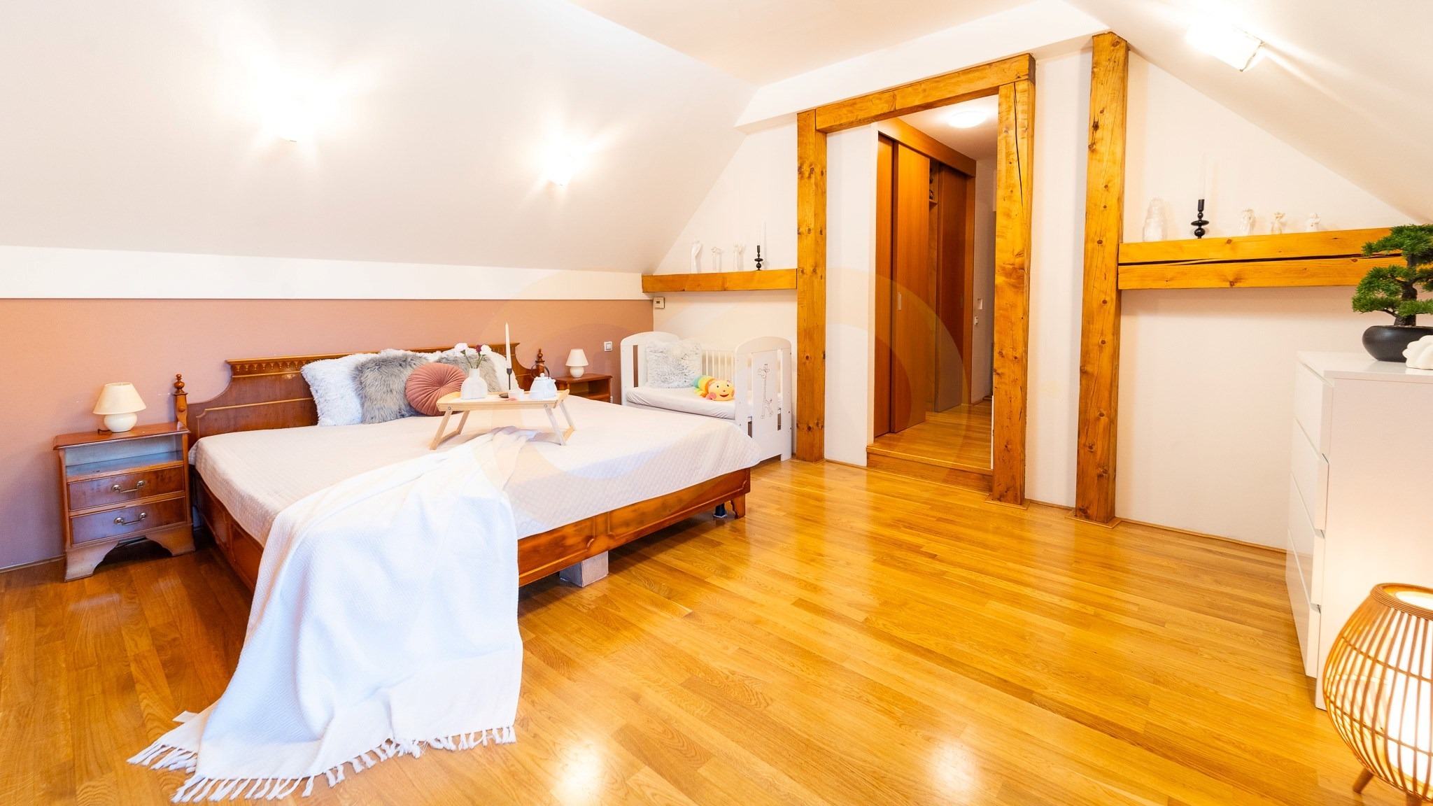 Ve druhém patře, kde jsou vyvýšené stropy a přiznané trámy, se nalézá pracovna nebo dětský pokoj, ložnice a chodba. Z chodby i ložnice je přístup na balkon s výhledem na okolí. Součástí ložnice je také komůrka a šatna s přilehlou koupelnou.