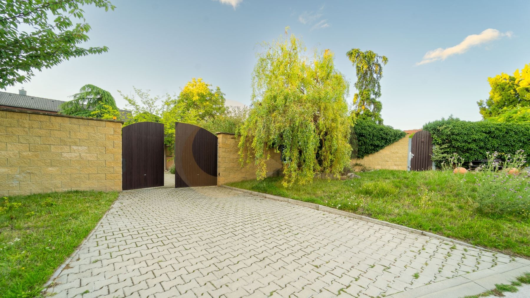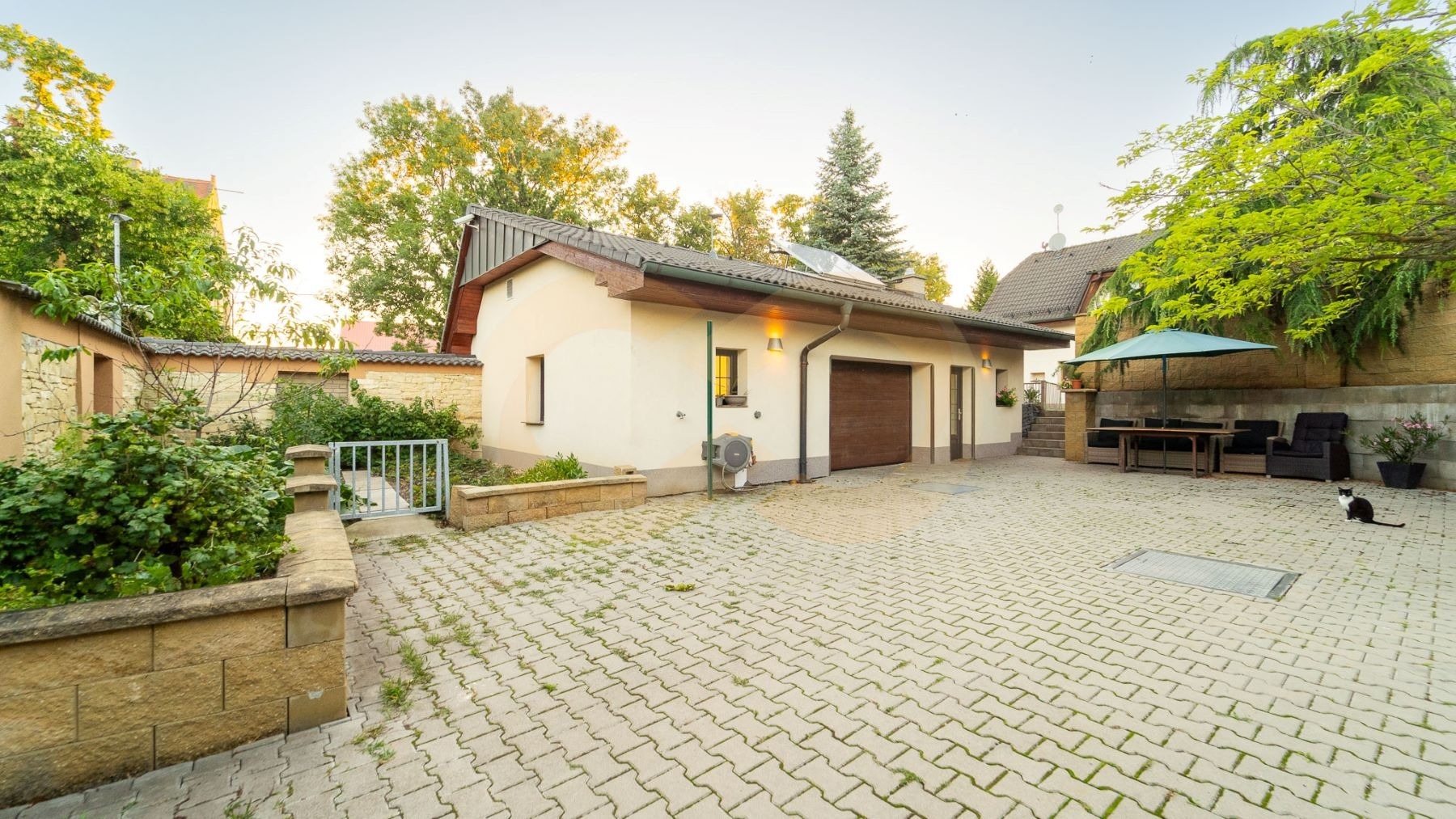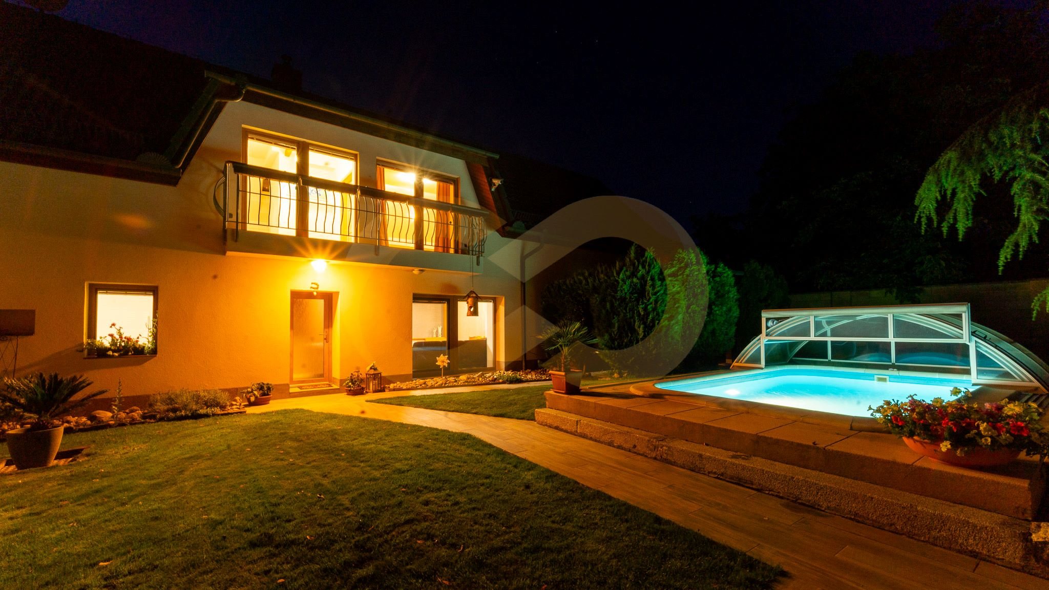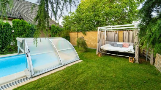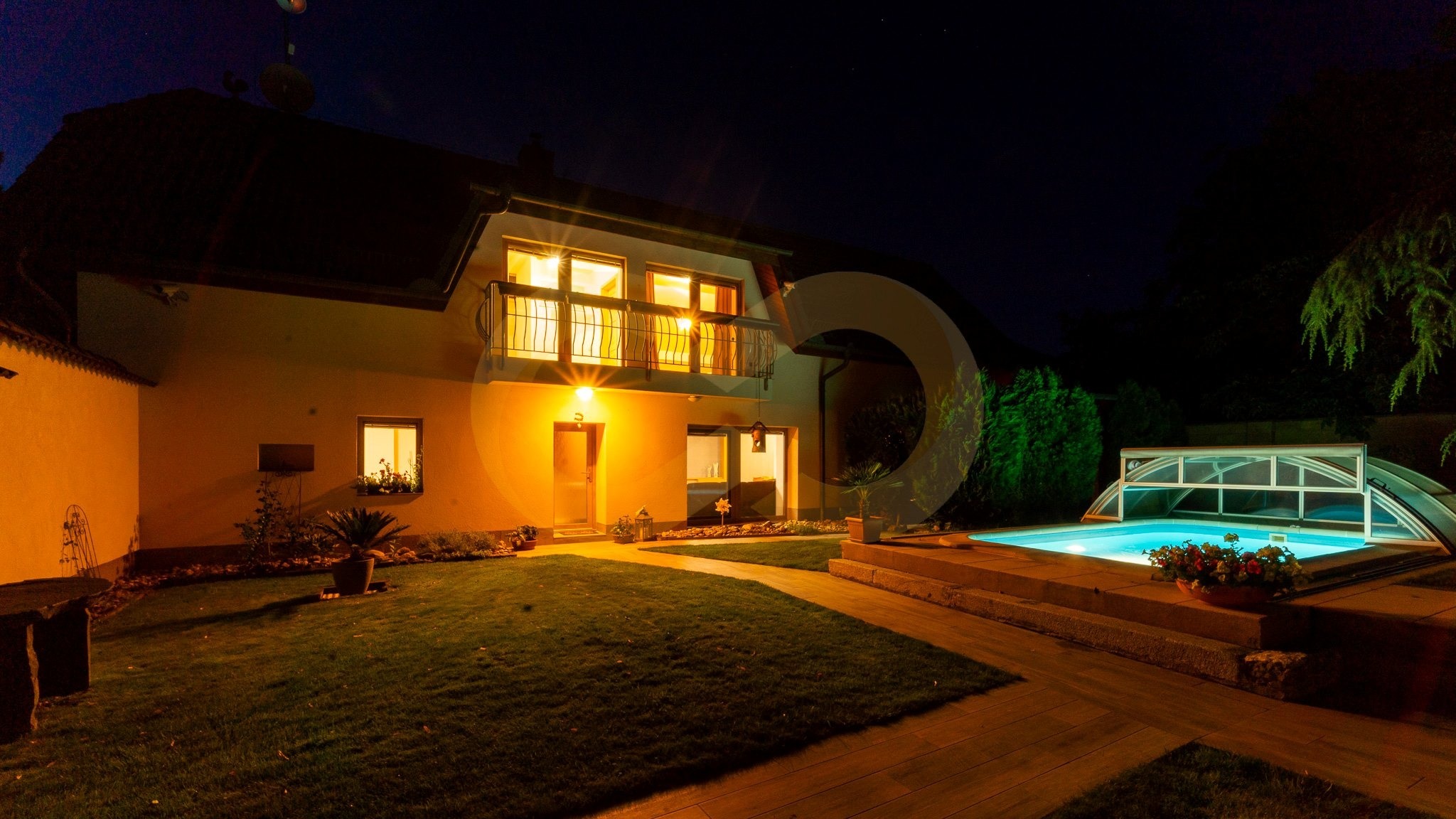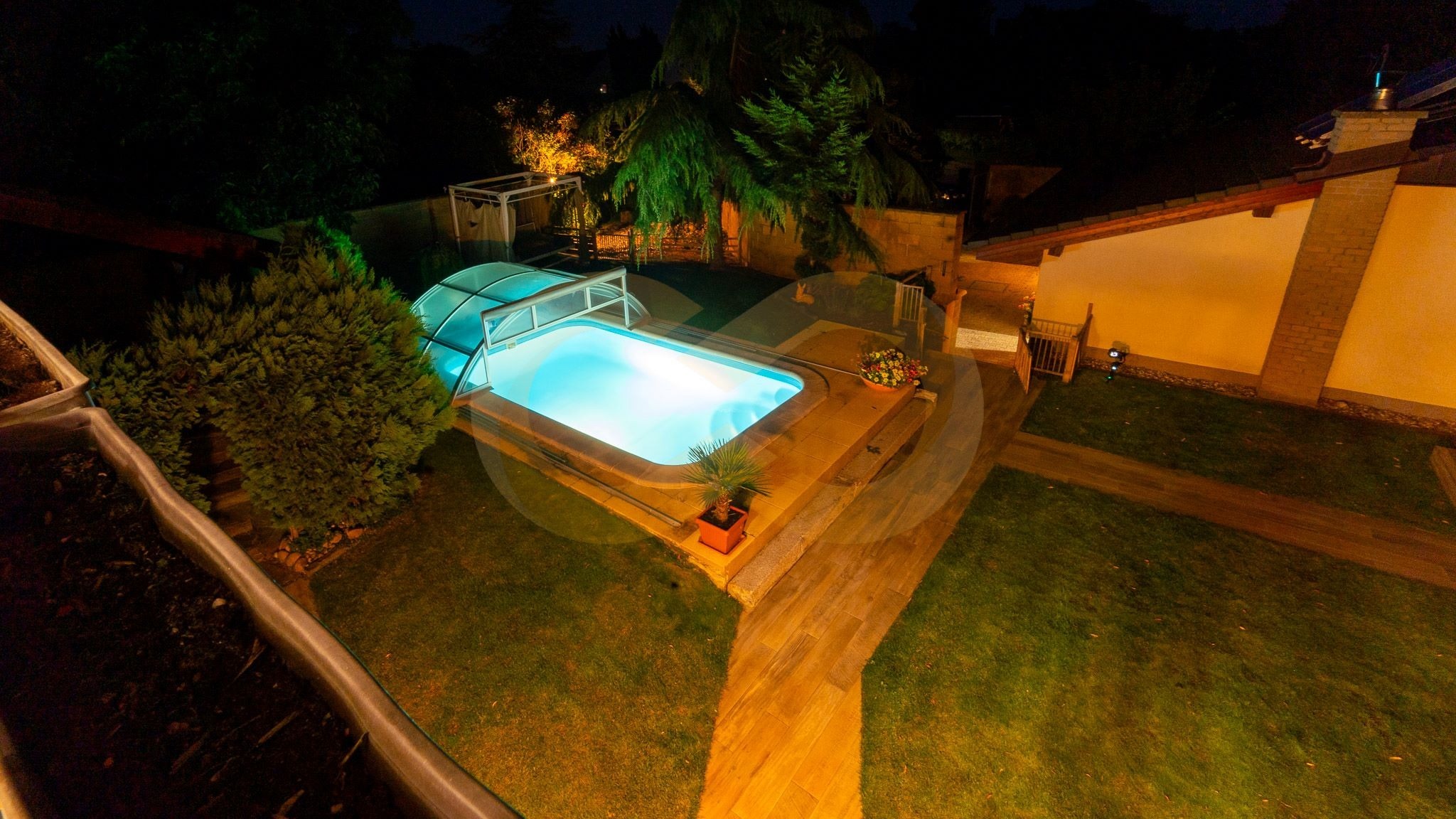 K domu náleží prostorná zahrada a krytý bazén, který je vyhřívaný solárními panely (technologie k solárním panelům, písková filtrace a UV světlo na čištění vody se nachází ve sklepě). Na zahradě je také pergola s krbem, otevřené ohniště a dílna – zašívárna pro muže. Problém s prostorem nebude ani při parkování Vašich aut či aut Vašich návštěv, je zde dvojgaráž a k tomu další tři parkovací stání.