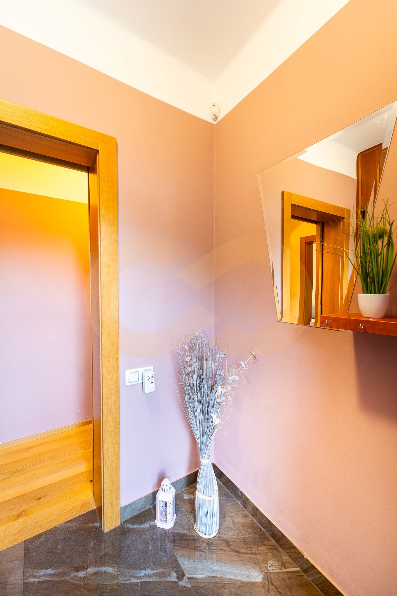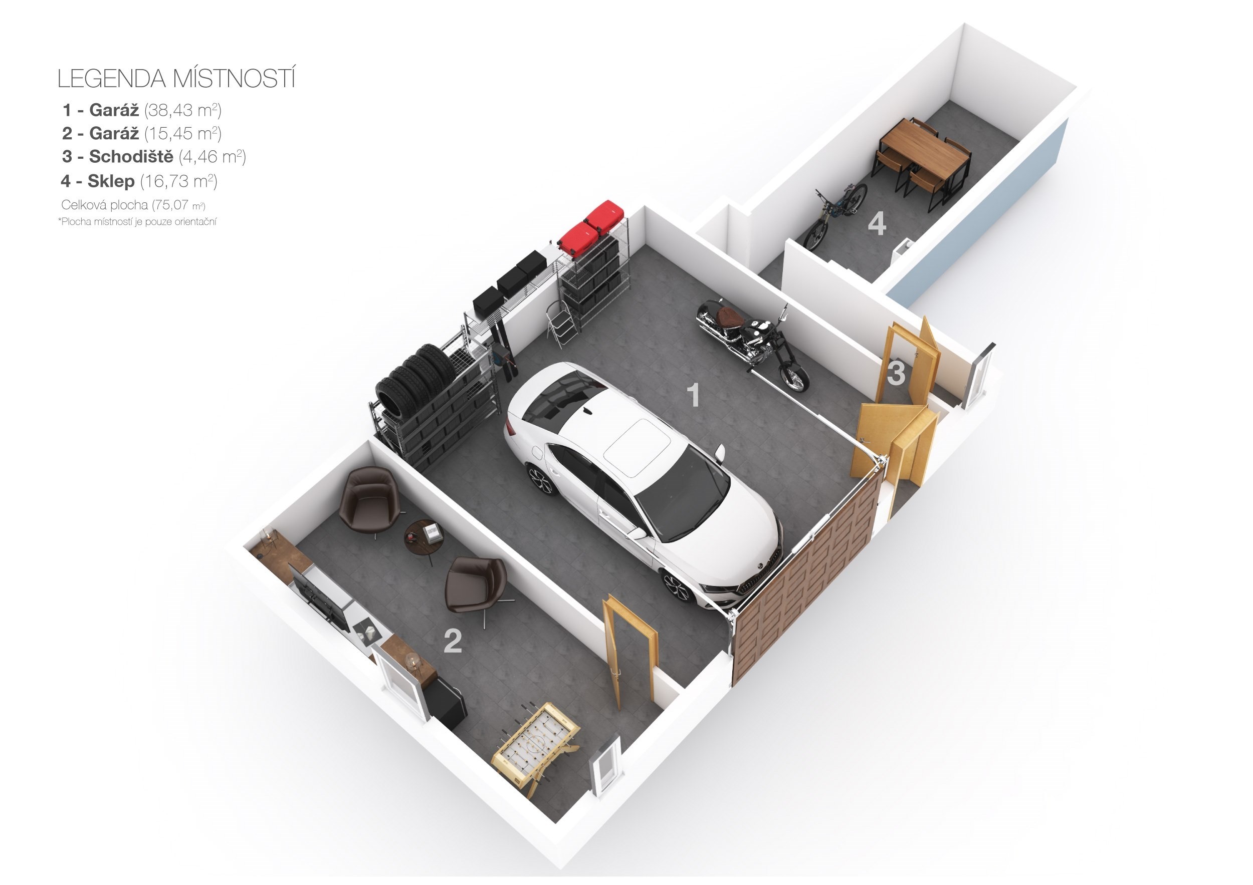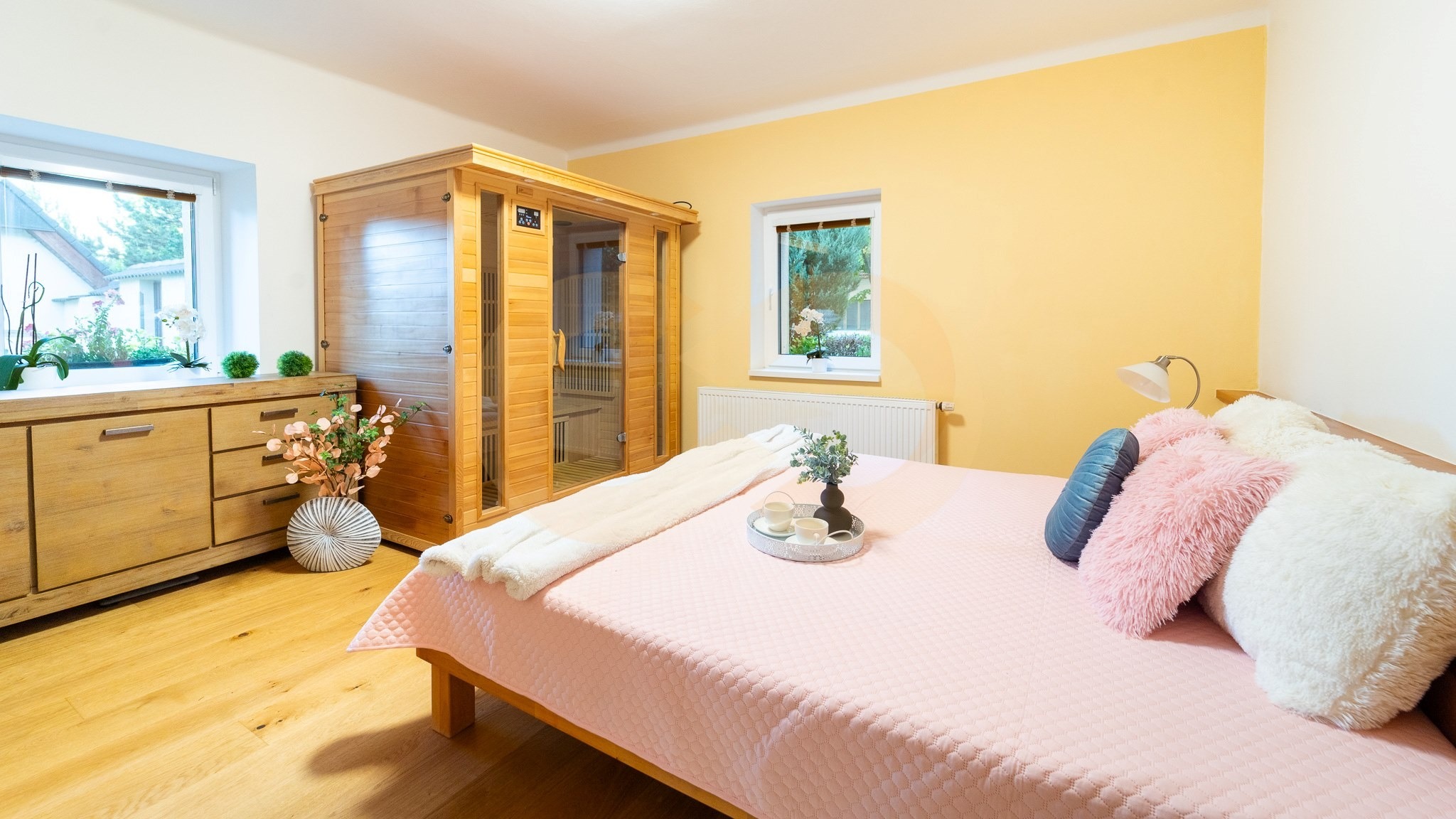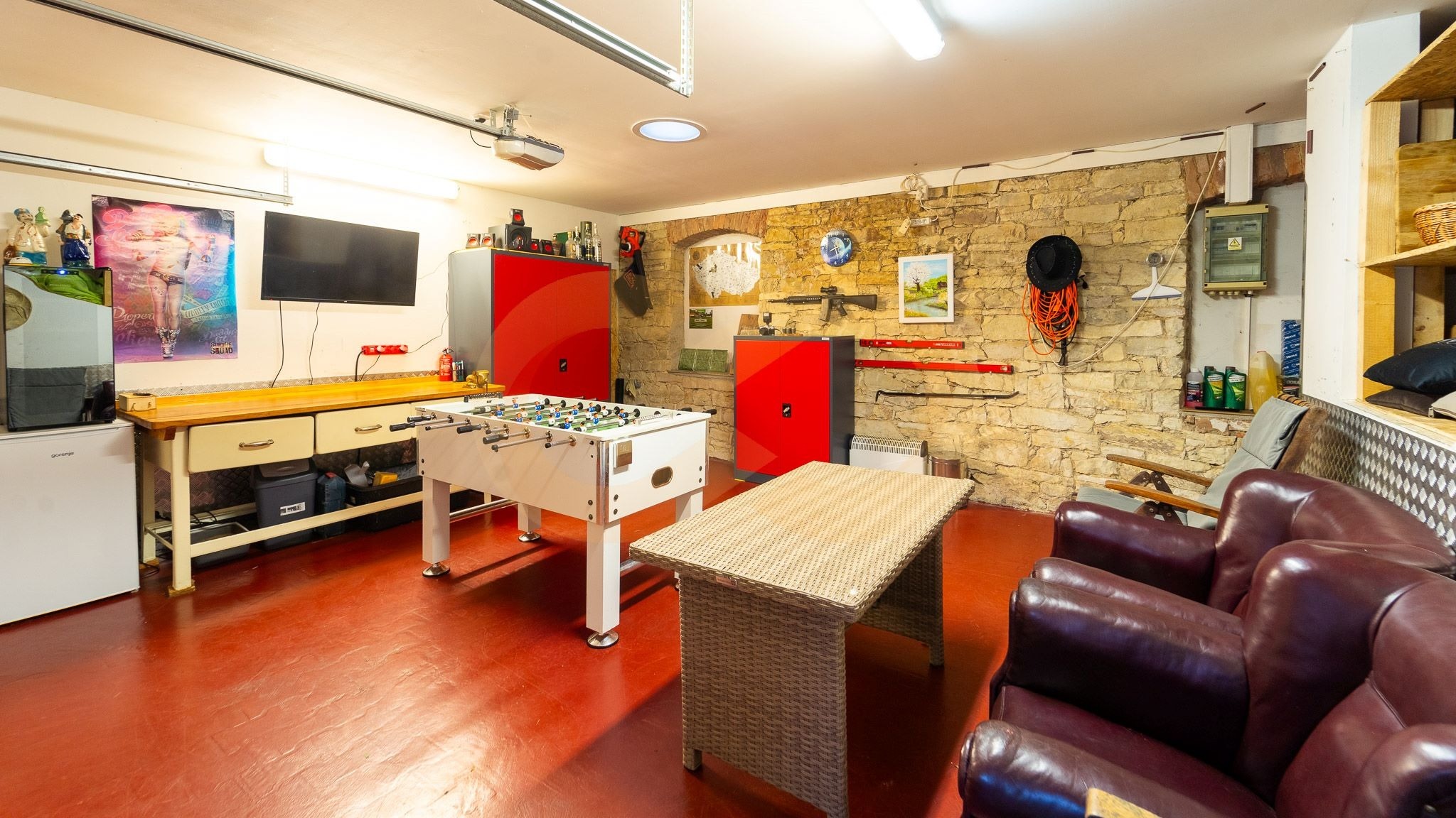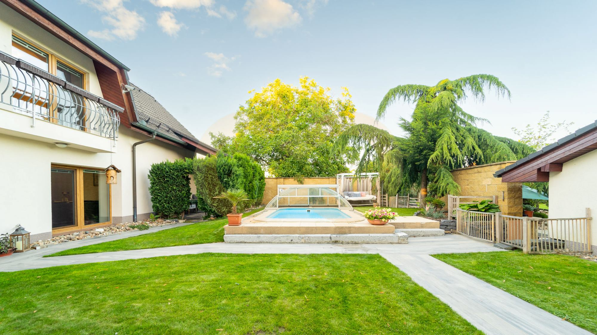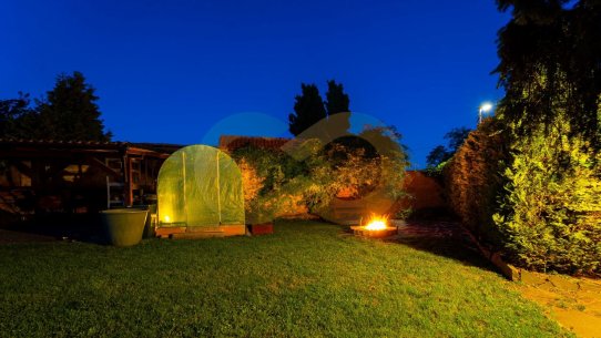 K domu náleží prostorná zahrada a krytý bazén, který je vyhřívaný solárními panely (technologie k solárním panelům, písková filtrace a UV světlo na čištění vody se nachází ve sklepě). Na zahradě je také pergola s krbem, otevřené ohniště a dílna – zašívárna pro muže. Problém s prostorem nebude ani při parkování Vašich aut či aut Vašich návštěv, je zde dvojgaráž a k tomu další tři parkovací stání.