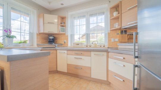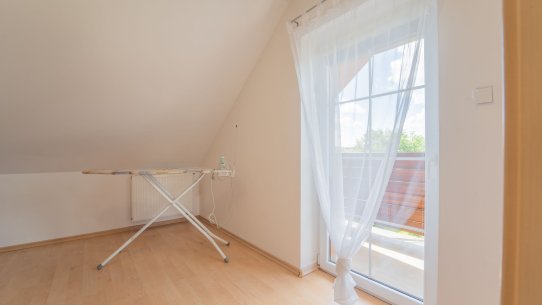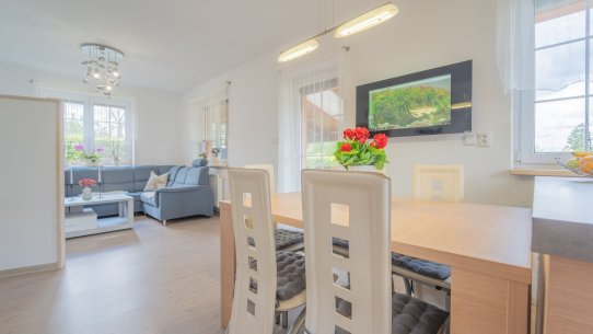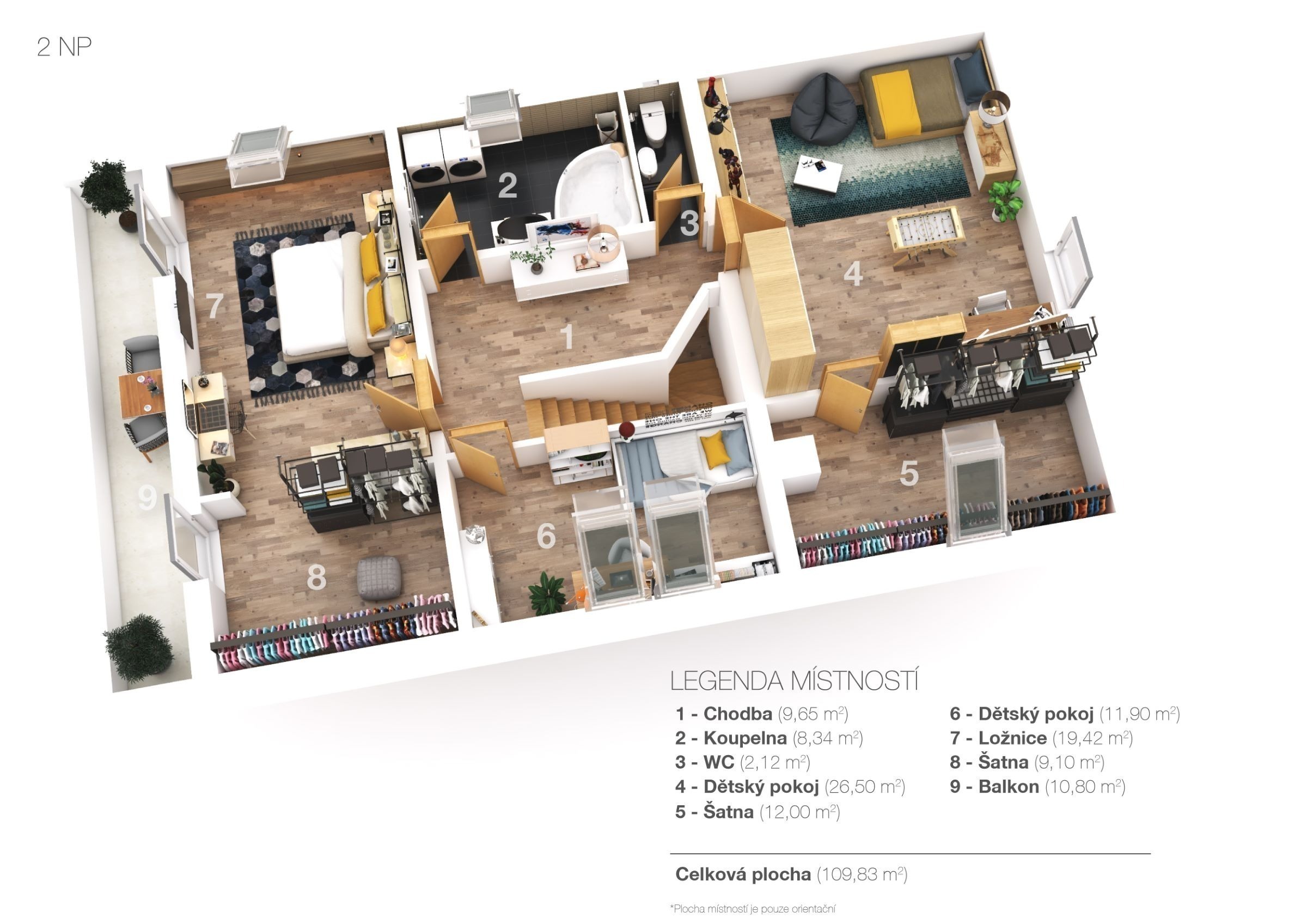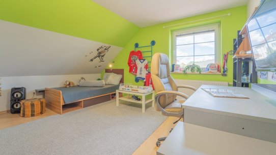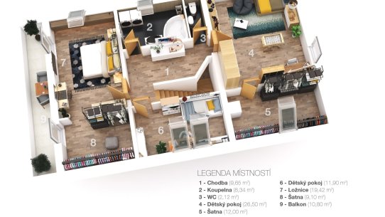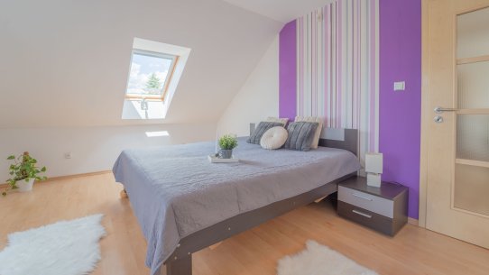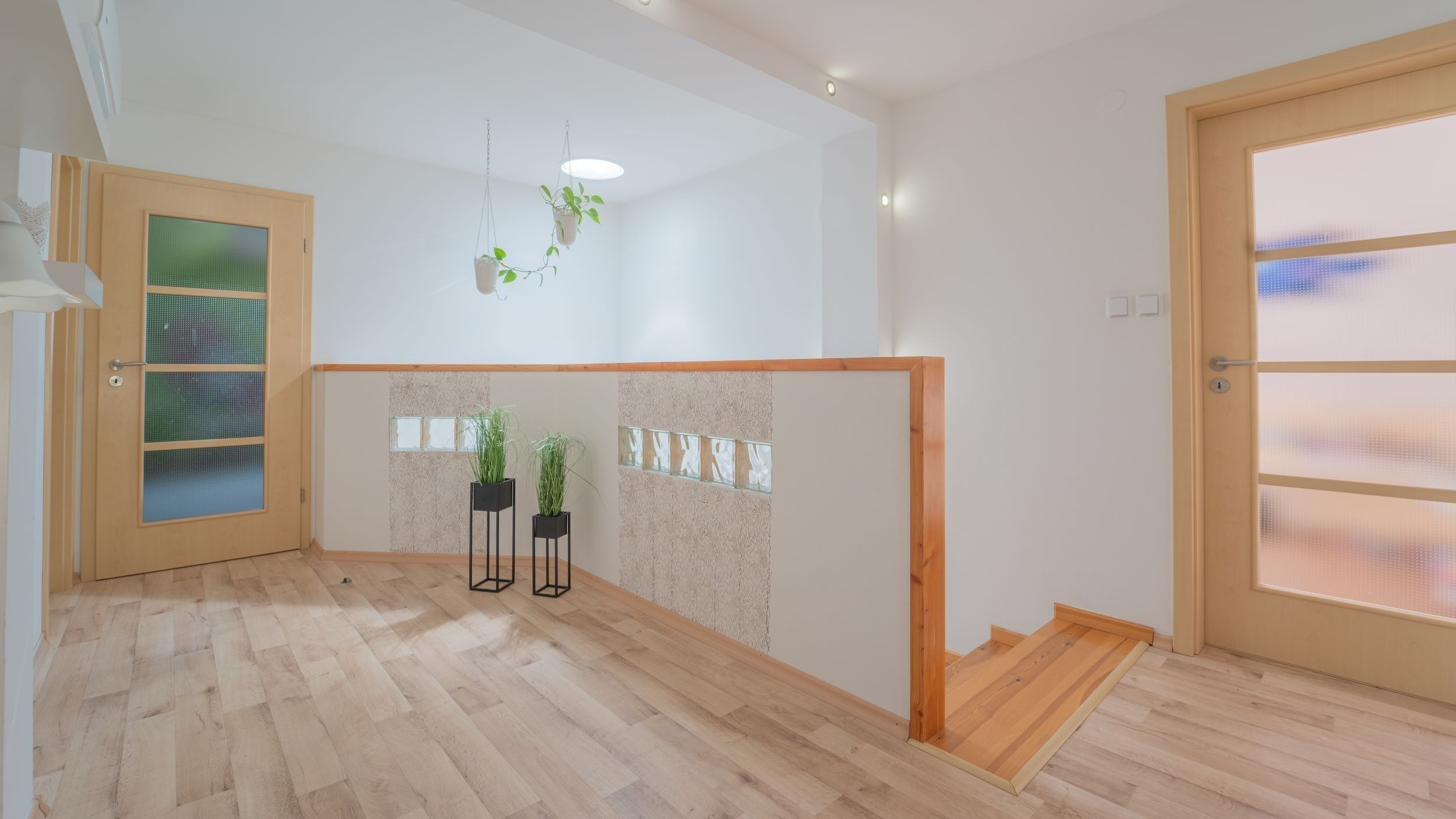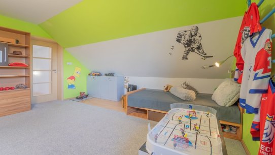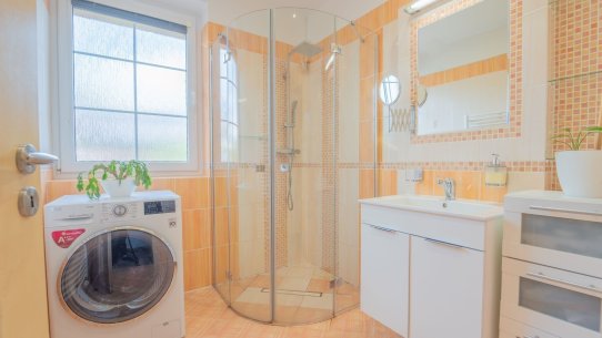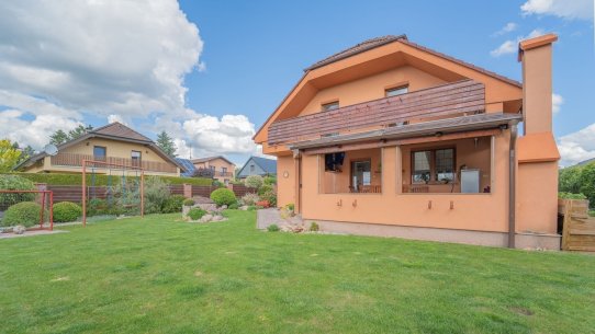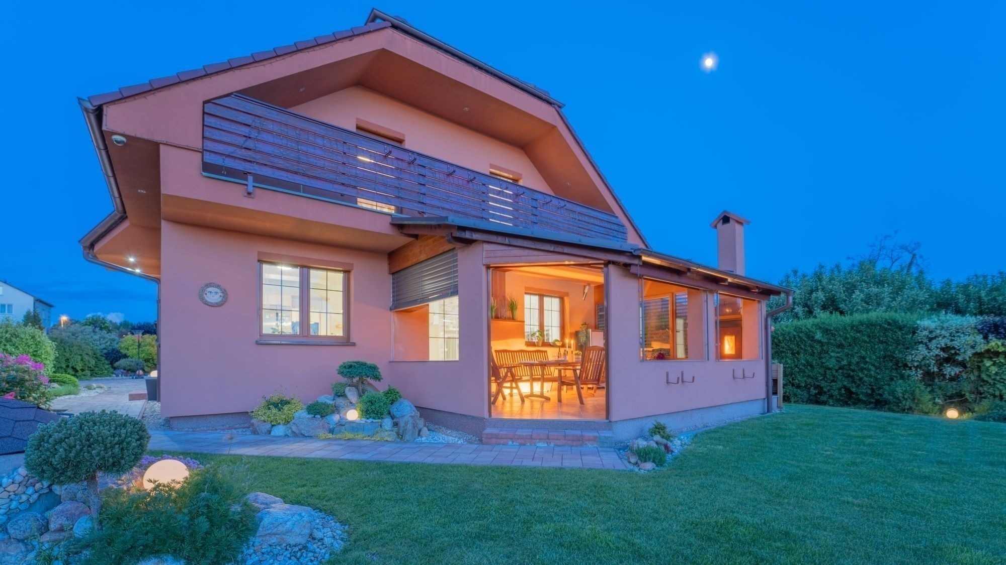 Dům je dvoupatrový, má výměru 250 m2 a dispozici 5+kk. V přízemí je velký obývák s částečně oddělenou kuchyní, pokoj pro hosty, koupelna a toaleta. V klimatizovaném podkroví čekají tři ložnice, dvě šatny, další koupelna, WC a terasa s parádním výhledem.