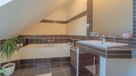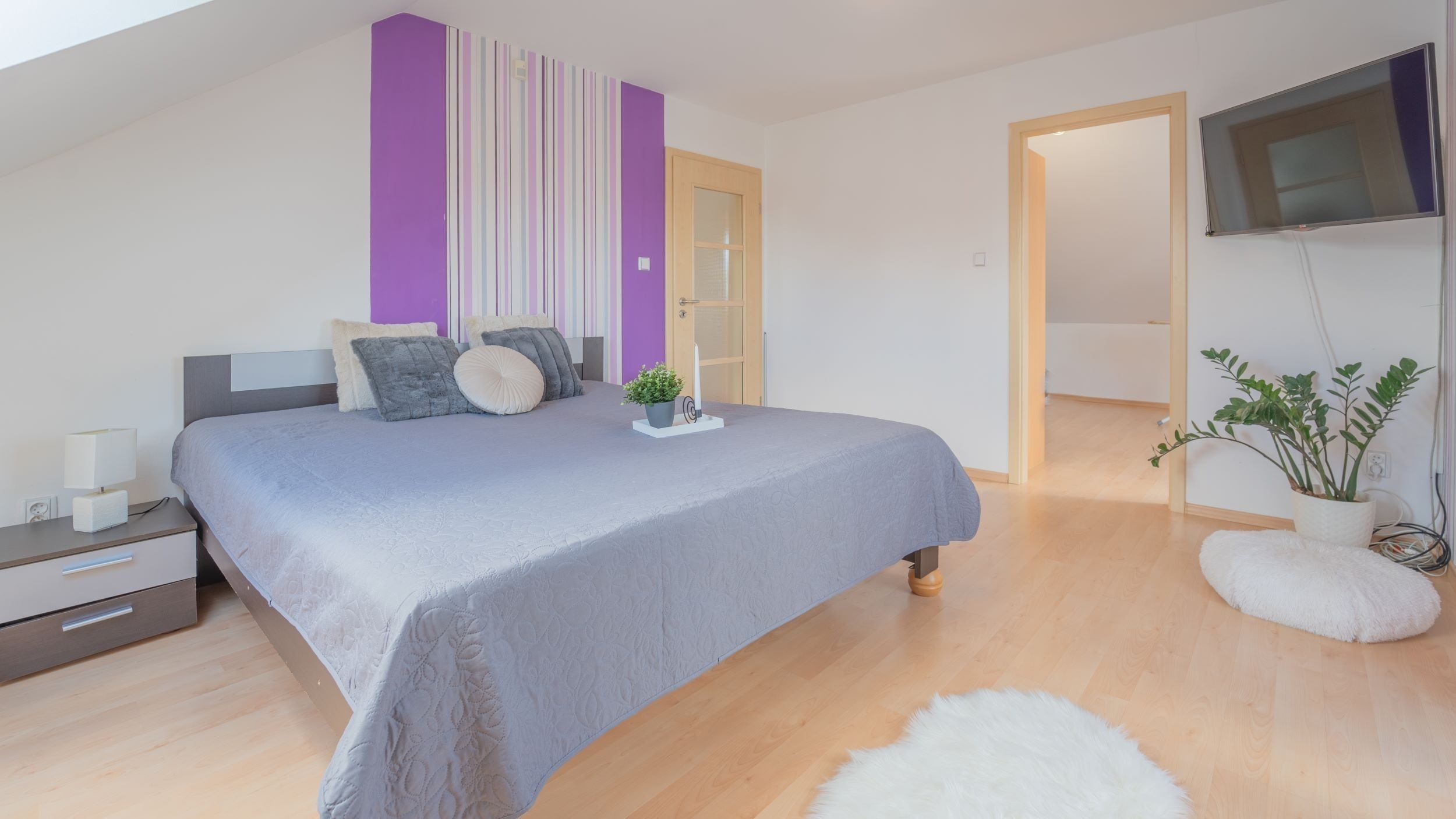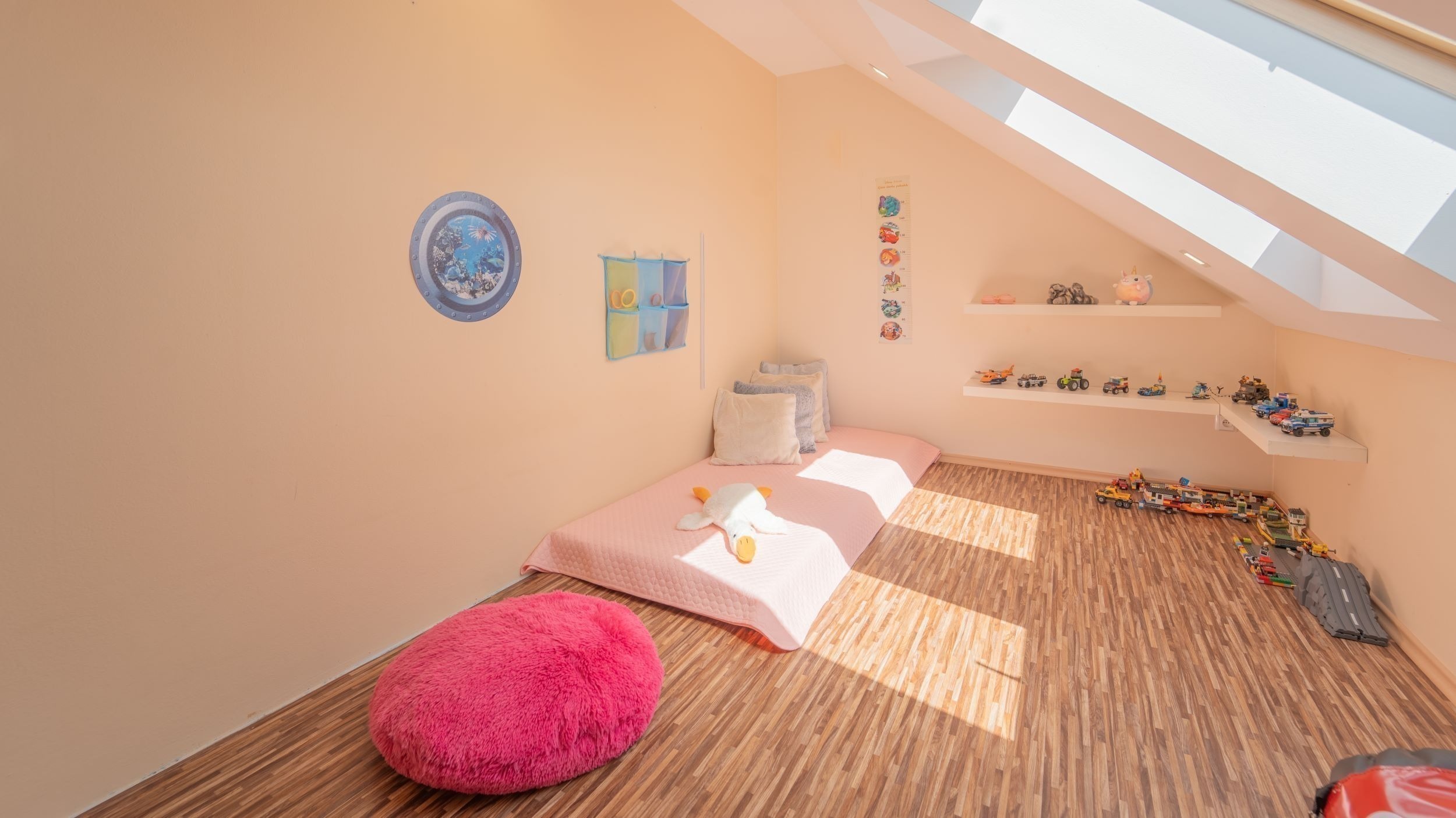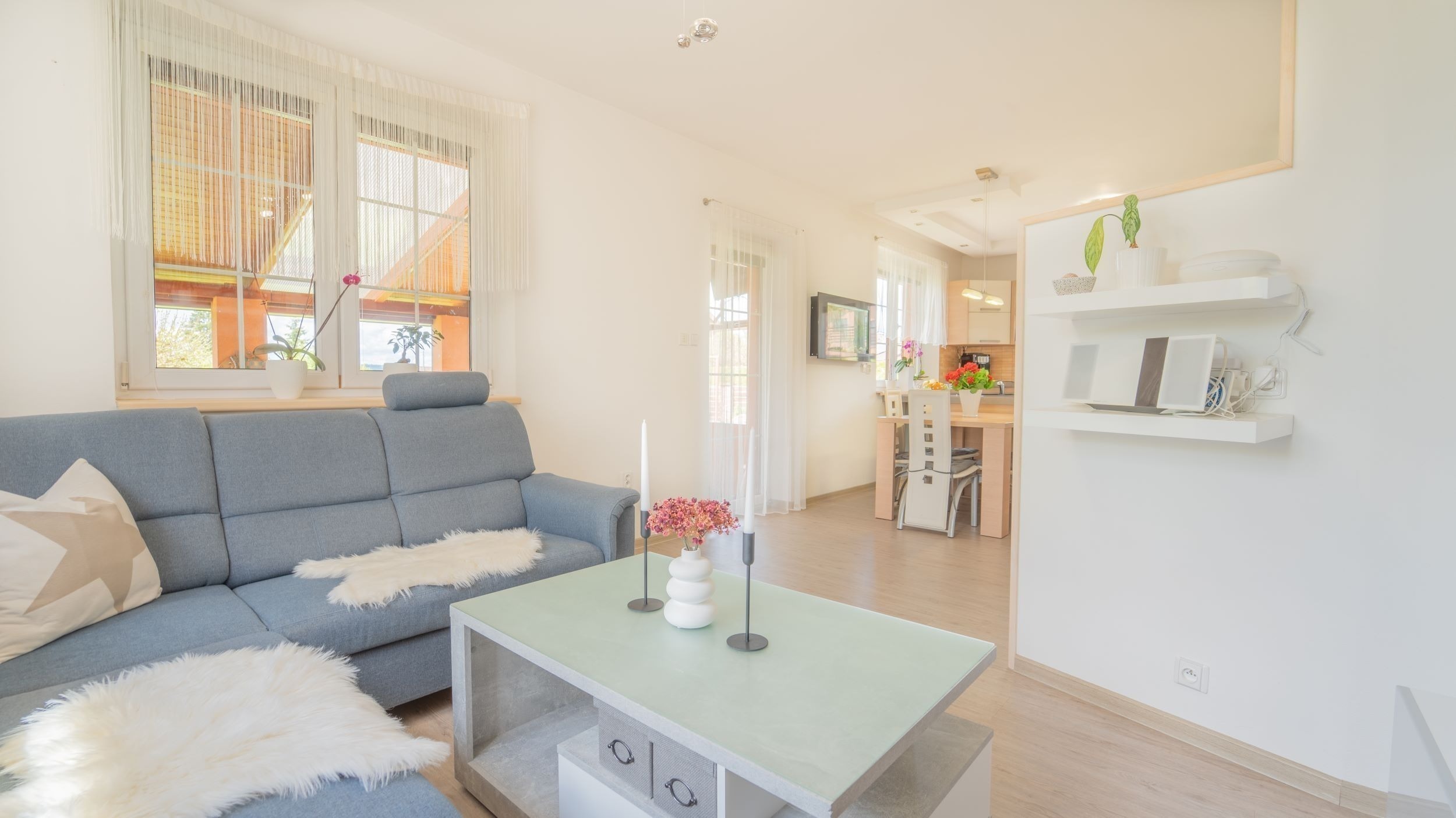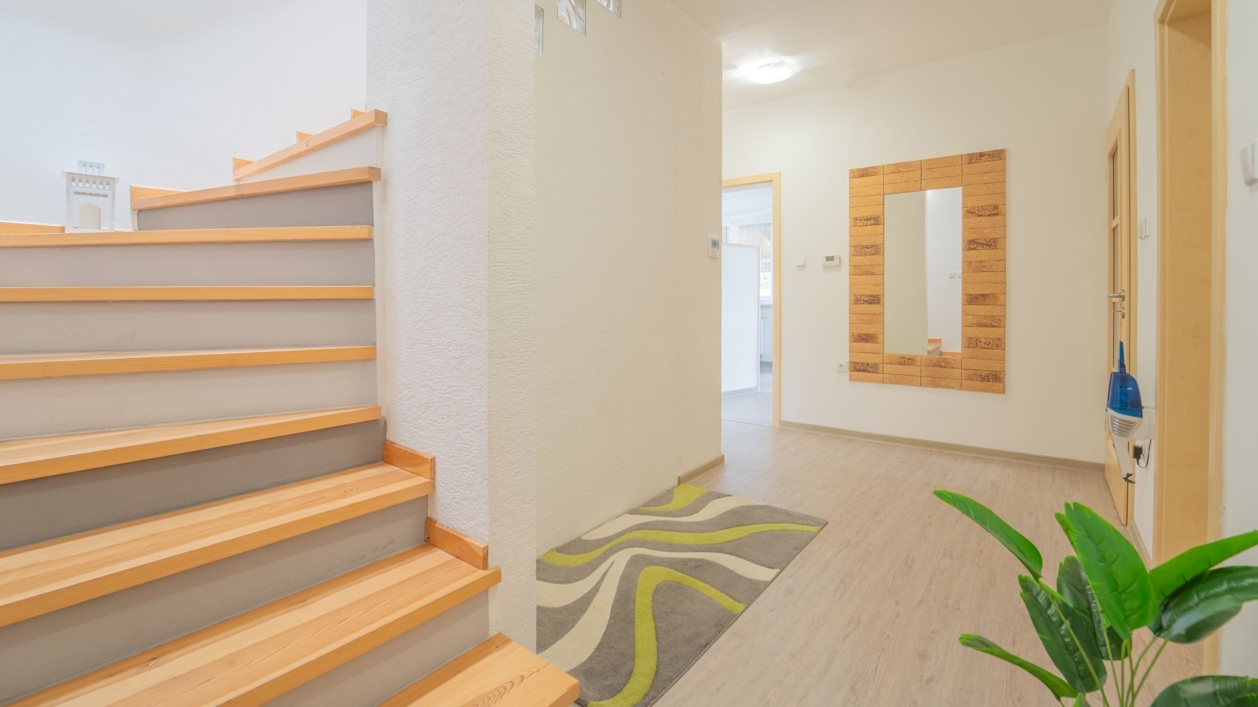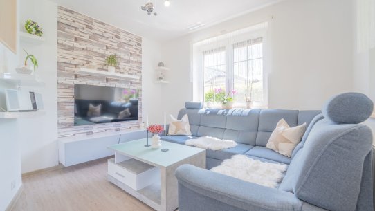 Dům je dvoupatrový, má výměru 250 m2 a dispozici 5+kk. V přízemí je velký obývák s částečně oddělenou kuchyní, pokoj pro hosty, koupelna a toaleta. V klimatizovaném podkroví čekají tři ložnice, dvě šatny, další koupelna, WC a terasa s parádním výhledem.
