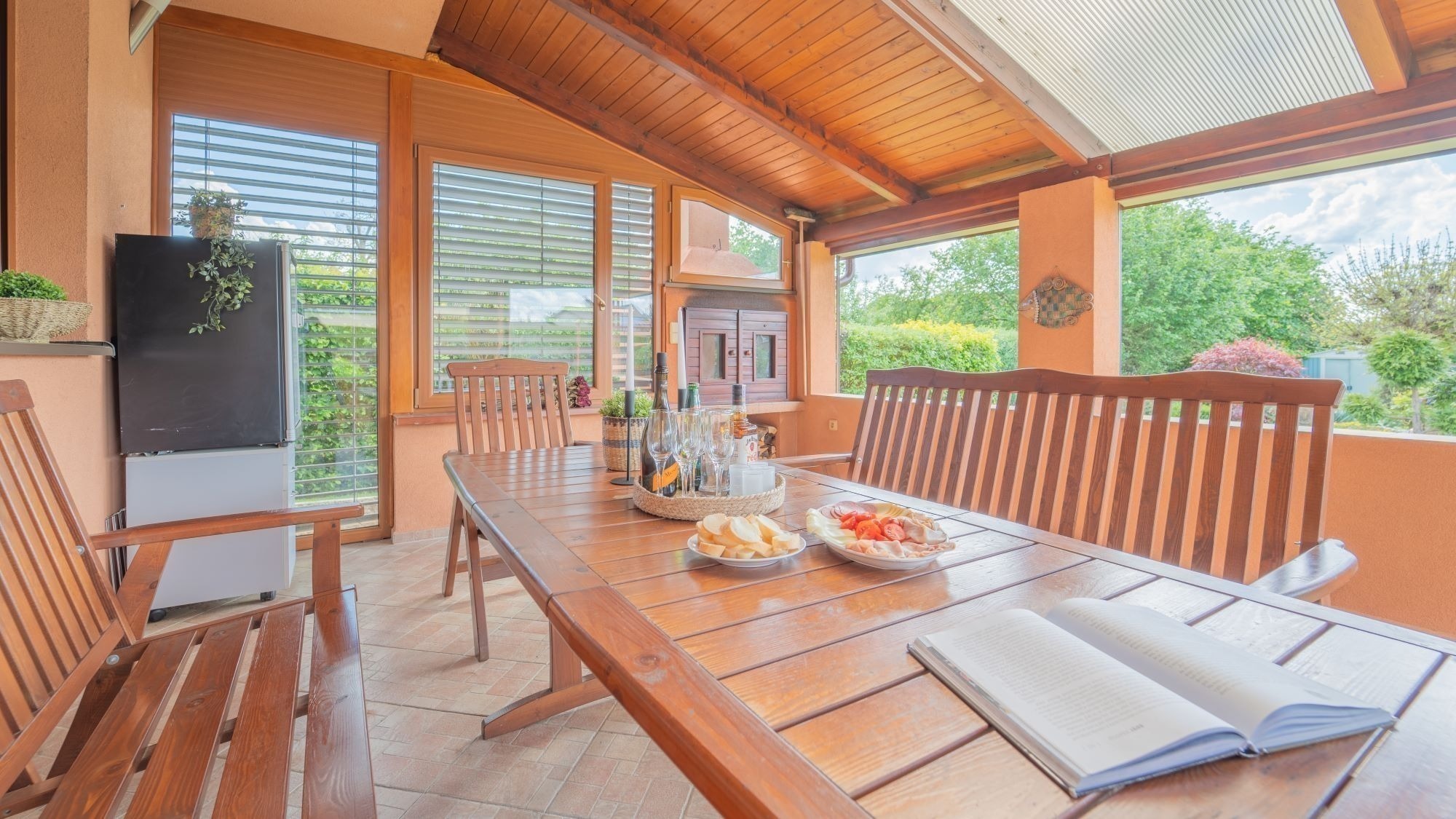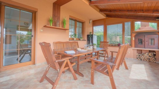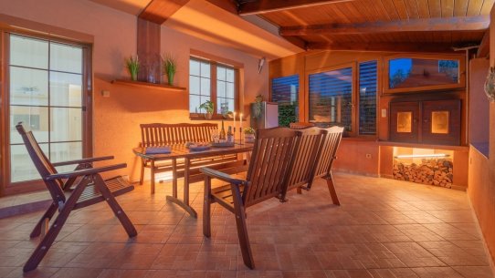 Letní sezónu vám prodlouží krytá terasa. Jakmile se ochladí, stačí ji zavřít a přiložit do krbu. S udírnou! Chtělo by to ještě nějaký ten koutek na relax? Tak to stačí přestavět zděný kotec na saunu. Rozvody jsou už nachystané.