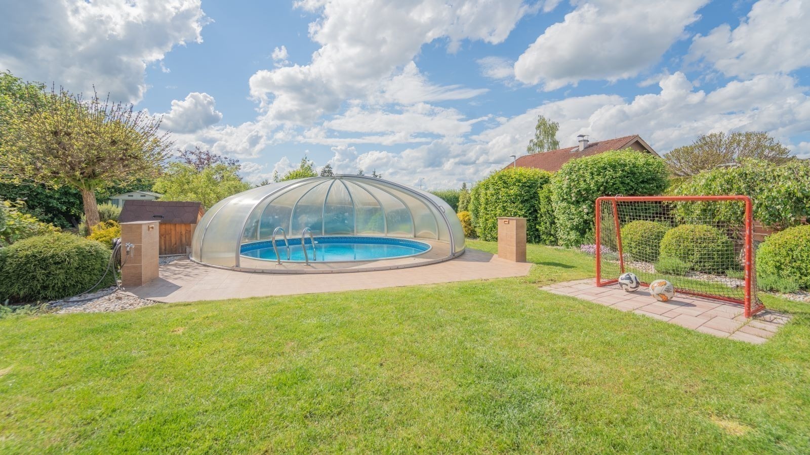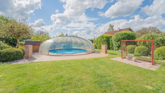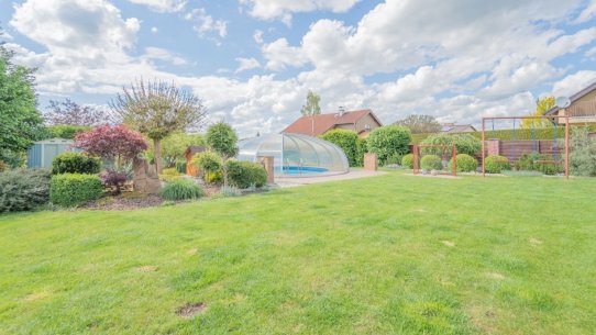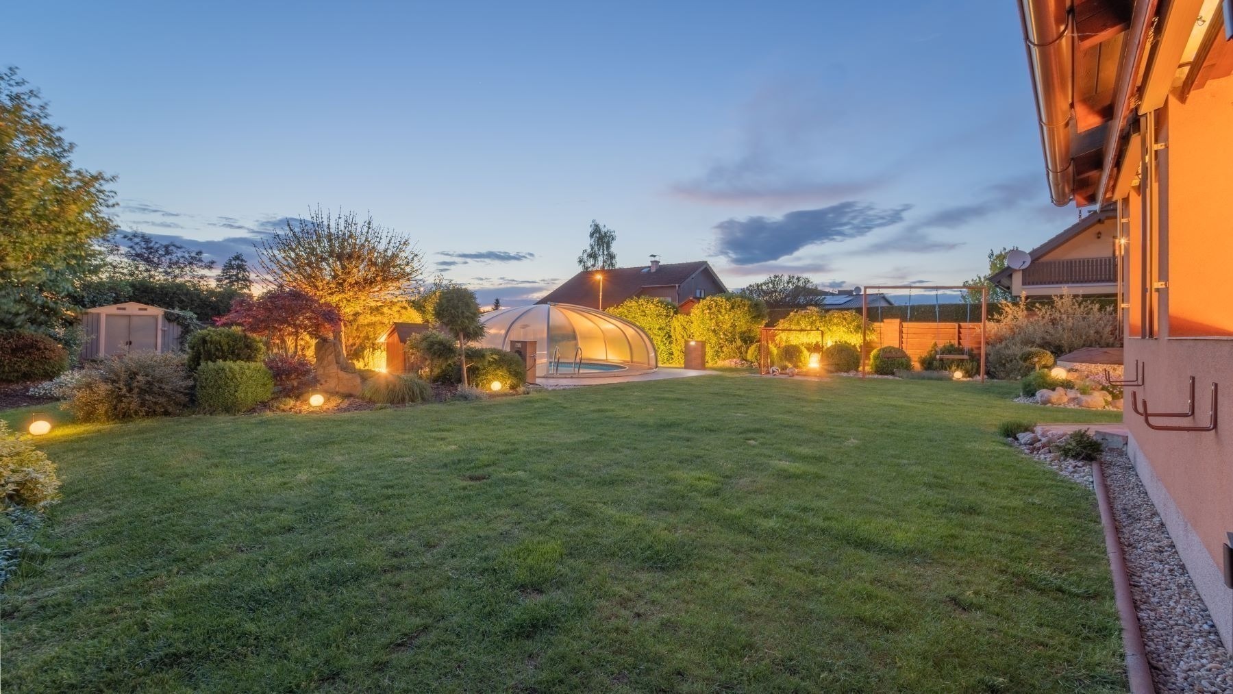 Na pozemku o velikosti 1 000 m2 je zahrada, na zahradě bazén a v bazéně… nekonečná pohoda. Kromě toho jsou tu okrasné keře, ovocné stromy, záhonky i minipařeniště – zkrátka vše pro léto plné šťavnatého ovoce.