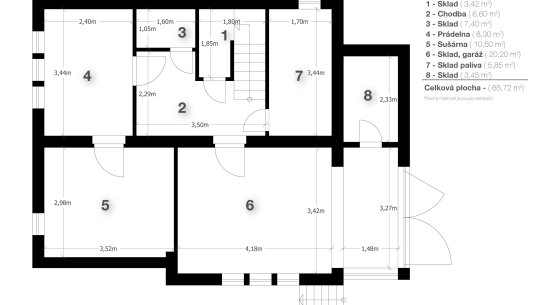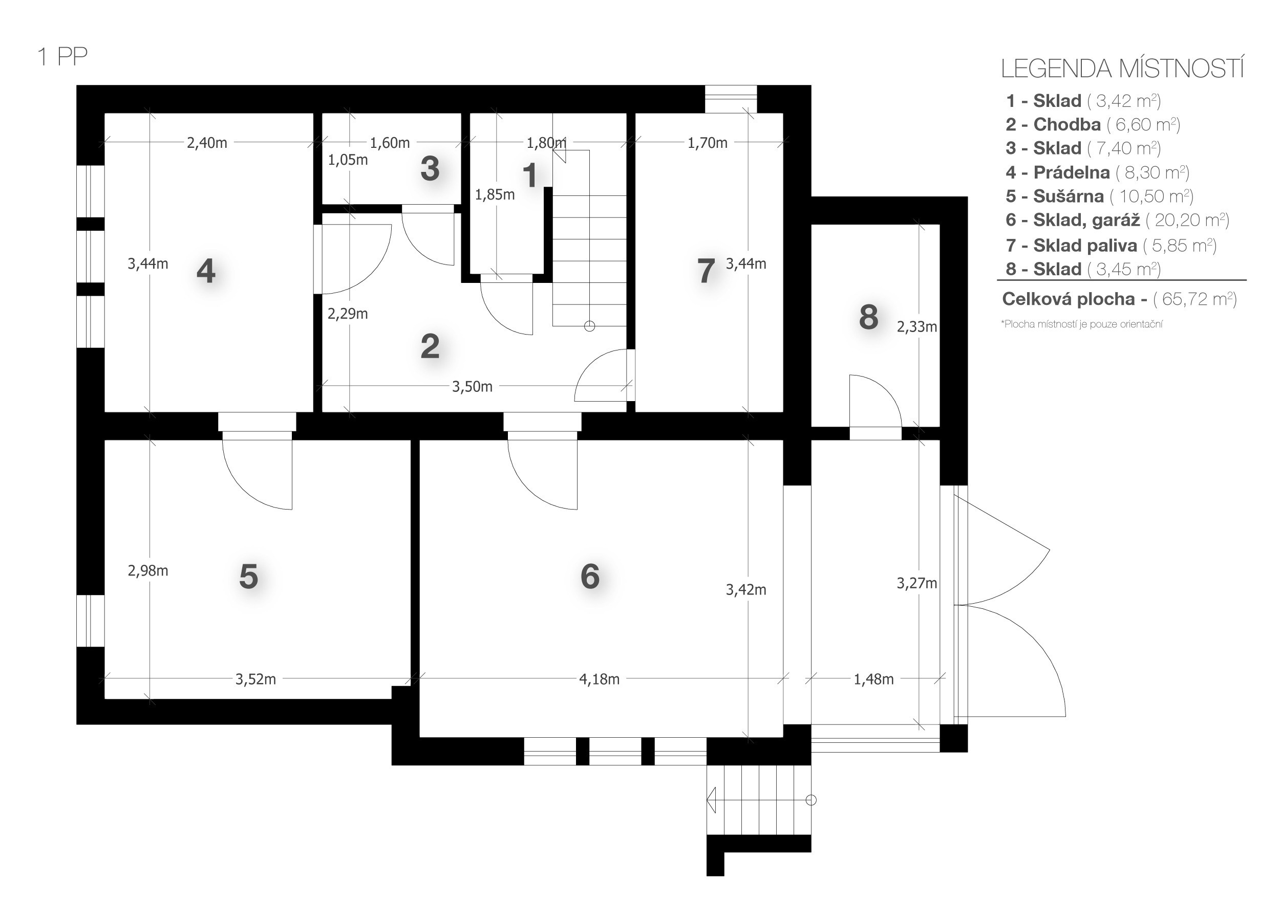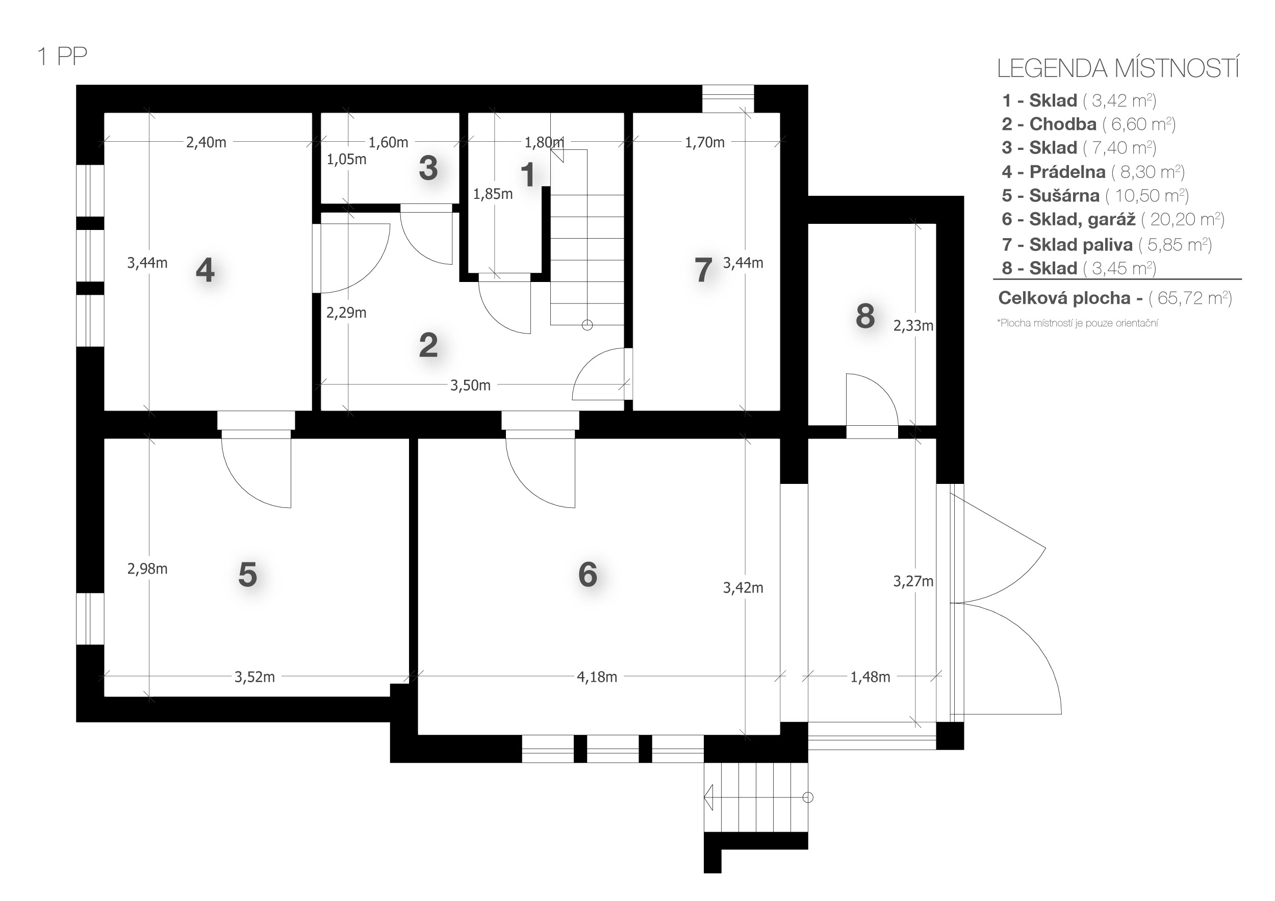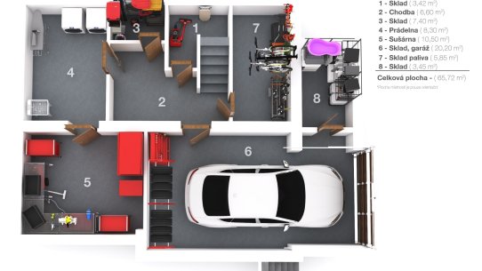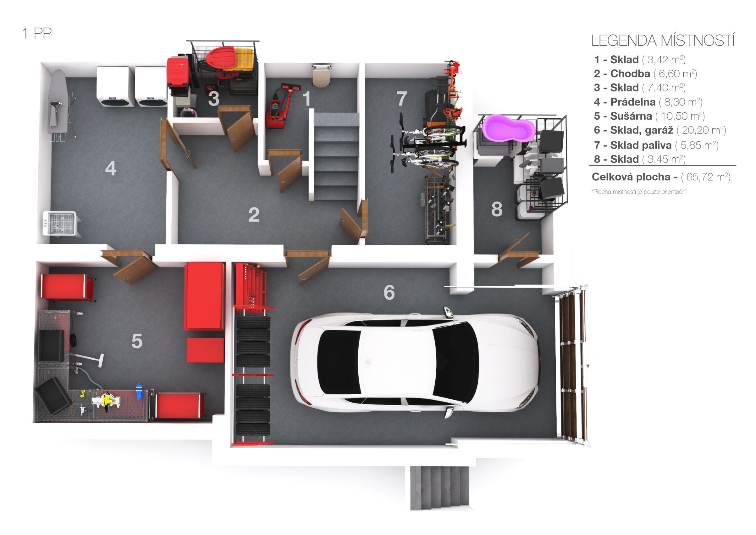 V suterénu je garáž, kde zaparkujete a uložíte nářadí nebo sportovní vybavení. Jsou tu také technické místnosti – prádelna, sušárna a kotelna se skladem na palivo.
