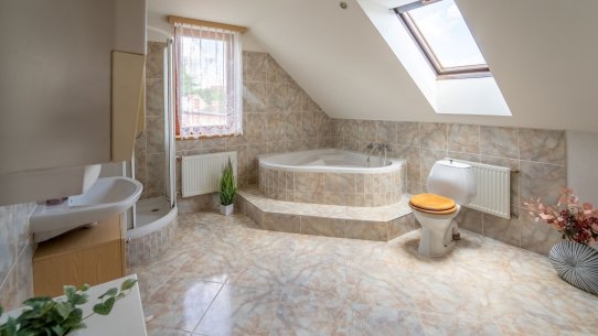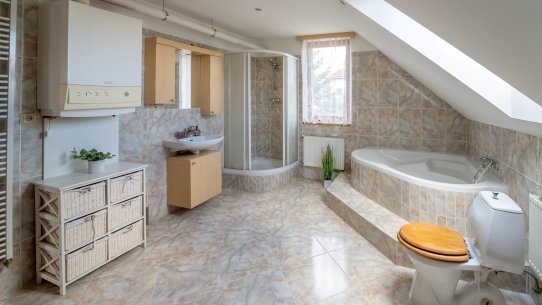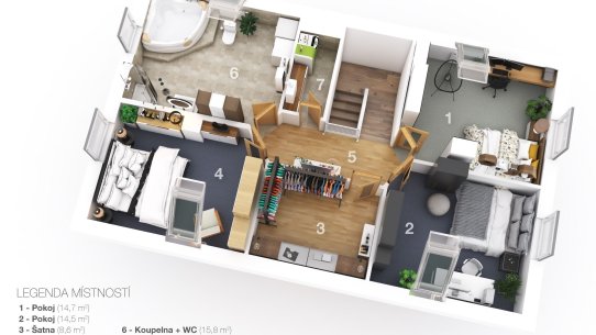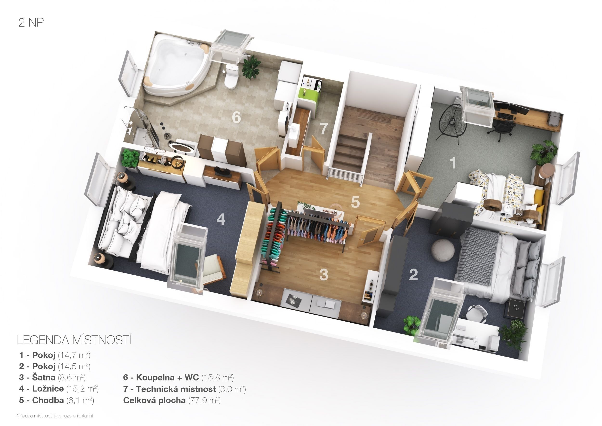 Po schodišti vyjdete nahoru do patra, kde čekají tři ložnice a jedna obrovská šatna. Ve velké koupelně je rohová vana, sprchový kout i WC. Na chodbě je technická místnost s přípravou na maximální využití FVE.