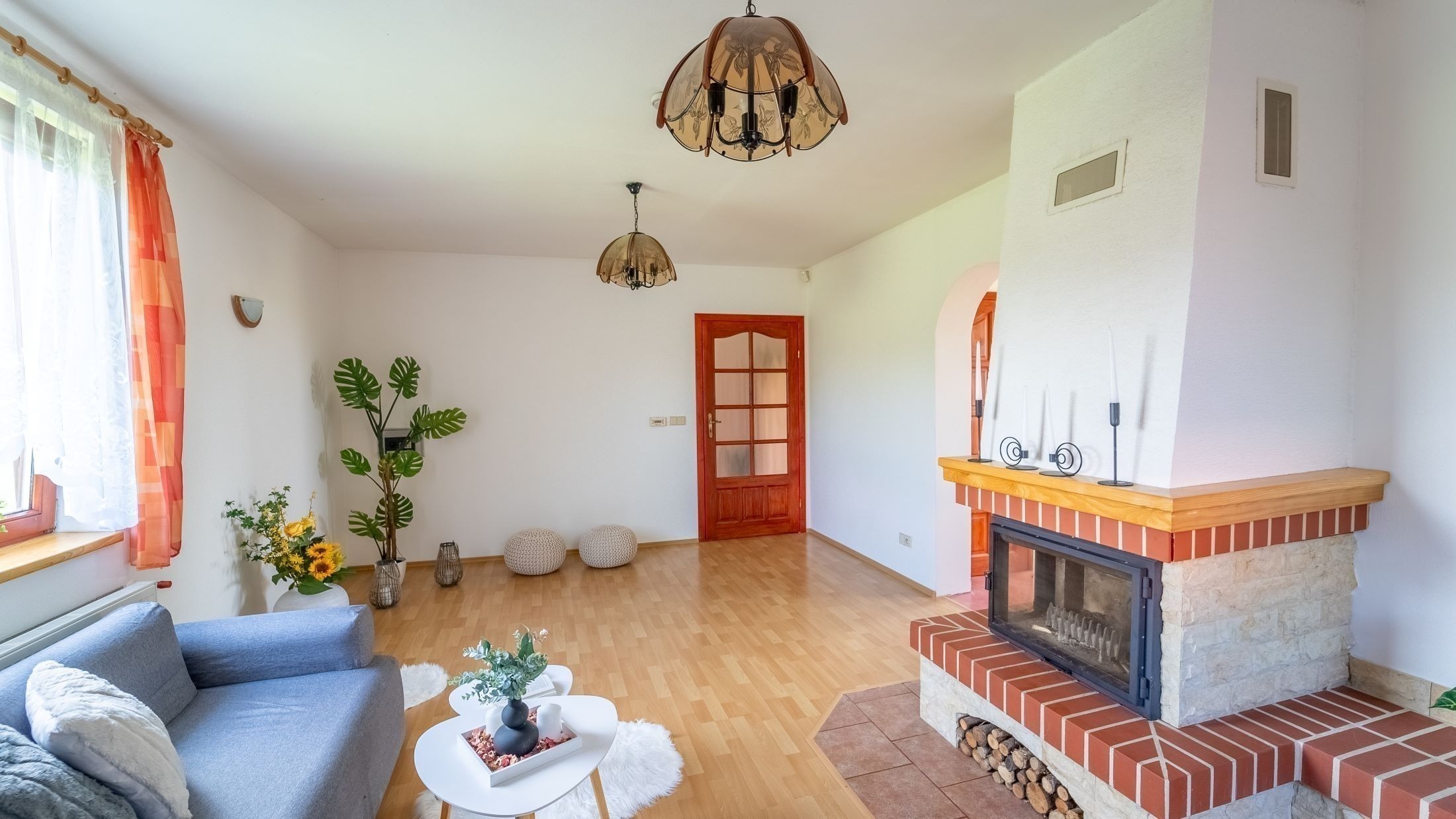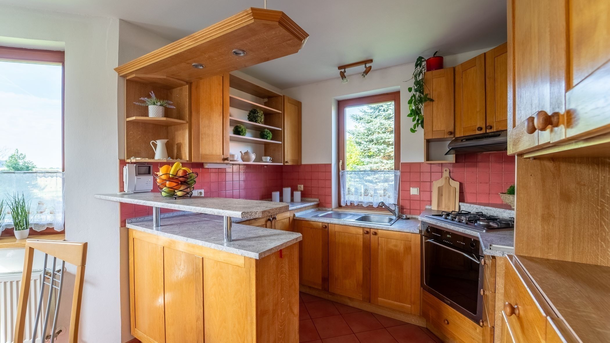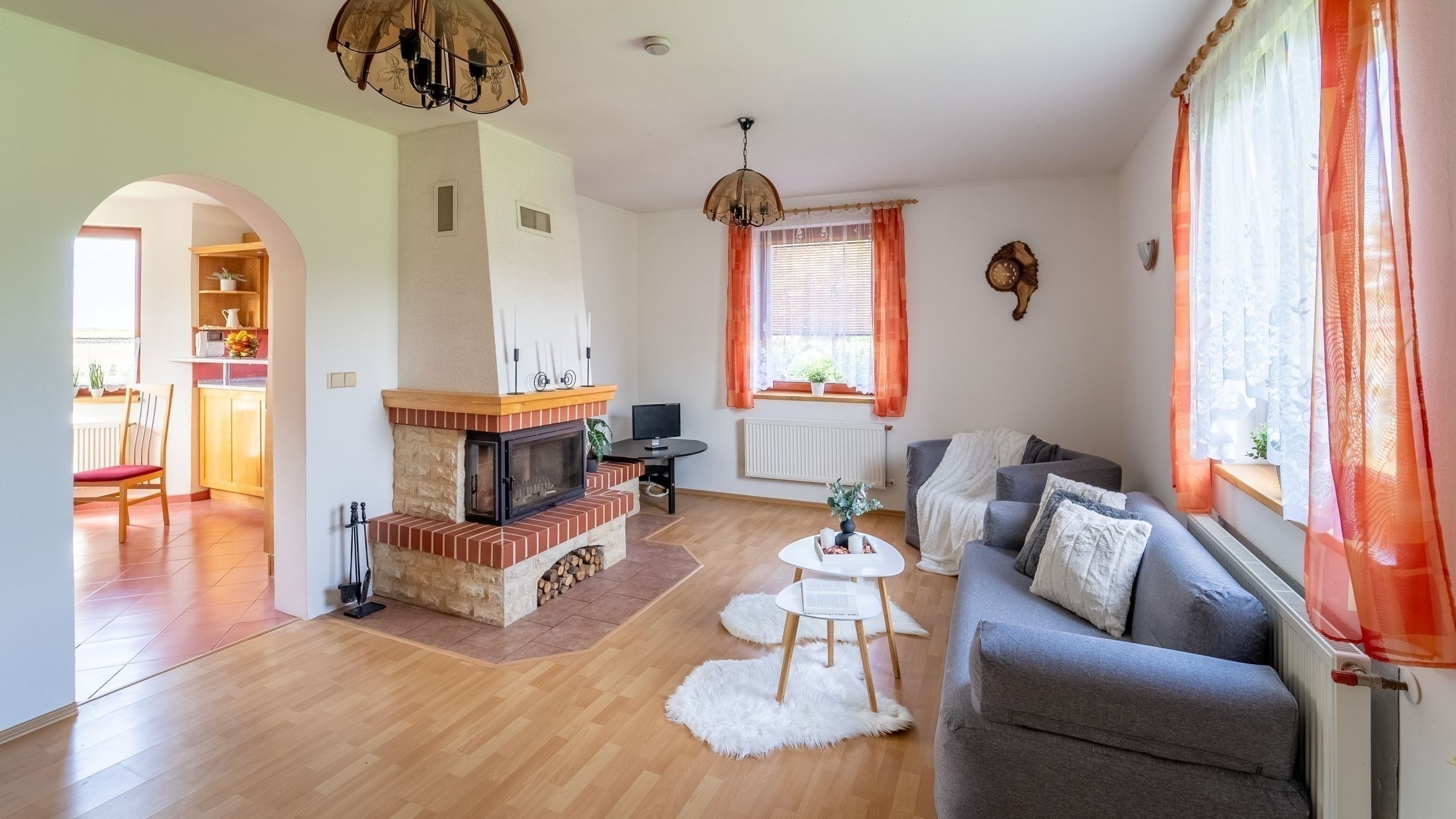 Srdcem domu je obývák s výměrou 23 m² a krásným tradičním krbem. Ten vás zahřeje a zpříjemní nejeden zimní večer. Snídani, oběd i večeři si připravíte v kuchyni hned vedle. A s krásným výhledem do zeleně vám bude chutnat ještě lépe.