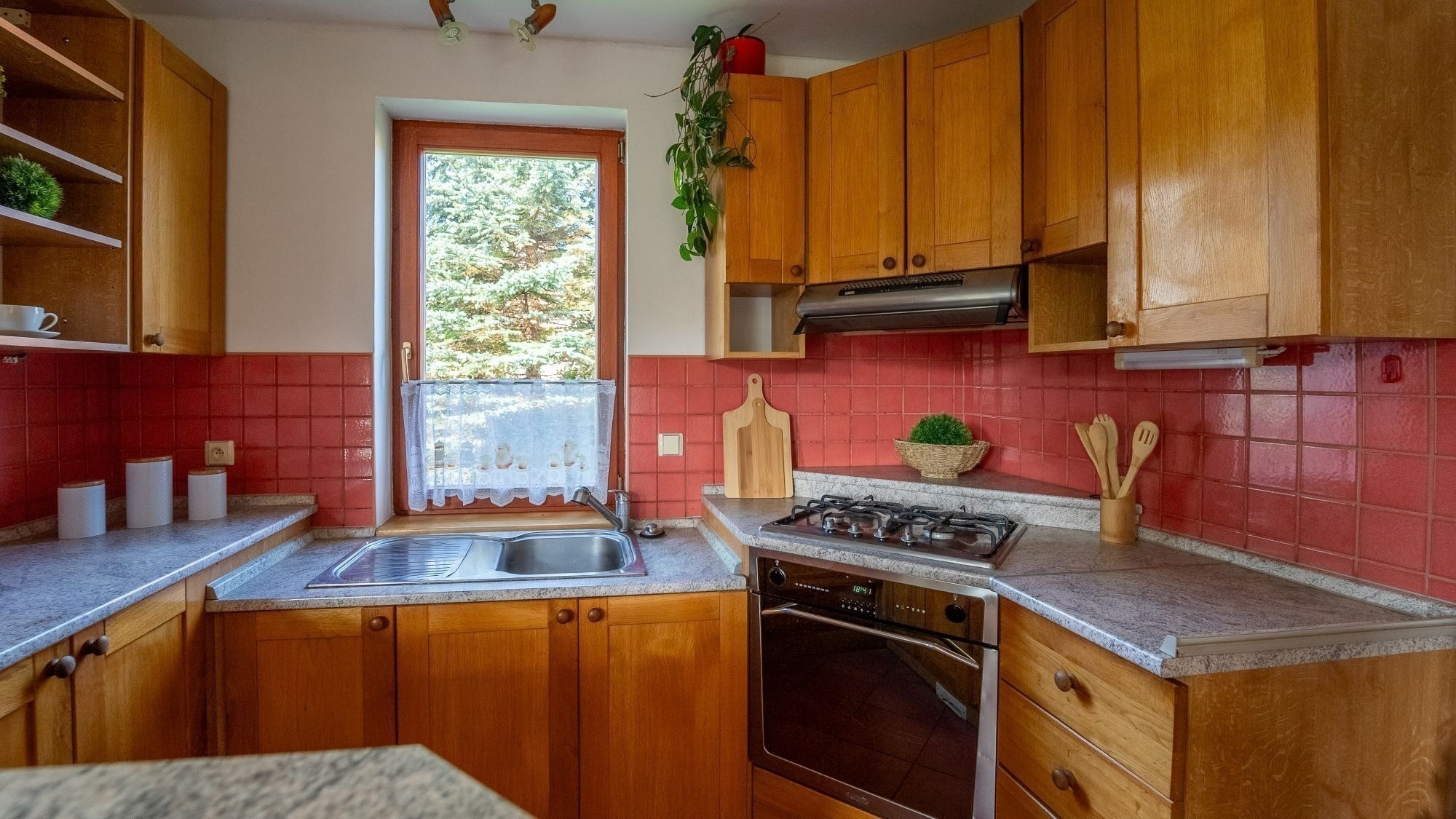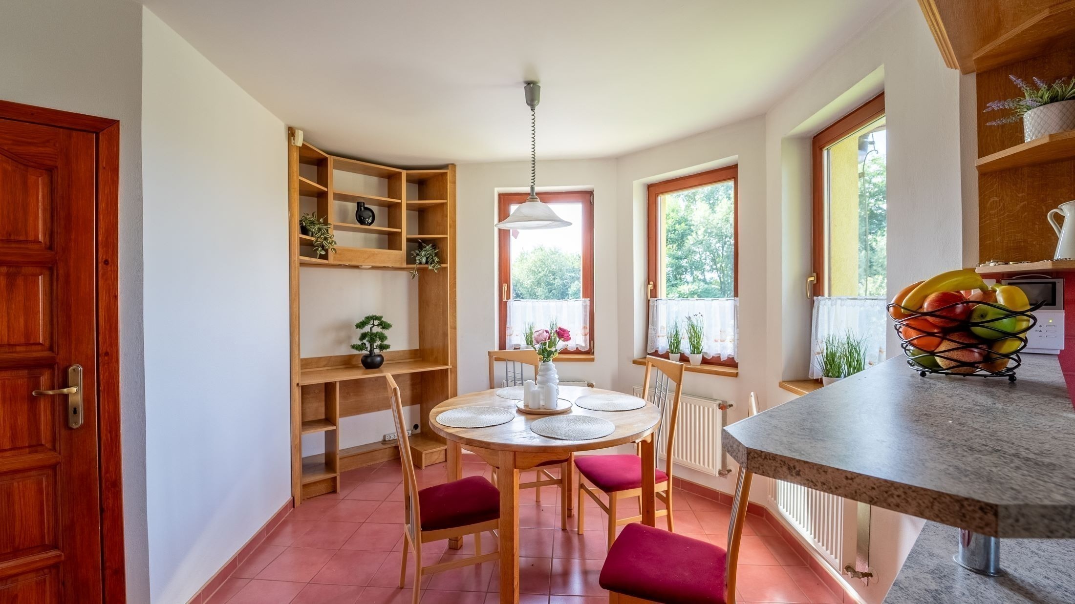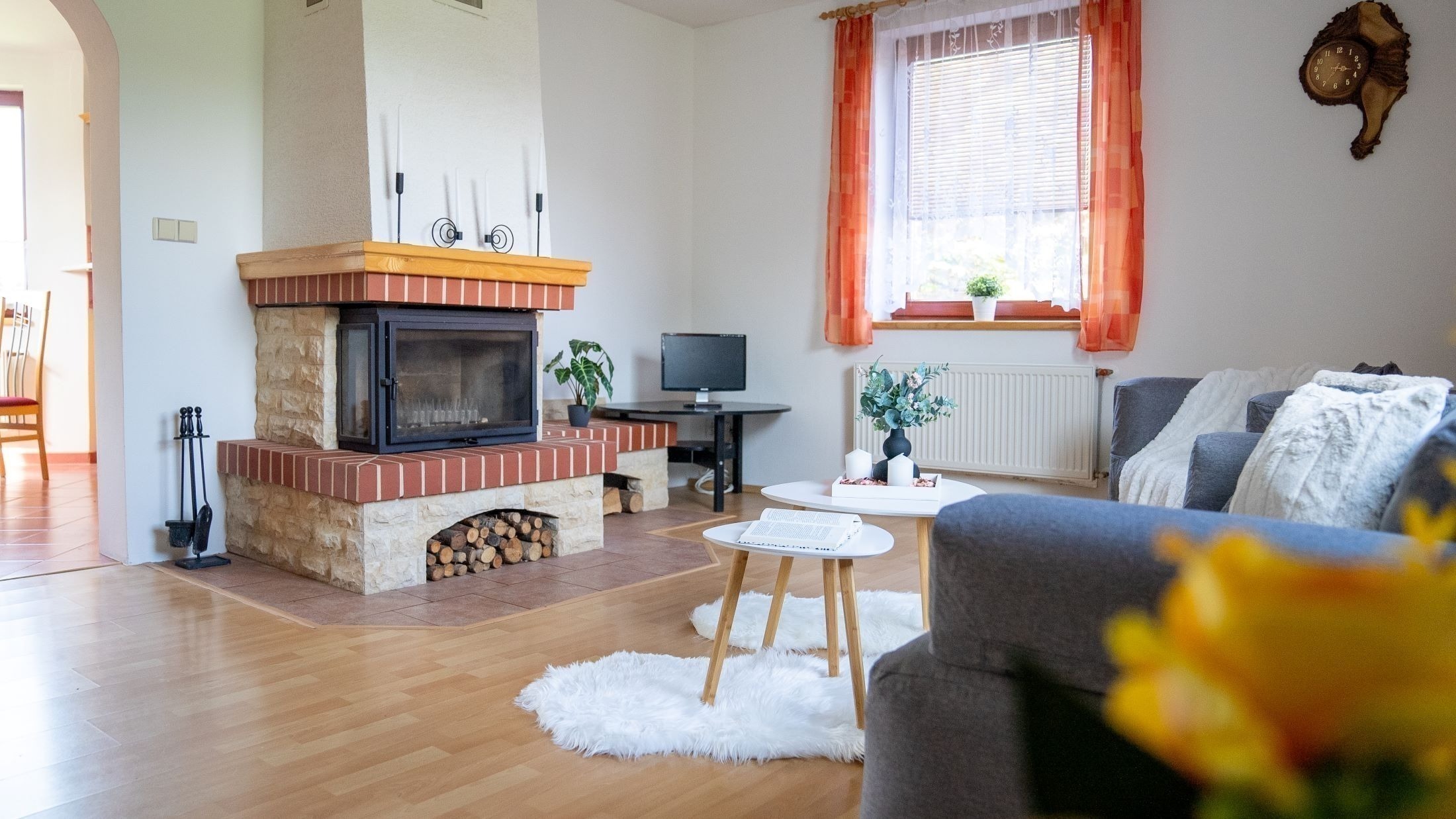 Srdcem domu je obývák s výměrou 23 m² a krásným tradičním krbem. Ten vás zahřeje a zpříjemní nejeden zimní večer. Snídani, oběd i večeři si připravíte v kuchyni hned vedle. A s krásným výhledem do zeleně vám bude chutnat ještě lépe.