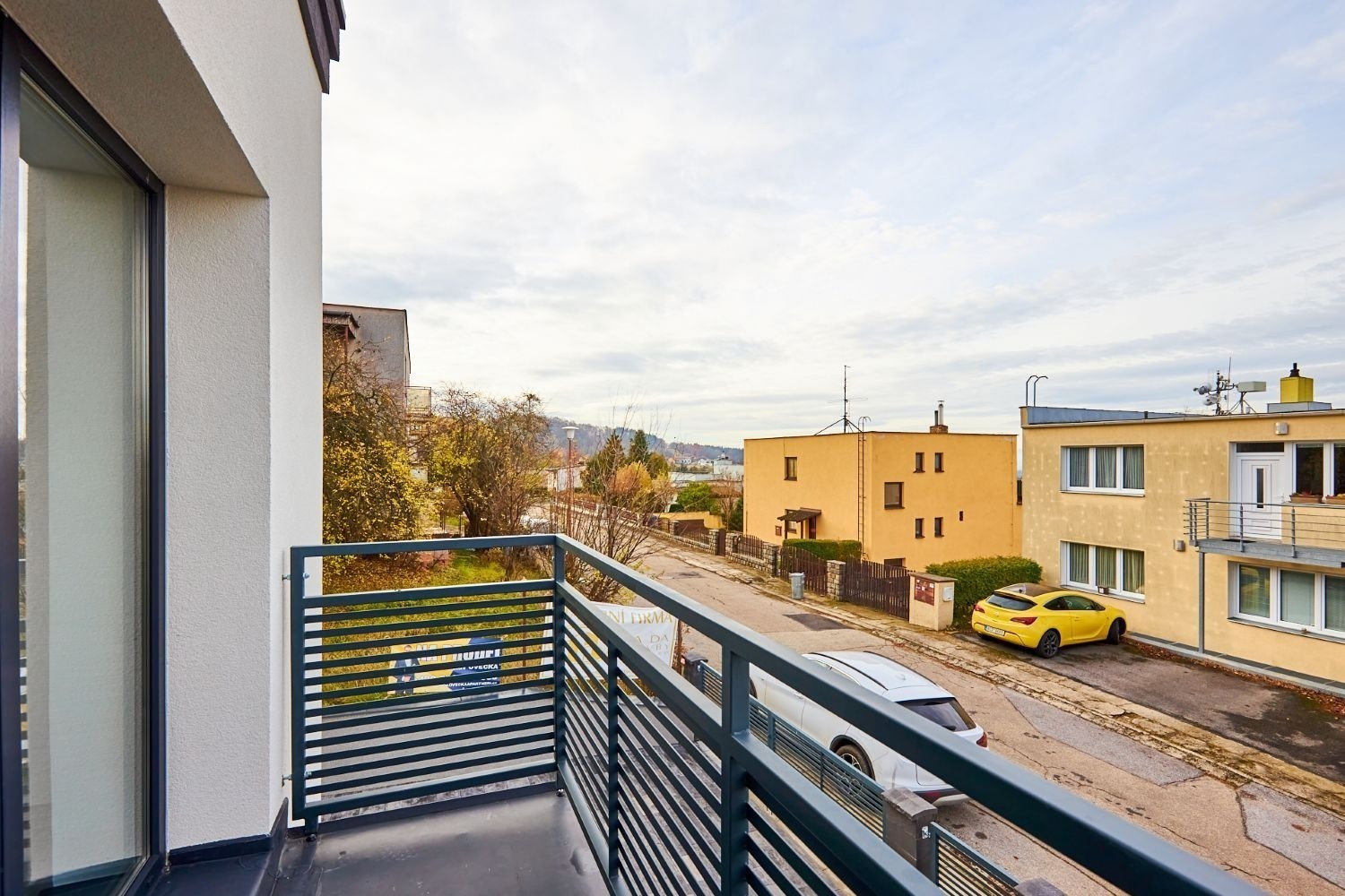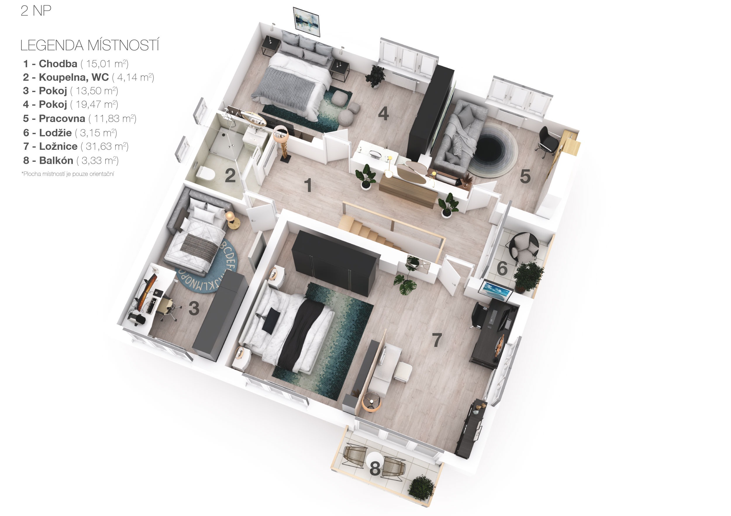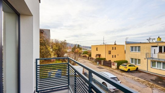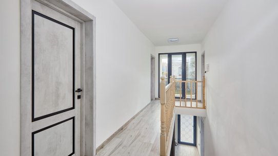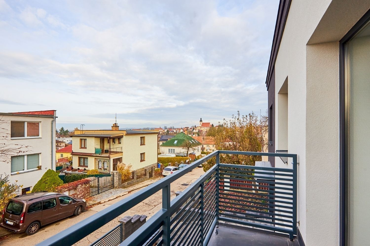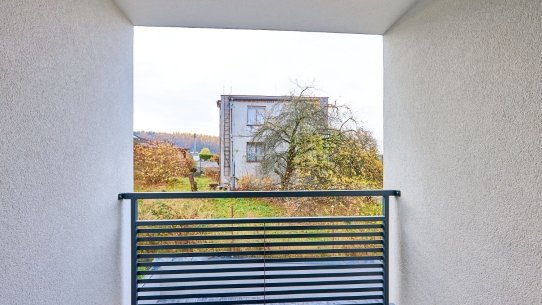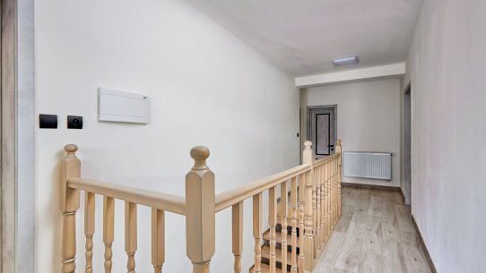 Po schodech vystoupáte do patra, kde na vás čeká prostorná chodba s lodžií a čtyři pokoje. Největší z nich má vlastní balkon s nádherným výhledem na celé České Budějovice.