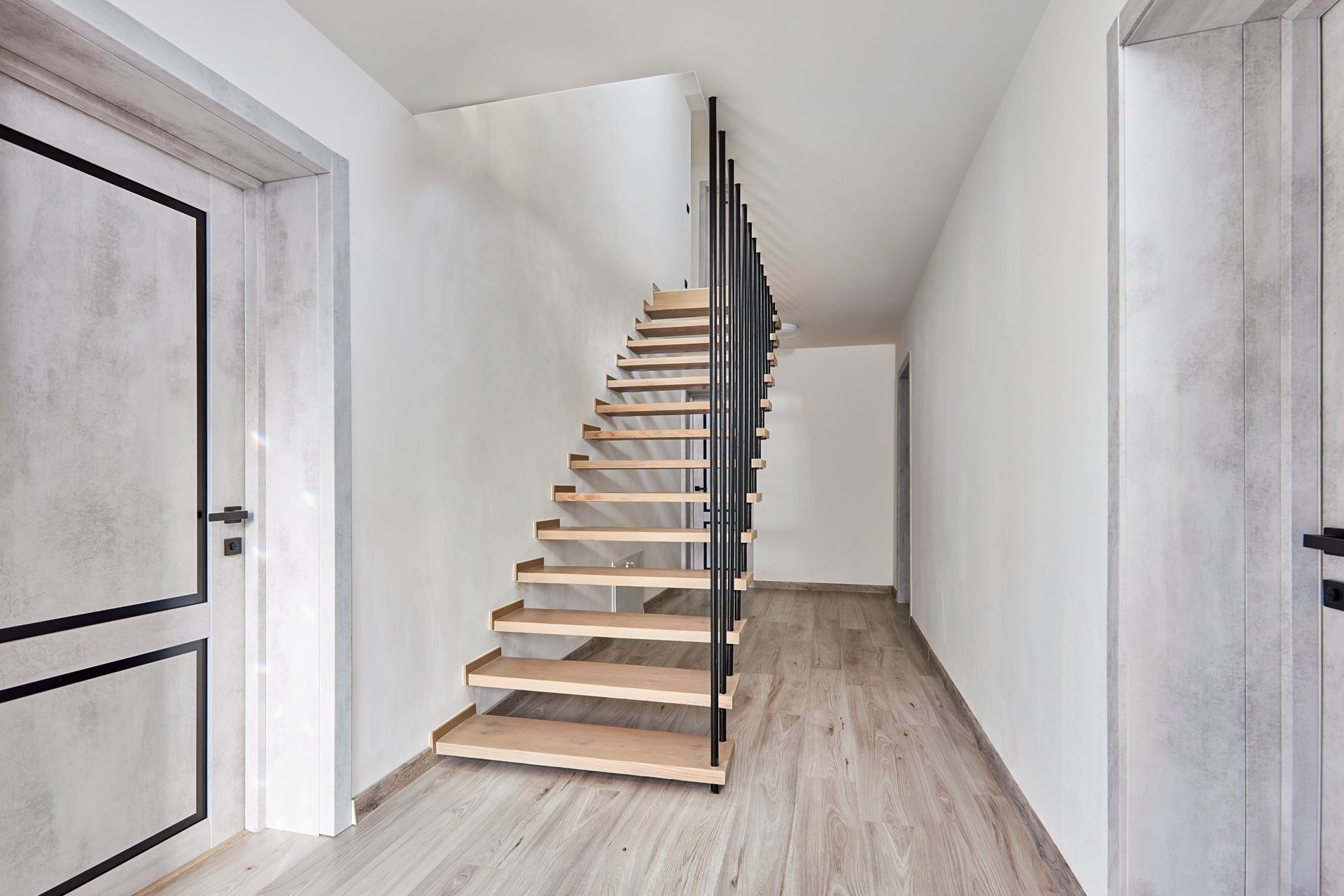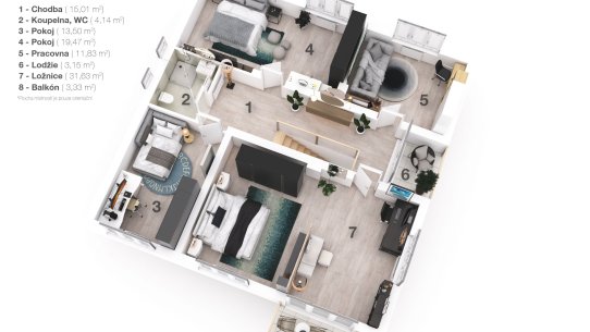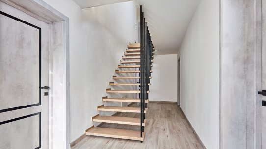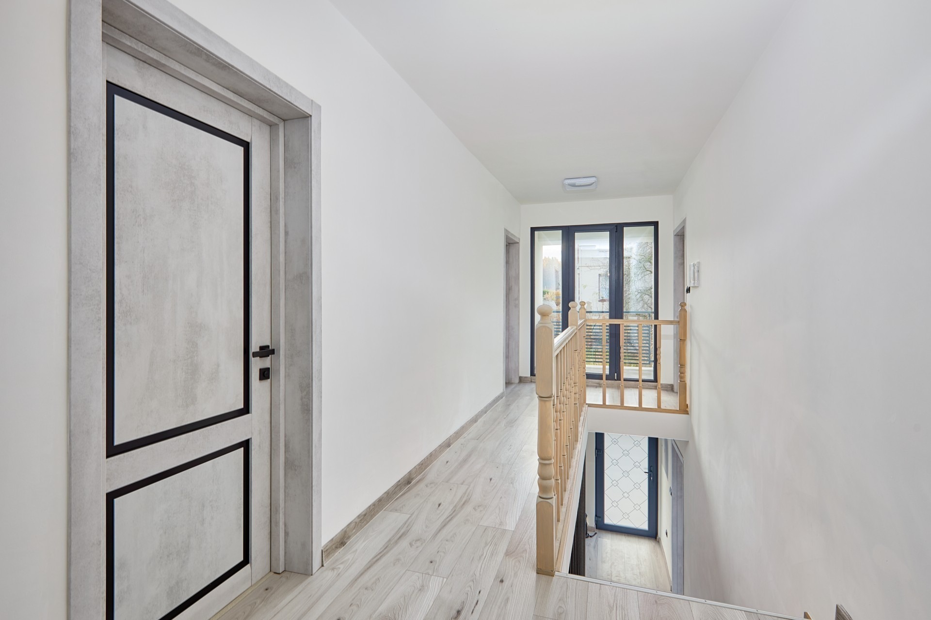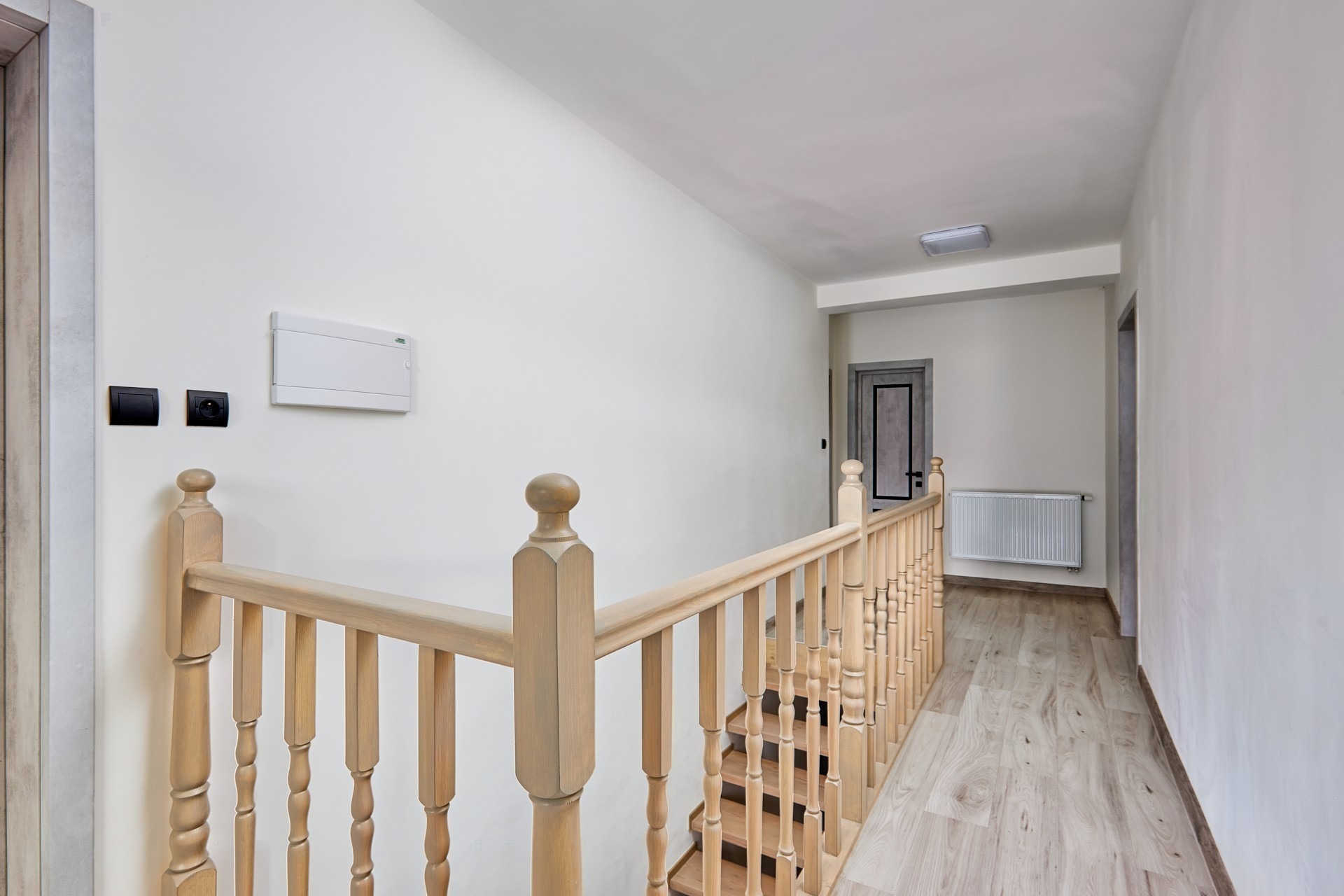 Po schodech vystoupáte do patra, kde na vás čeká prostorná chodba s lodžií a čtyři pokoje. Největší z nich má vlastní balkon s nádherným výhledem na celé České Budějovice.