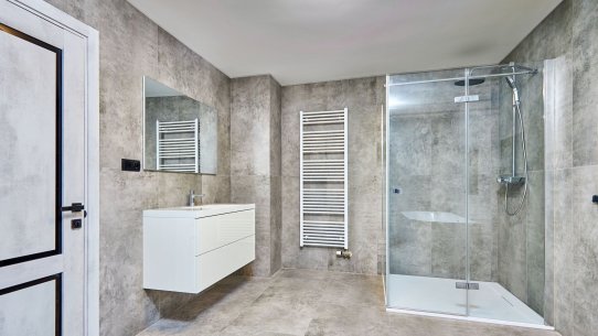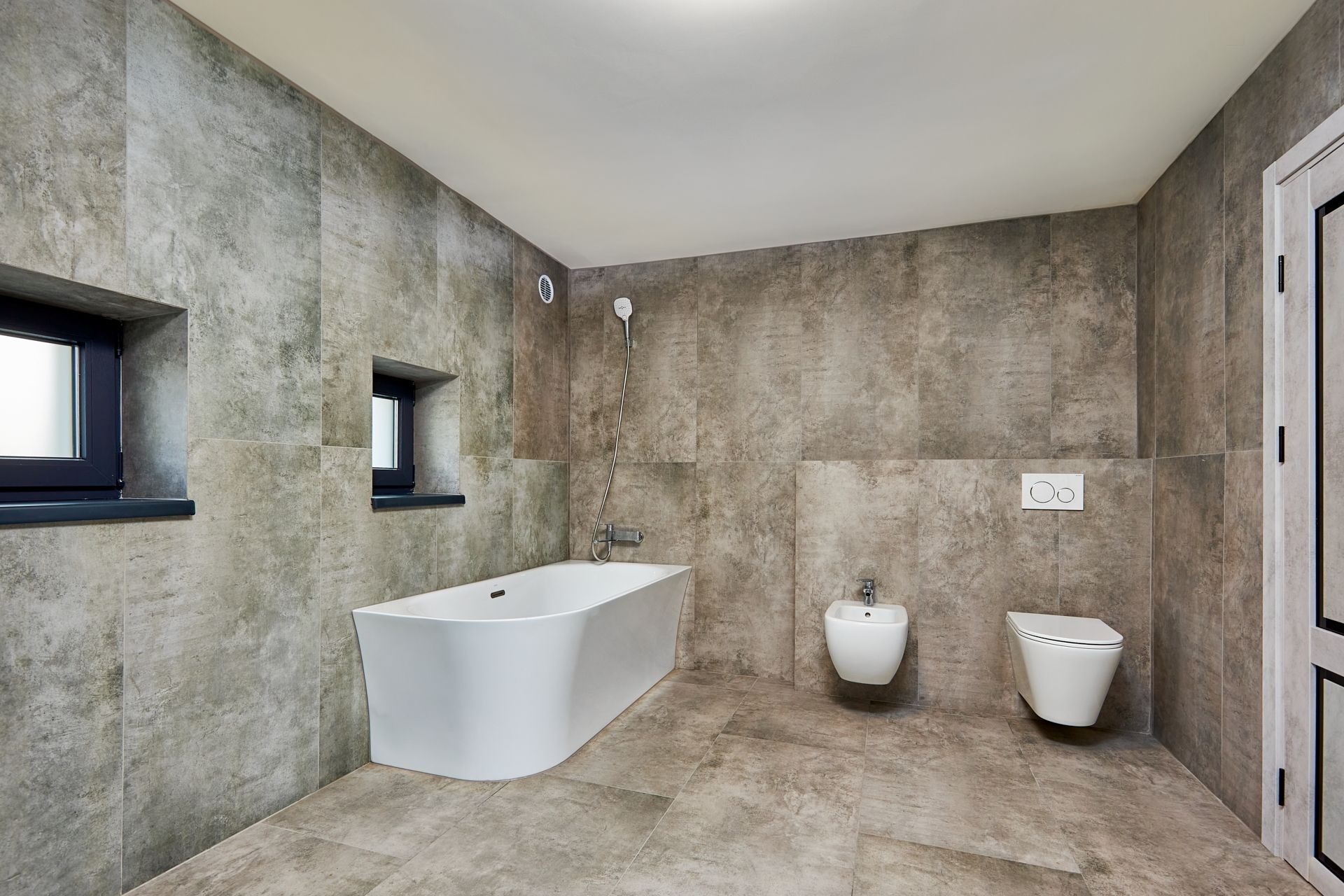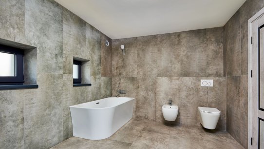 Koupelny jsou tu dvě, takže se ráno nebudete tlačit u umyvadla. V přízemí je velká koupelna se sprchovým koutem, vanou, toaletou i bidetem a v patře druhá menší se sprchou a WC.