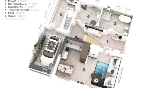 Dům má dvě patra, dispozici 5+kk a jeho velikost je 180 m². V přízemí je obývací pokoj s kuchyní a koupelna. V patře jsou čtyři pokoje a druhá koupelna. K domu patří velká garáž a technická místnost se skladem.