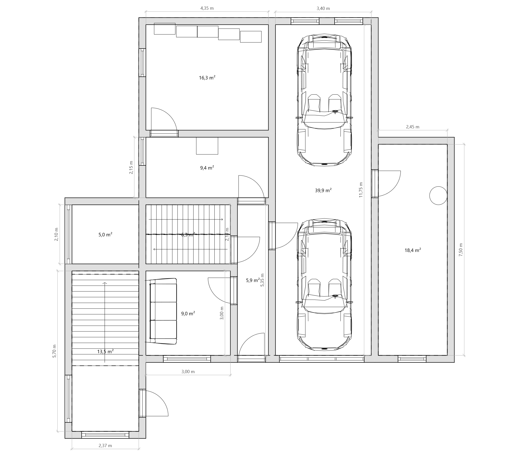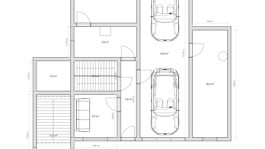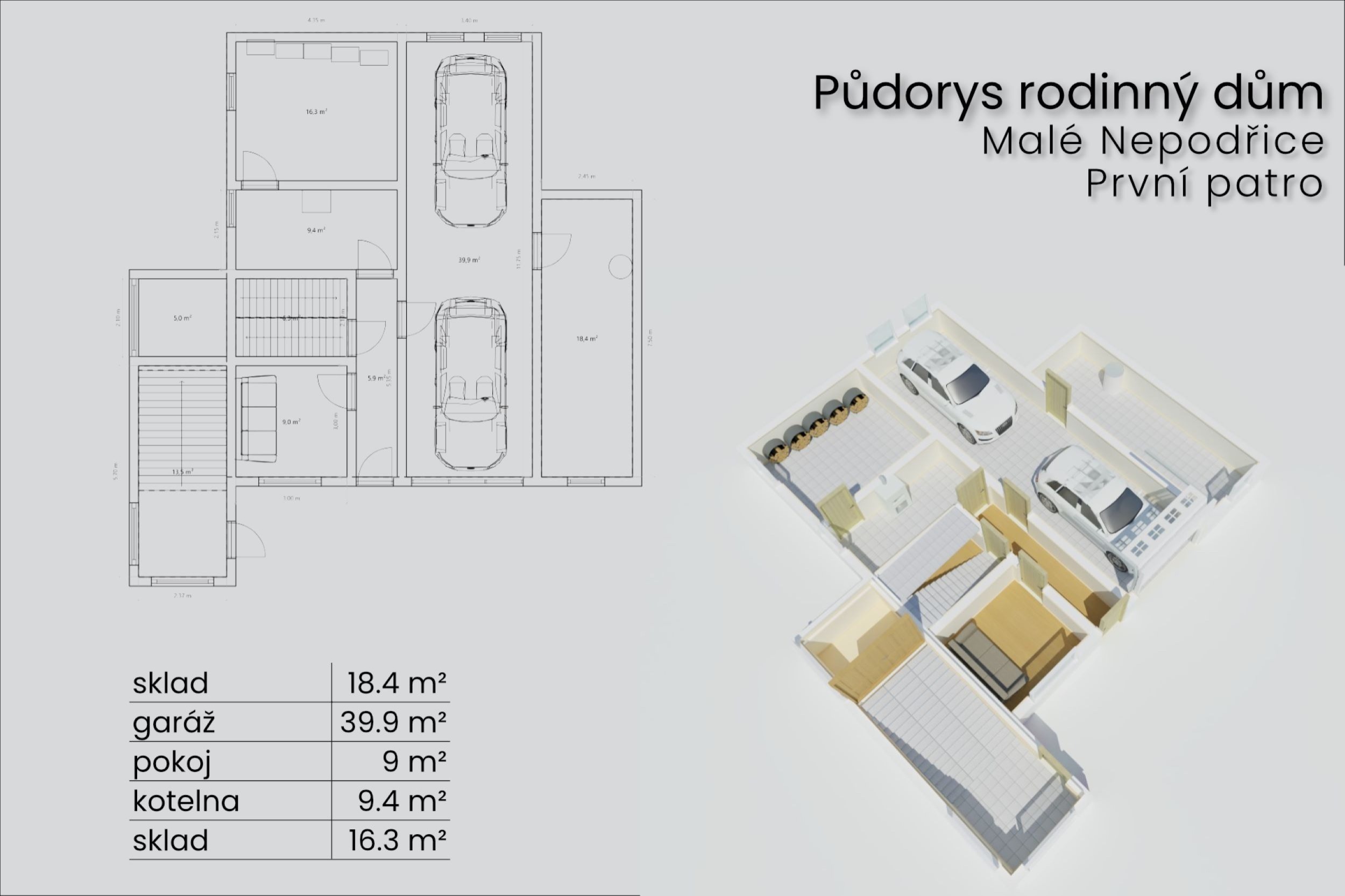 V přízemí je technické zázemí s kotelnou a dvěma sklady, vstup do dvojgaráže a pracovna. I tady může vzniknout samostatné bydlení.