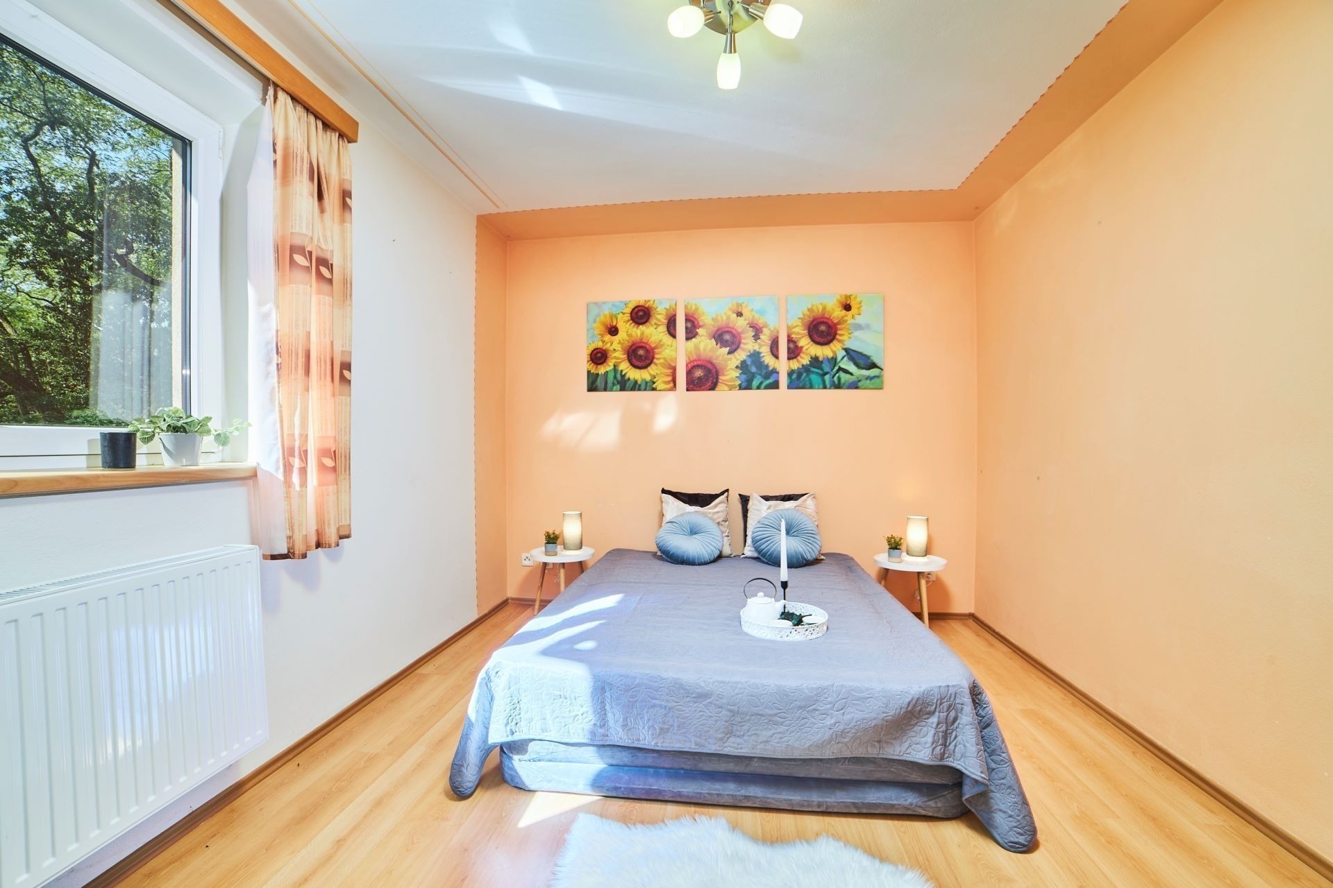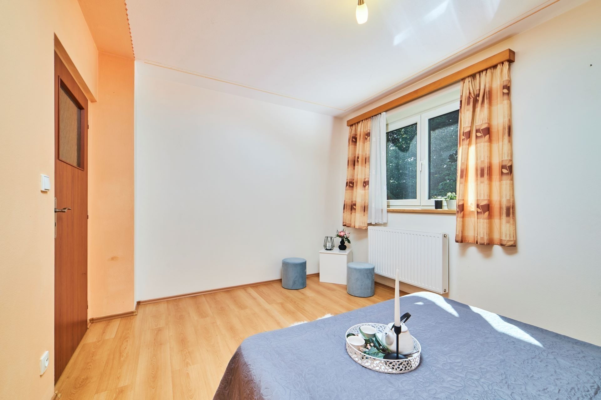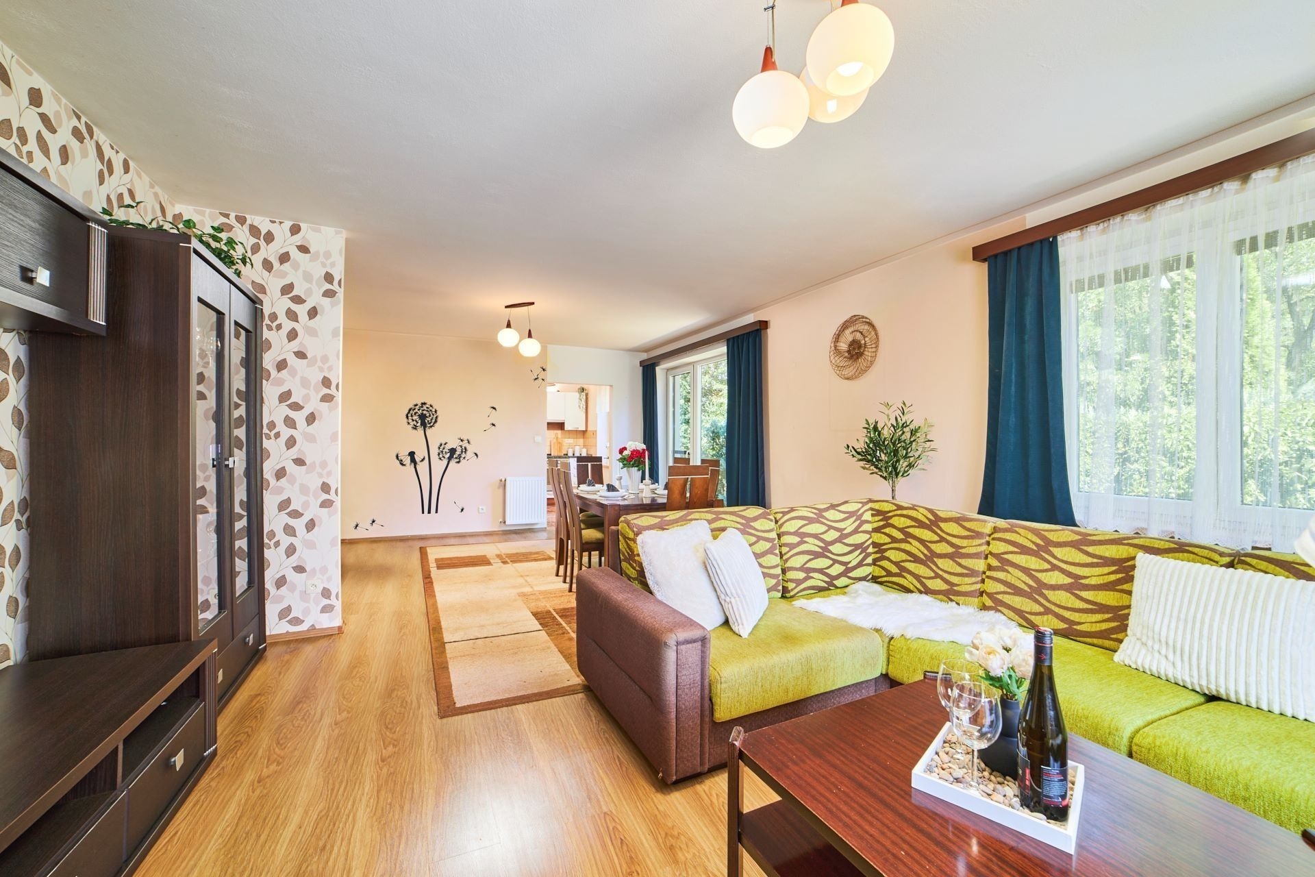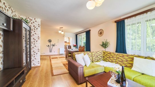 Byt s dispozicí 3+1 o velikosti 78 m² je kompletně zařízený a připravený k nastěhování. Je v patře, takže z obývacího pokoje s jídelnou budete mít dokonalý výhled – a to nejen velkými okny. Na obývák totiž navazuje obrovská terasa orientovaná do okolní zeleně.
