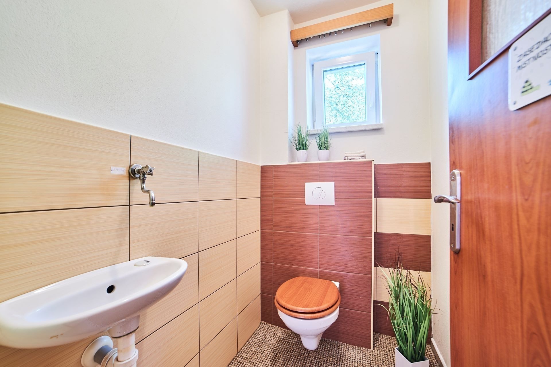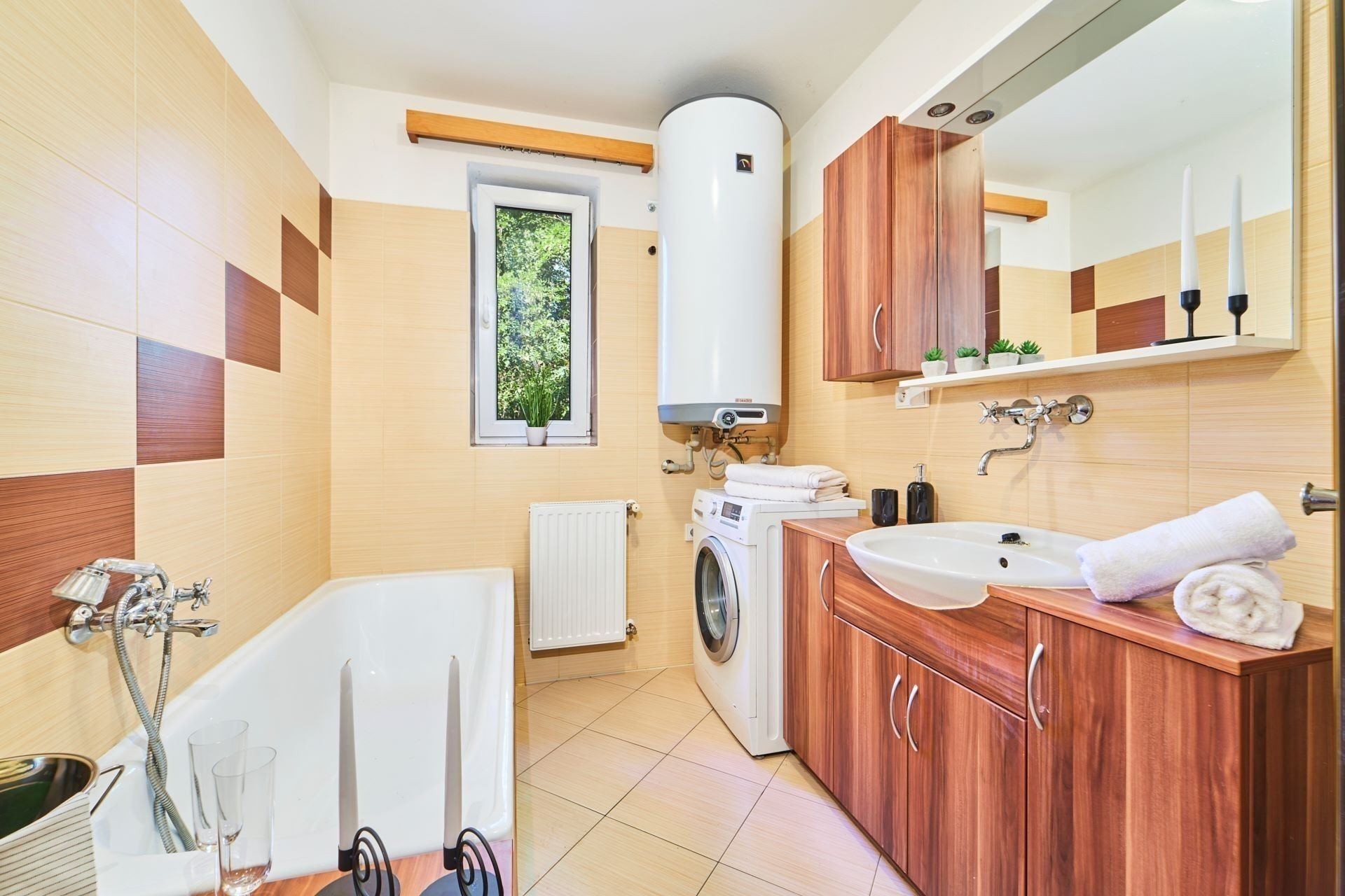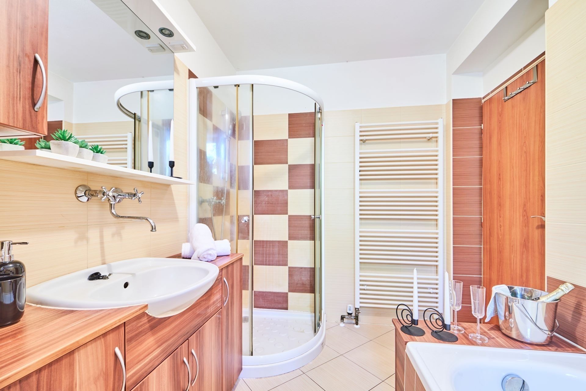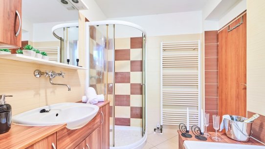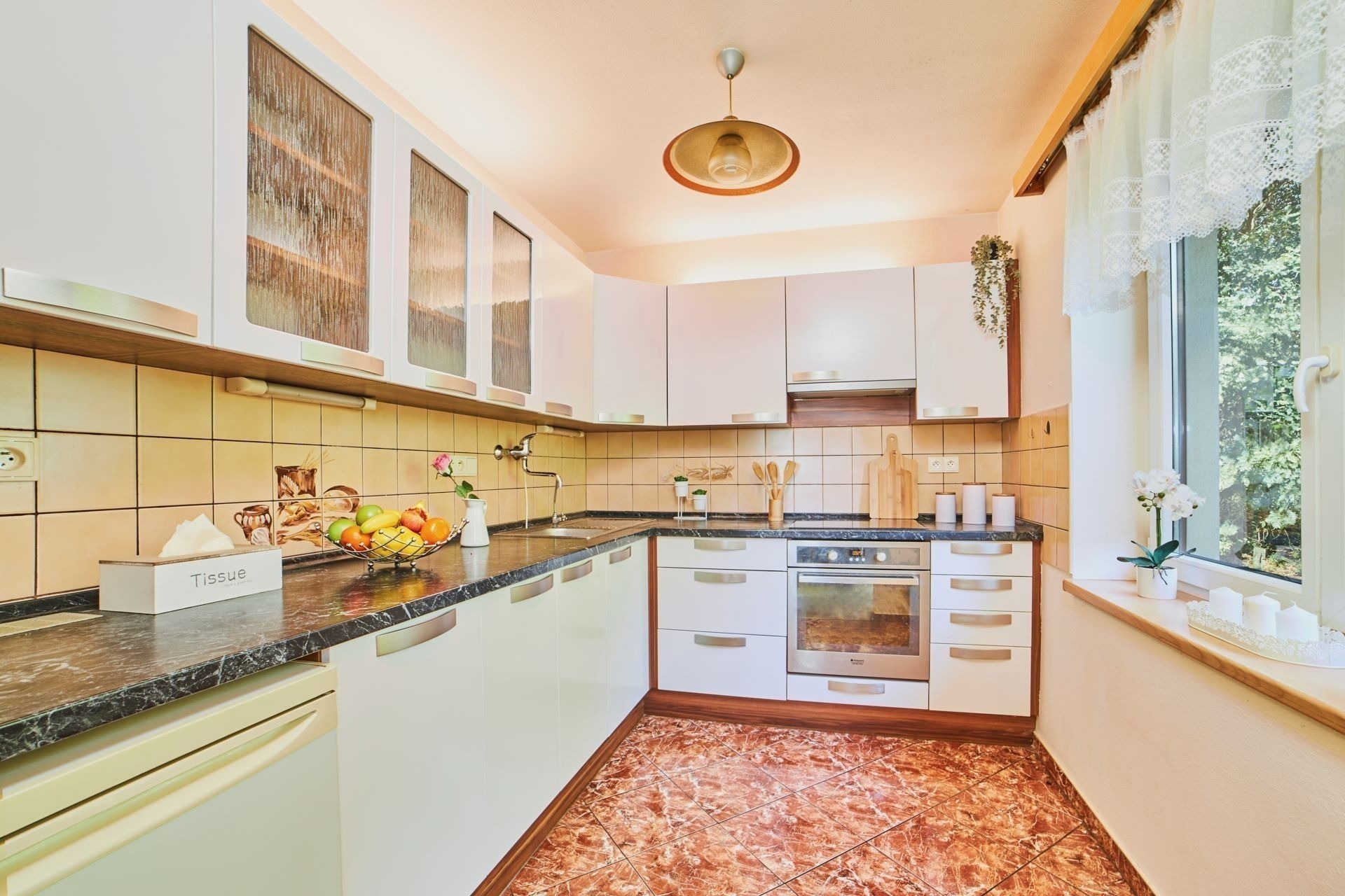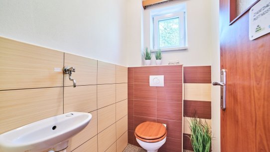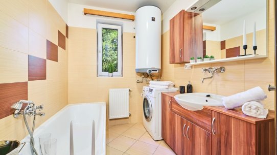 Částečně oddělená kuchyně je zařízená linkou se všemi spotřebiči a spoustou úložných prostor. V koupelně přístupné z chodby je sprchový kout i vana, samostatná toaleta je hned vedle.