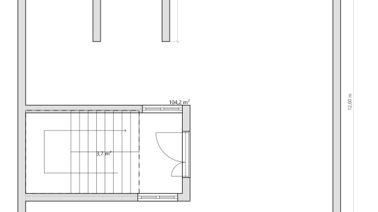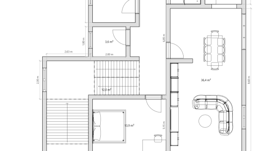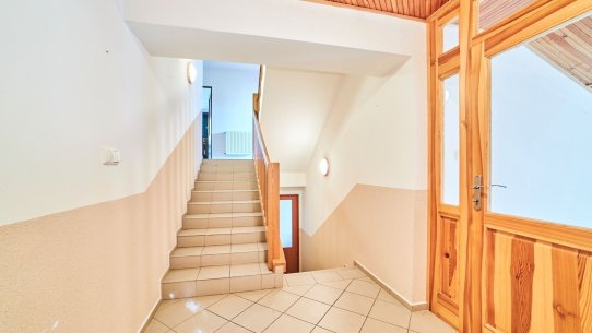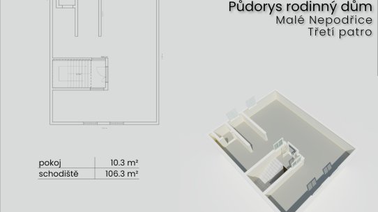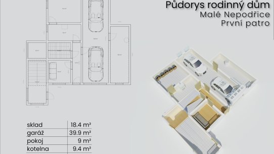 Třípatrový rodinný dům s výměrou 288 m² má v přízemí technické zázemí, dvojgaráž a pracovnu, v 1. patře byt 3+1 a v podkroví přípravu na vestavbu. Patra jsou propojena centrálním schodištěm a mohou tu tak vzniknout 2–3 samostatné byty.