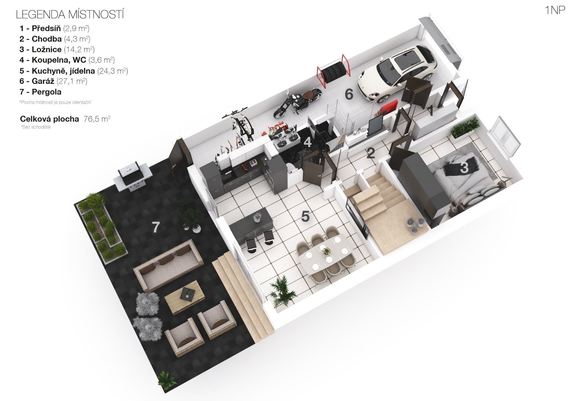 V přízemí o velikosti 55 m2 se nachází kuchyně s jídelnou, světlá ložnice a koupelna s toaletou a sprchou. Nadčasová designová kuchyňská linka je vybavená všemi spotřebiči a nechybí jí ani barový ostrůvek. Navazuje na ni prostorná jídelna, kterou můžete klidně využít i jako obývák. Z kuchyně balkonovými dveřmi vyjdete přímo na zastřešenou dlážděnou terasu o velikosti 36 m2, ze které budete mít krásný výhled do zahrady.