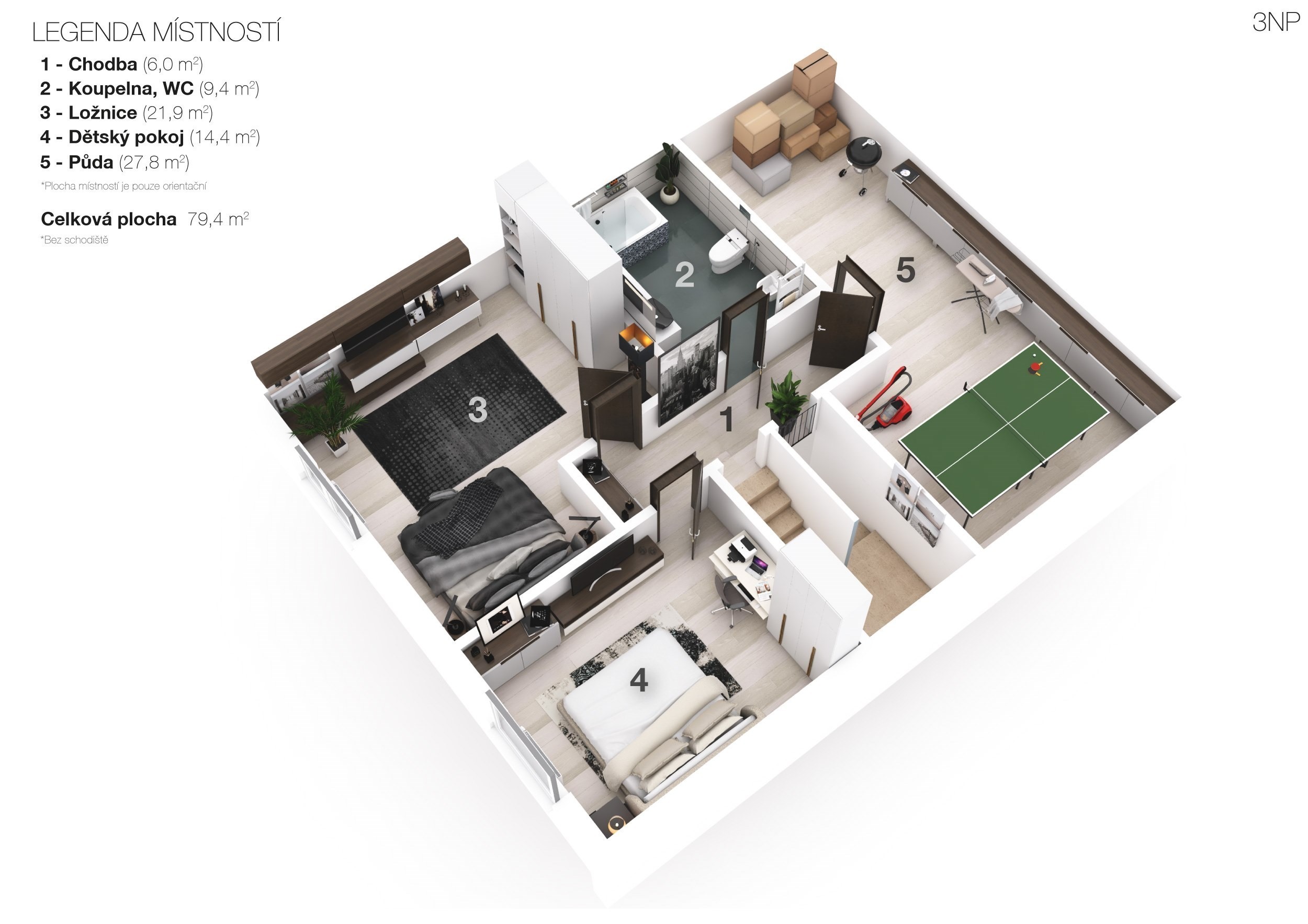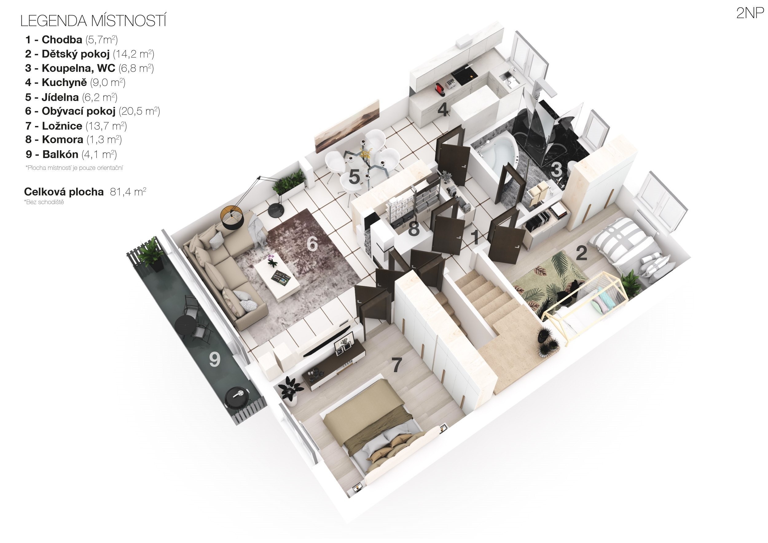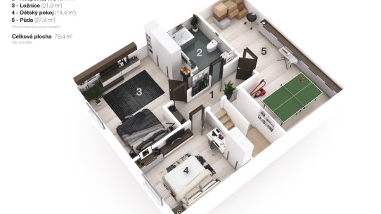 Ve druhém patře na vás čekají další dva pokoje, koupelna s vanou a toaletou a také vstup na půdu.