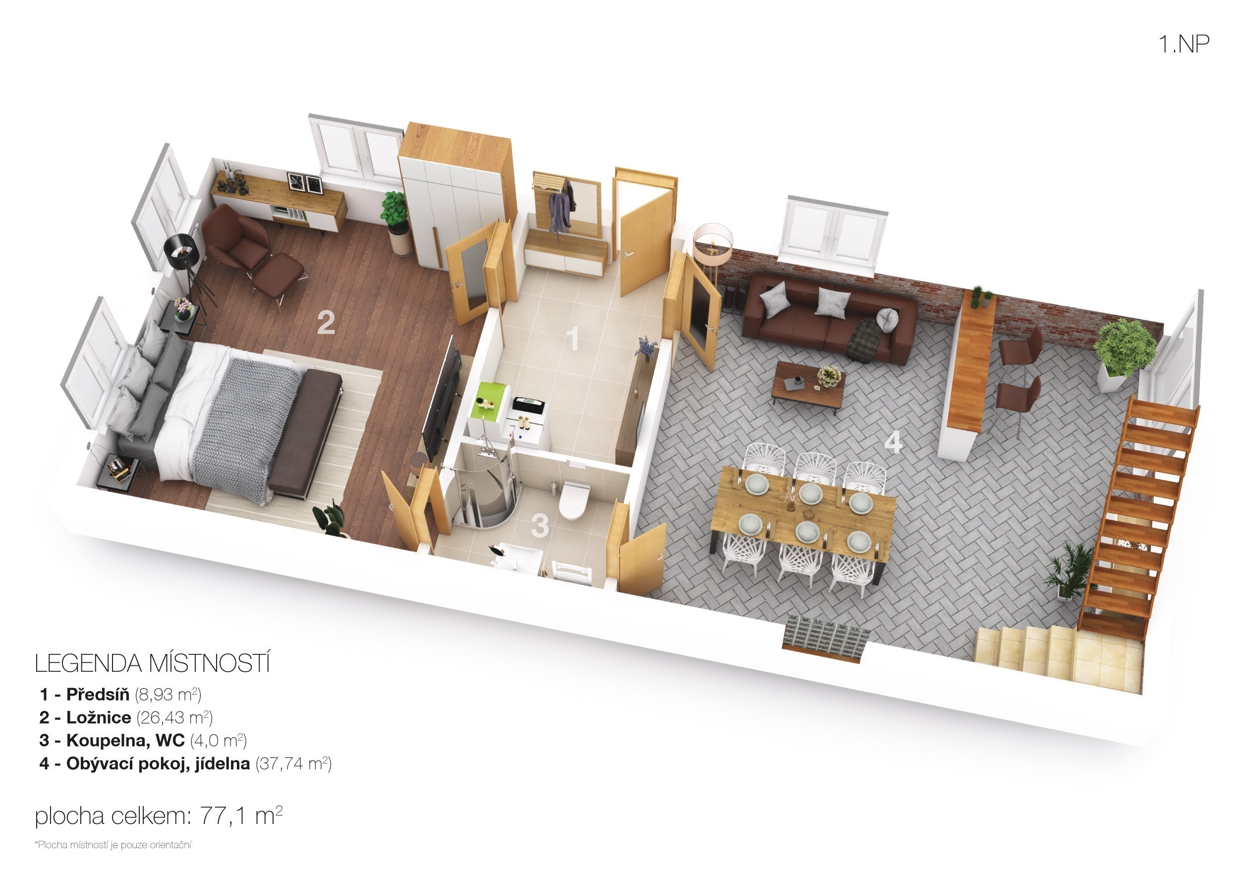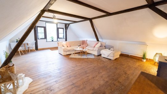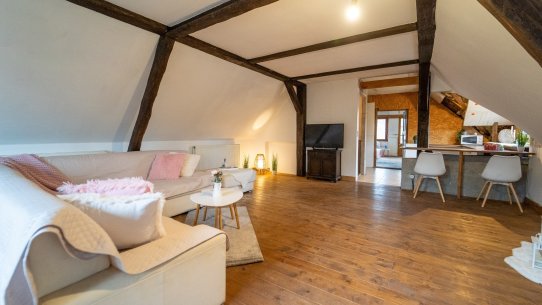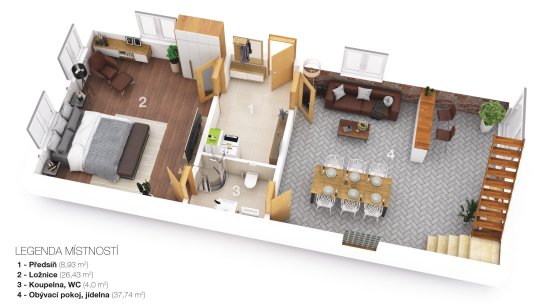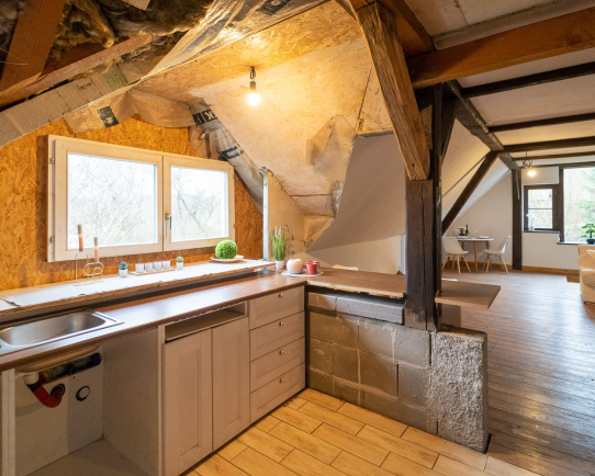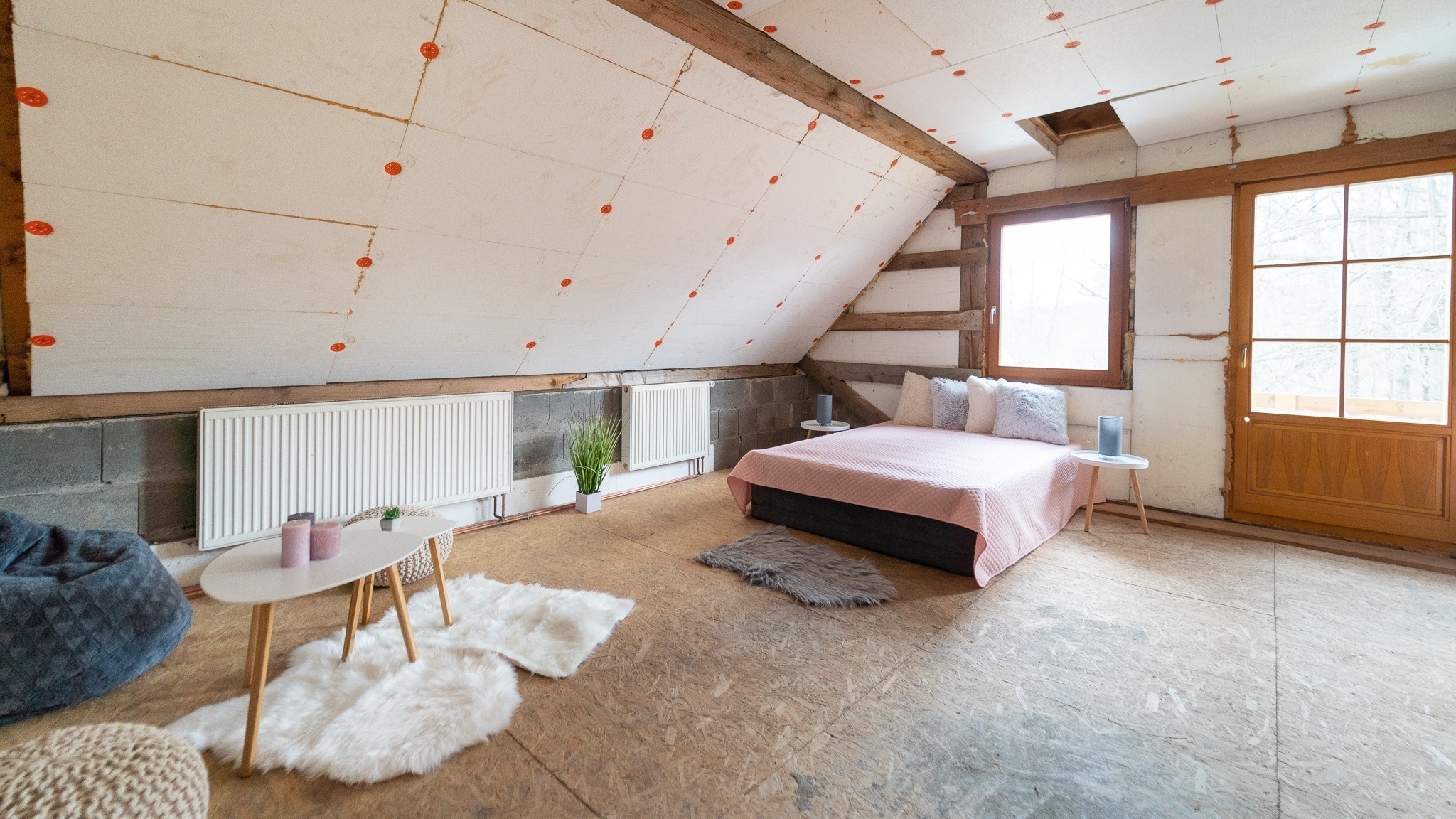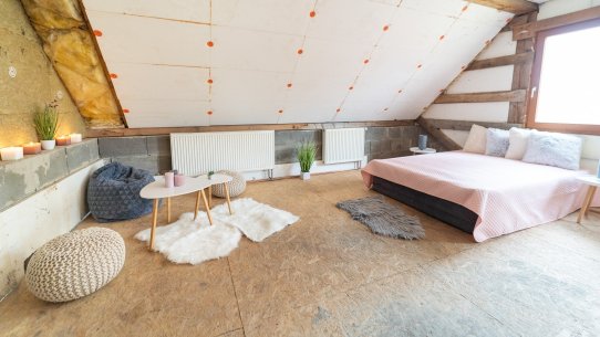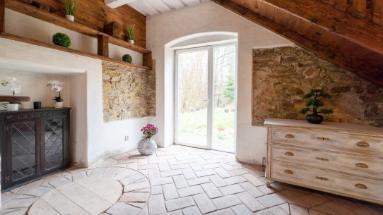Dům je řešený jako 4+kk, ale je jen na vás, jak se stávající dispozicí naložíte. Celková rozloha prvního patra je přibližně 77 m2. Po vstupu do domu se z předsíně dostanete do první z ložnic s výměrou 26,5 m2 a také do obývacího pokoje s jídelnou o velikosti 38 m2, odkud budete mít krásný výhled francouzskými dveřmi do zahrady. V jídelně jsou nachystané rozvody na zřízení kuchyně a také zachovaná částečně zasypaná studna, která může posloužit třeba jako zajímavá dekorace. Na patře je nachystaný základ pro budoucí koupelnu se sprchovým koutem a WC. Po schodech z obýváku pak vystoupáte do druhého patra o velikosti 89,5 m2. Tam na vás čeká další pokoj o velikosti 38 m2, který navazuje na kuchyni o velikosti 11 m2. Na druhé straně je umístěná ložnice s výměrou 30 m2, která má vlastní balkon o velikosti 6 m2. Kromě toho je tu také samostatná toaleta.