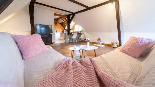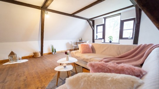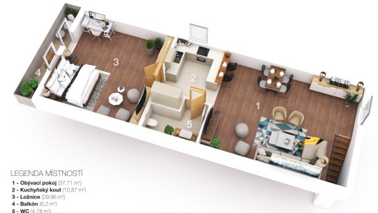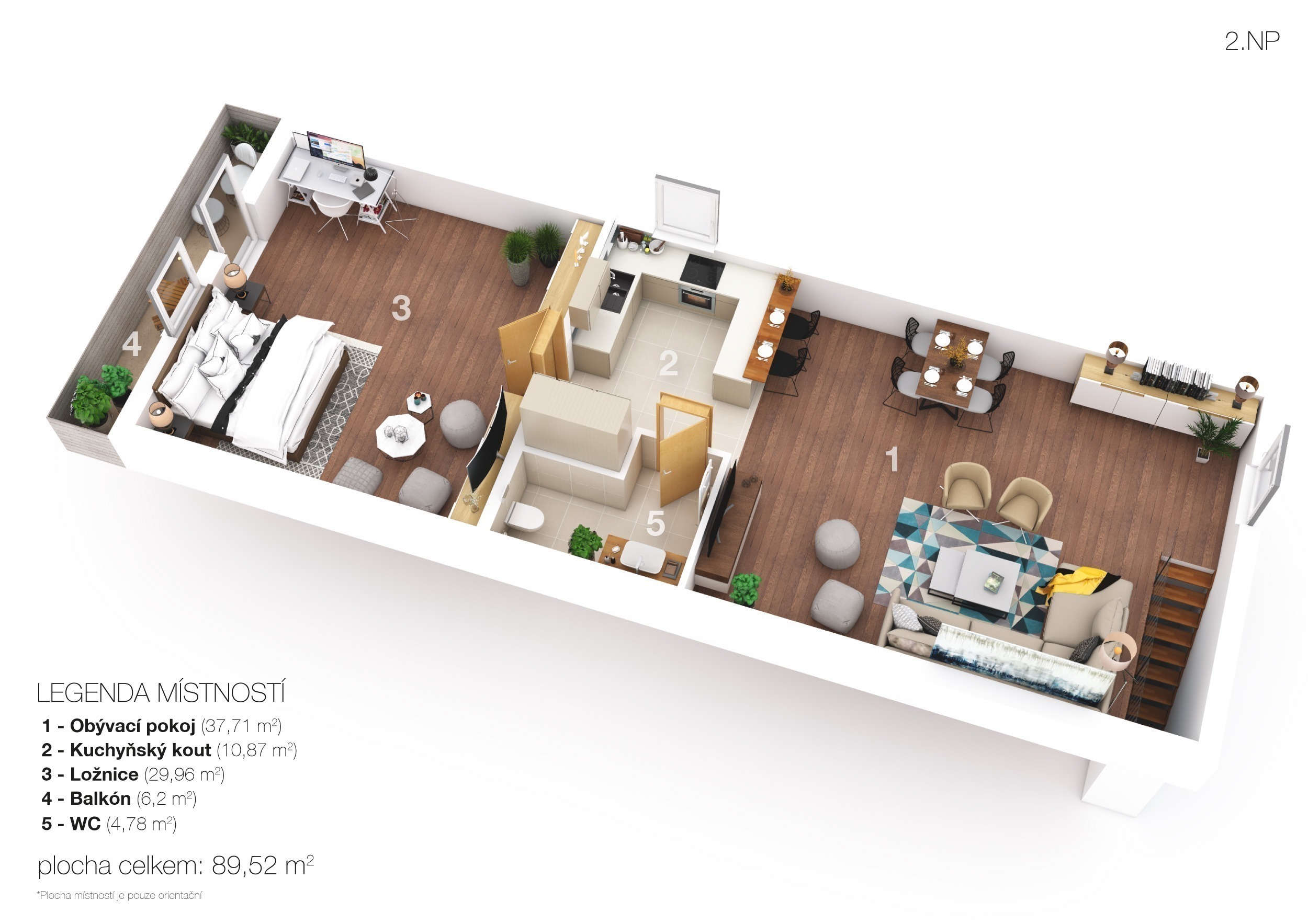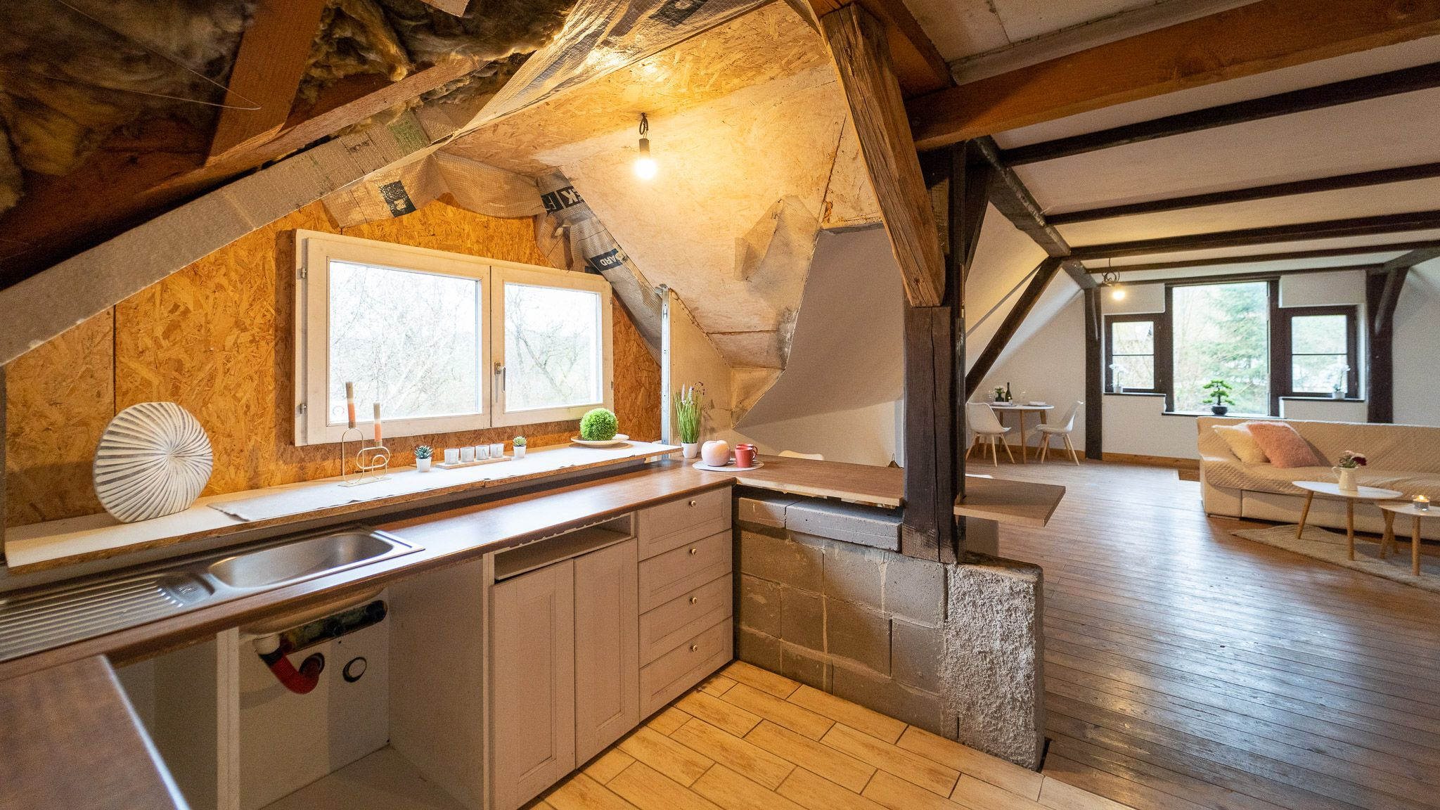 Dům je řešený jako 4+kk, ale je jen na vás, jak se stávající dispozicí naložíte. Celková rozloha prvního patra je přibližně 77 m2. Po vstupu do domu se z předsíně dostanete do první z ložnic s výměrou 26,5 m2 a také do obývacího pokoje s jídelnou o velikosti 38 m2, odkud budete mít krásný výhled francouzskými dveřmi do zahrady. V jídelně jsou nachystané rozvody na zřízení kuchyně a také zachovaná částečně zasypaná studna, která může posloužit třeba jako zajímavá dekorace. Na patře je nachystaný základ pro budoucí koupelnu se sprchovým koutem a WC. Po schodech z obýváku pak vystoupáte do druhého patra o velikosti 89,5 m2. Tam na vás čeká další pokoj o velikosti 38 m2, který navazuje na kuchyni o velikosti 11 m2. Na druhé straně je umístěná ložnice s výměrou 30 m2, která má vlastní balkon o velikosti 6 m2. Kromě toho je tu také samostatná toaleta.