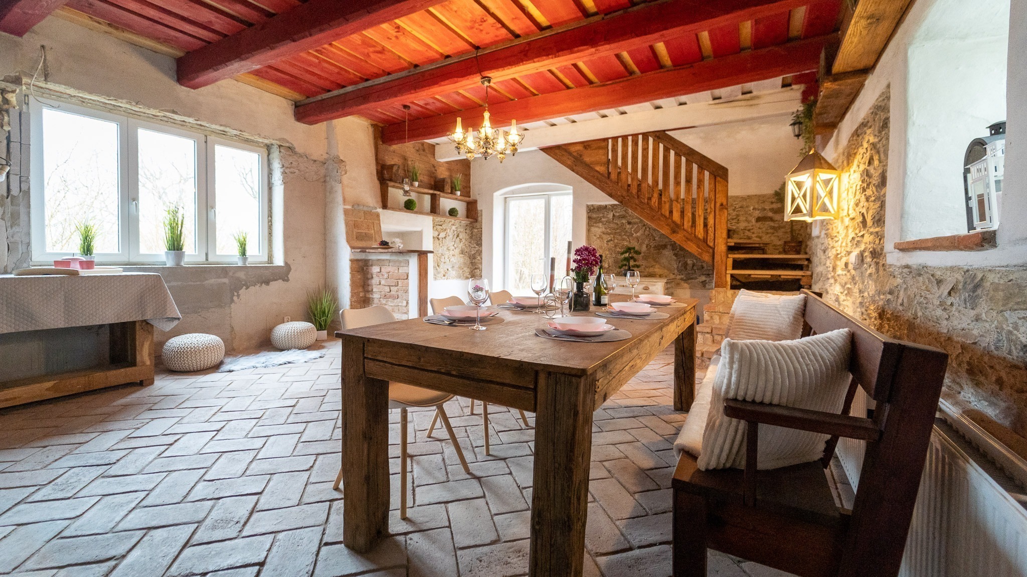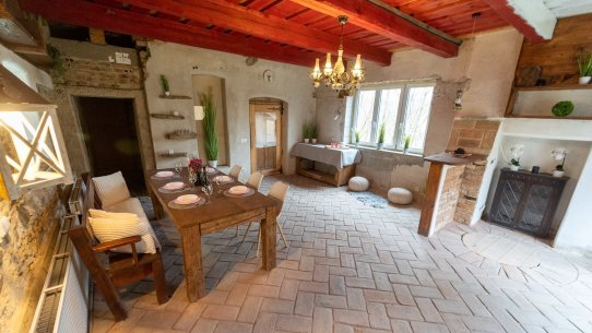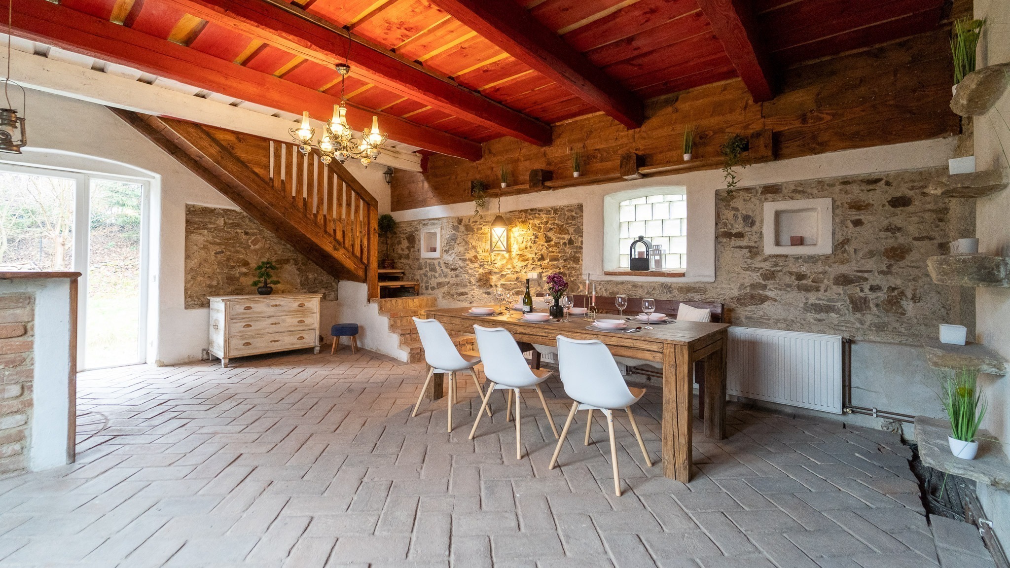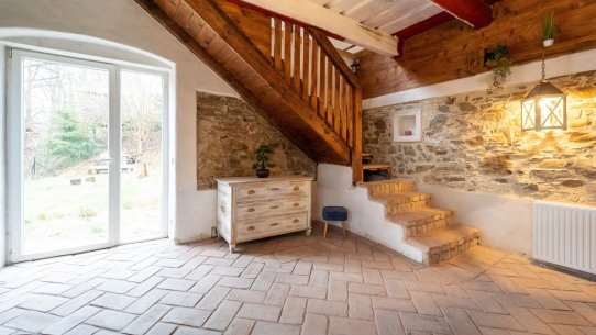 Dům se prodává ve stavu zdařile rozpracované rekonstrukce. Jsou hotové nové rozvody vody, kanalizace a topení. Odpady jsou svedeny do jímky a pro pitnou vodu je potřeba udělat vrt. Vytápění je zajištěno kotlem na tuhá paliva s možností úpravy na tepelné čerpadlo. Připravená je také elektřina, kterou je potřeba pouze napojit na přípojku. Dům má nový krov s krytinou a zateplením a také nový komín. Na původní kamenné zdi je udělaný nový věnec, na který se zdilo nové patro. Nainstalována jsou také nová okna a francouzské dveře vedoucí na zahradu. Podlahy jsou vykopané a zaizolované, v horním pokoji, kuchyni a jídelně už je pokládka dokončená, ve dvou zbývajících pokojích částečně.