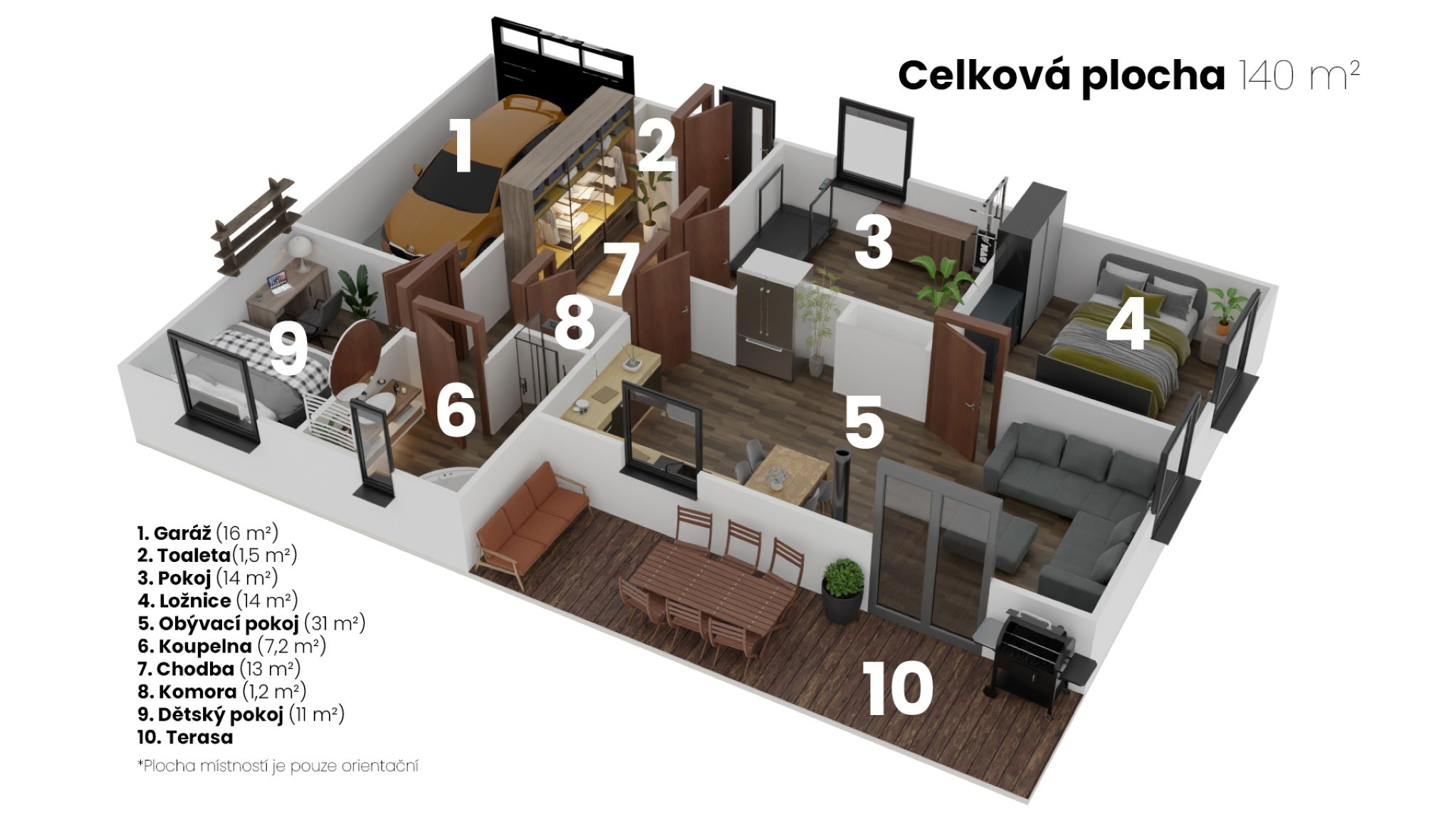 Celková podlahová plocha domu je 140 m2 a jeho dispozice je 4+kk. K domu patří pozemek s výměrou 1 857 m2. Dům se skládá z obývacího pokoje s kuchyní, tří pokojů, koupelny, WC a komory. Součástí domu je pochozí půda, garáž s výměrou cca 16 m2 a také terasa o velikosti 16 m2.