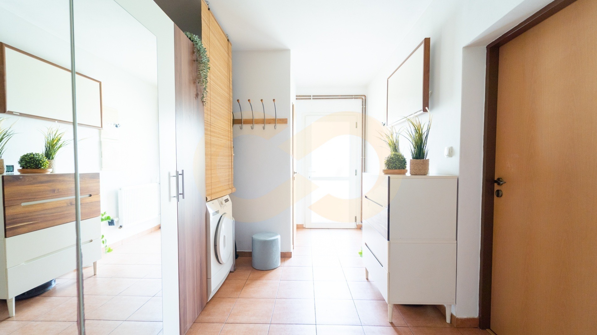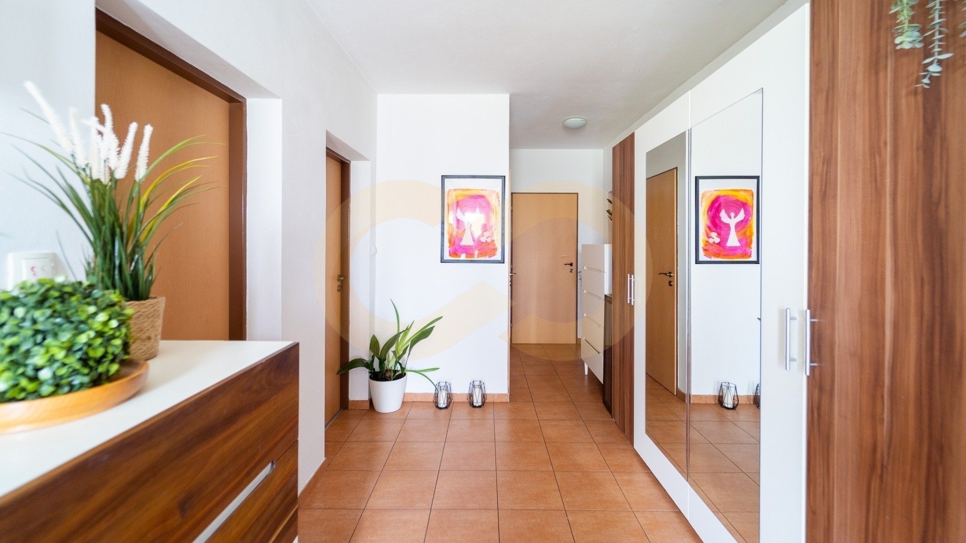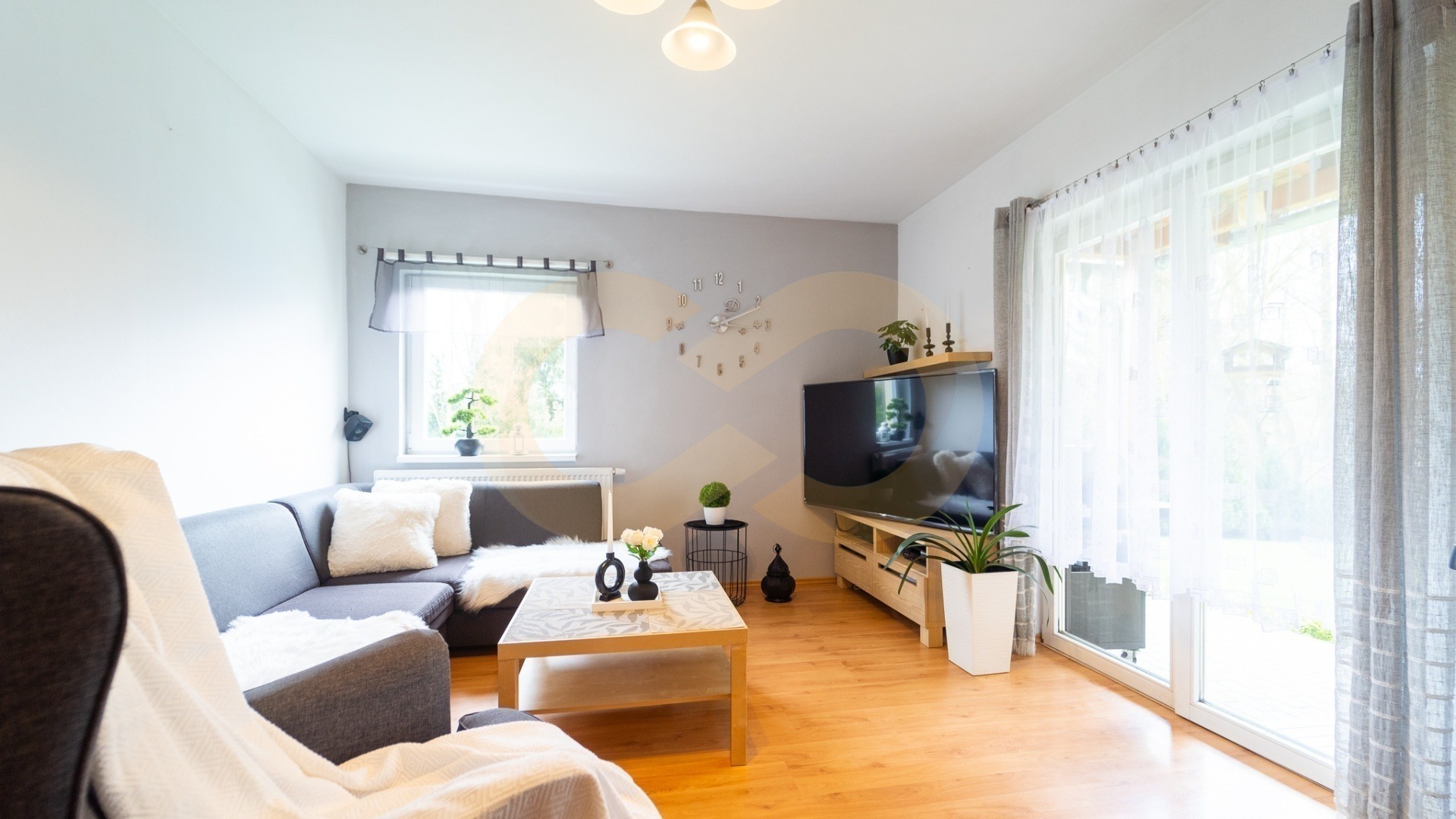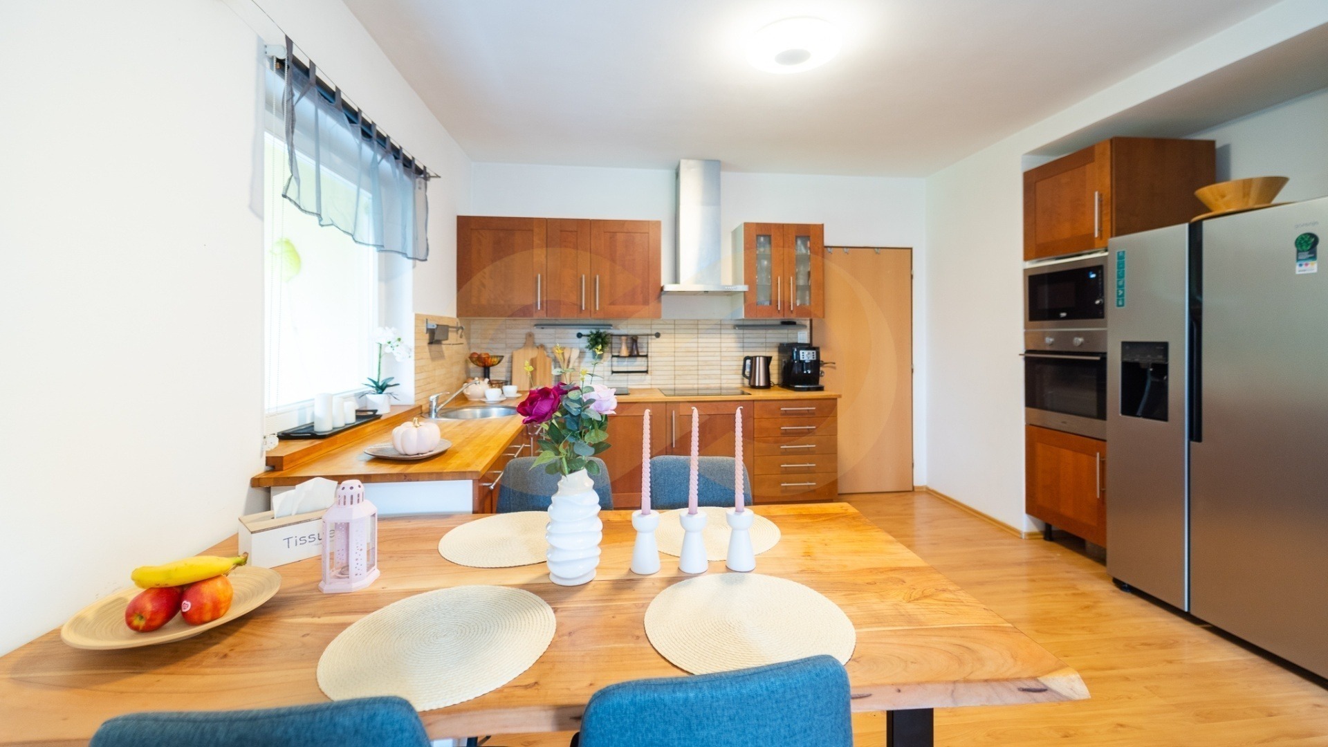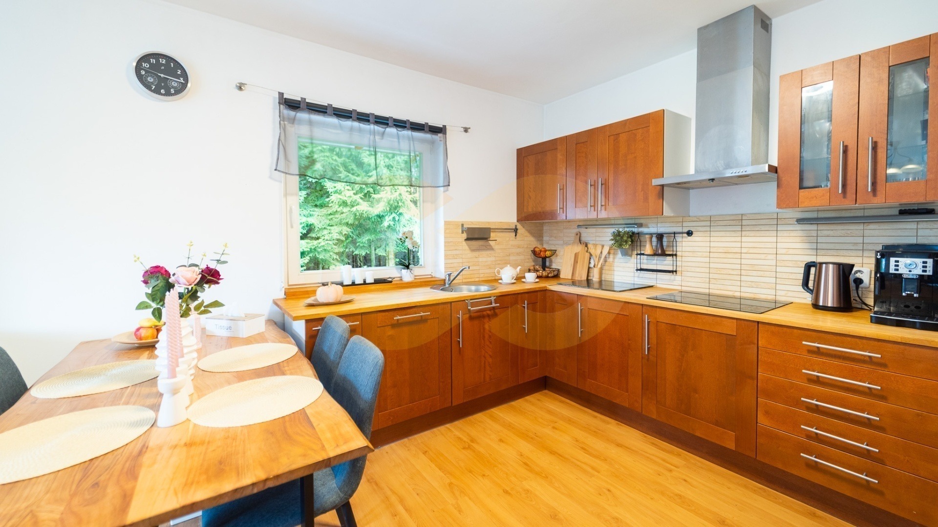 Dům je jednopodlažní a vstupuje se do něj přes prostornou chodbu s velkou skříní a komorou. V obývacím pokoji s kuchyní o velikosti skoro 30 m2 je díky dvěma oknům a dveřím na terasu po celý den spousta světla. Kuchyňská část je vybavená linkou s vestavěnými spotřebiči, mezi kterými nechybí ani zbrusu nová americká lednice. V obýváku jsou krbová kamna na přitápění a místa je tu dost i na velkou sedačku. Balkónovými dveřmi se dostanete na zastřešenou dlážděnou terasu s výhledem do zahrady.