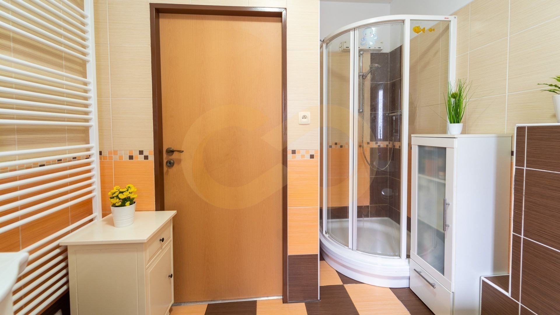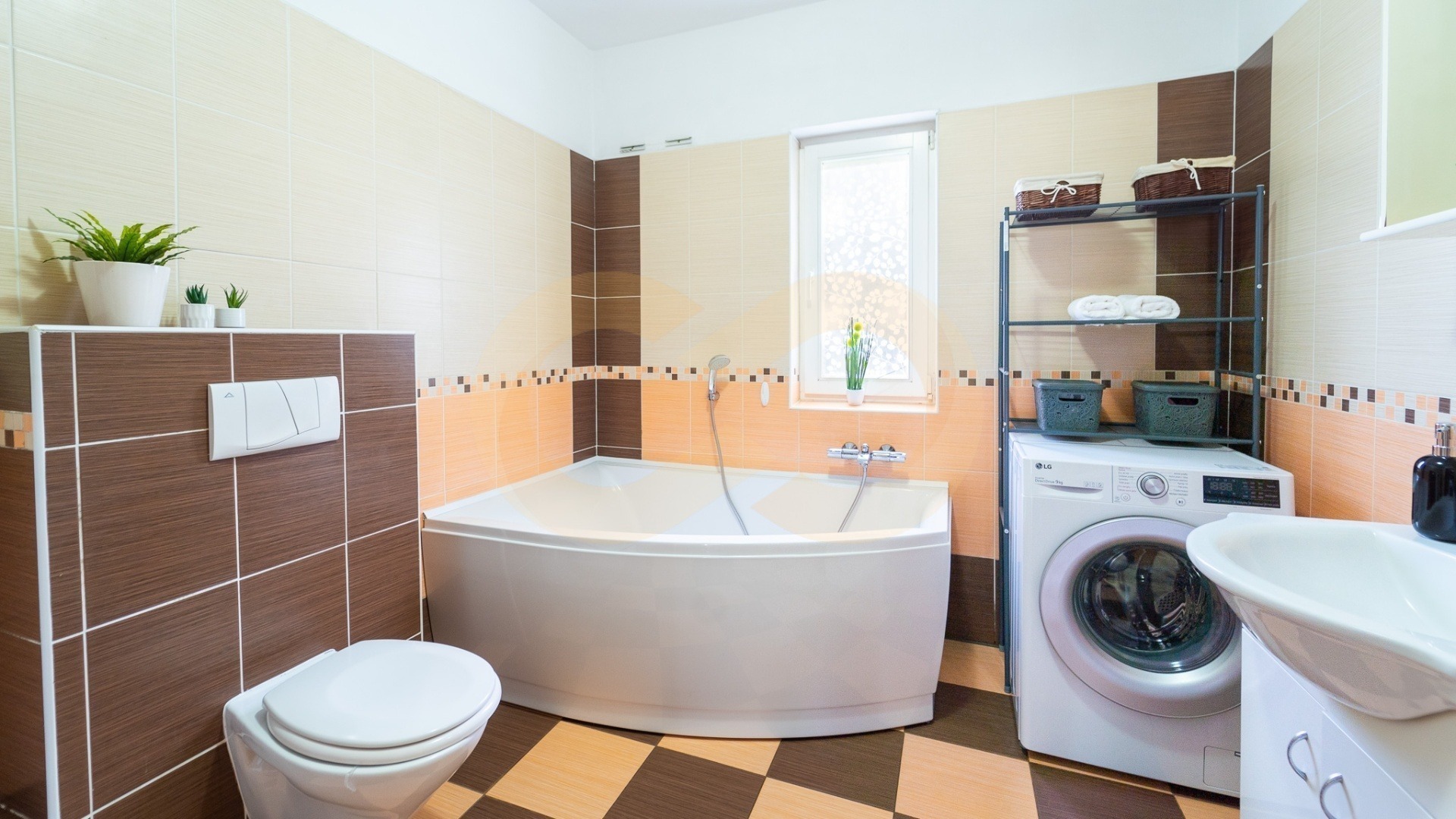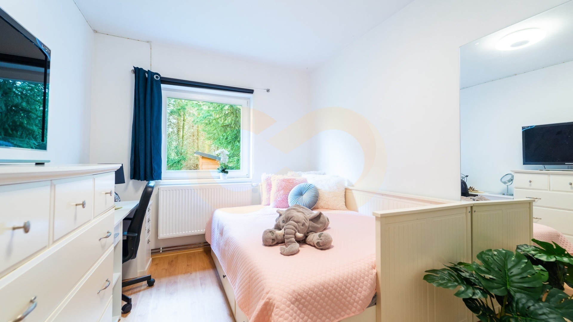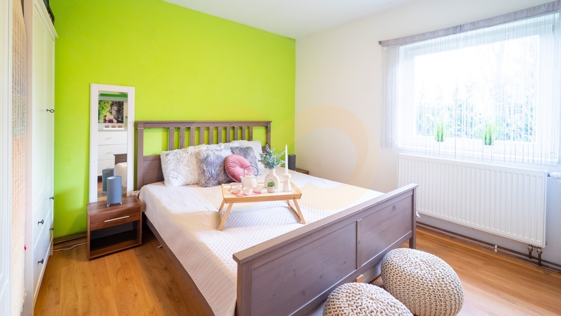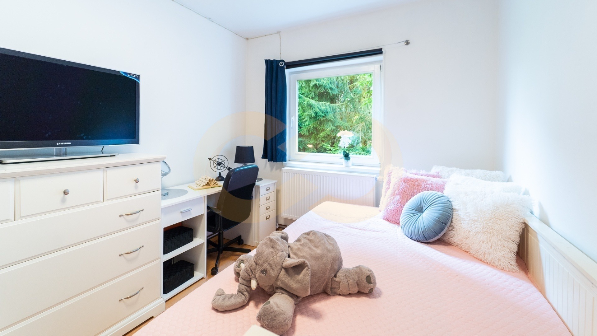 V domě jsou tři neprůchozí pokoje. Dva z nich o velikosti 14 m2 jsou umístěny vedle obýváku. Třetí pokoj má výměru 11 m2 a nachází se přes chodbu vedle koupelny. I když jsou okna orientovaná na různé strany, budete mít ze všech pokojů krásný výhled do okolní zeleně. V koupelně je rohová vana, sprchový kout a toaleta. Další samostatná toaleta je na chodbě, vedle vchodu do domu.