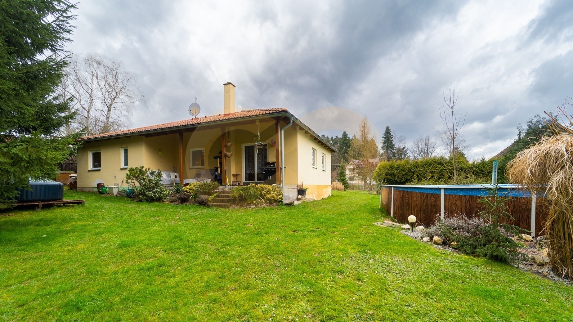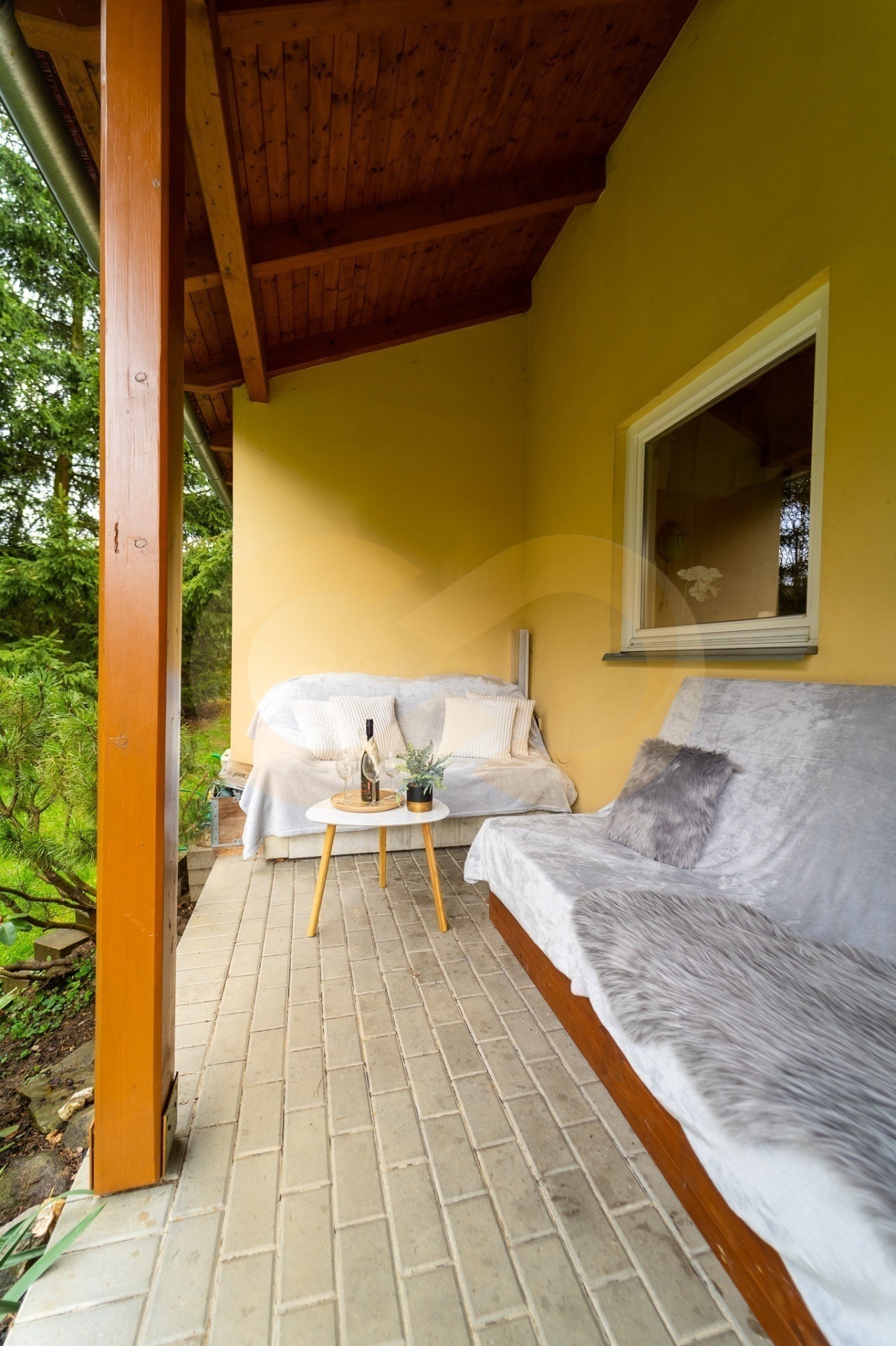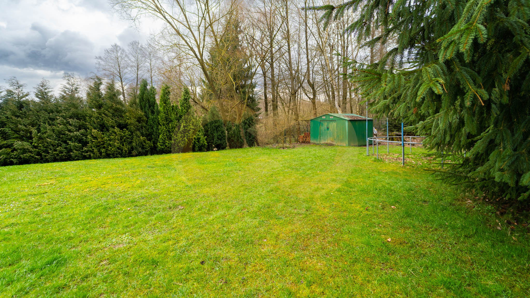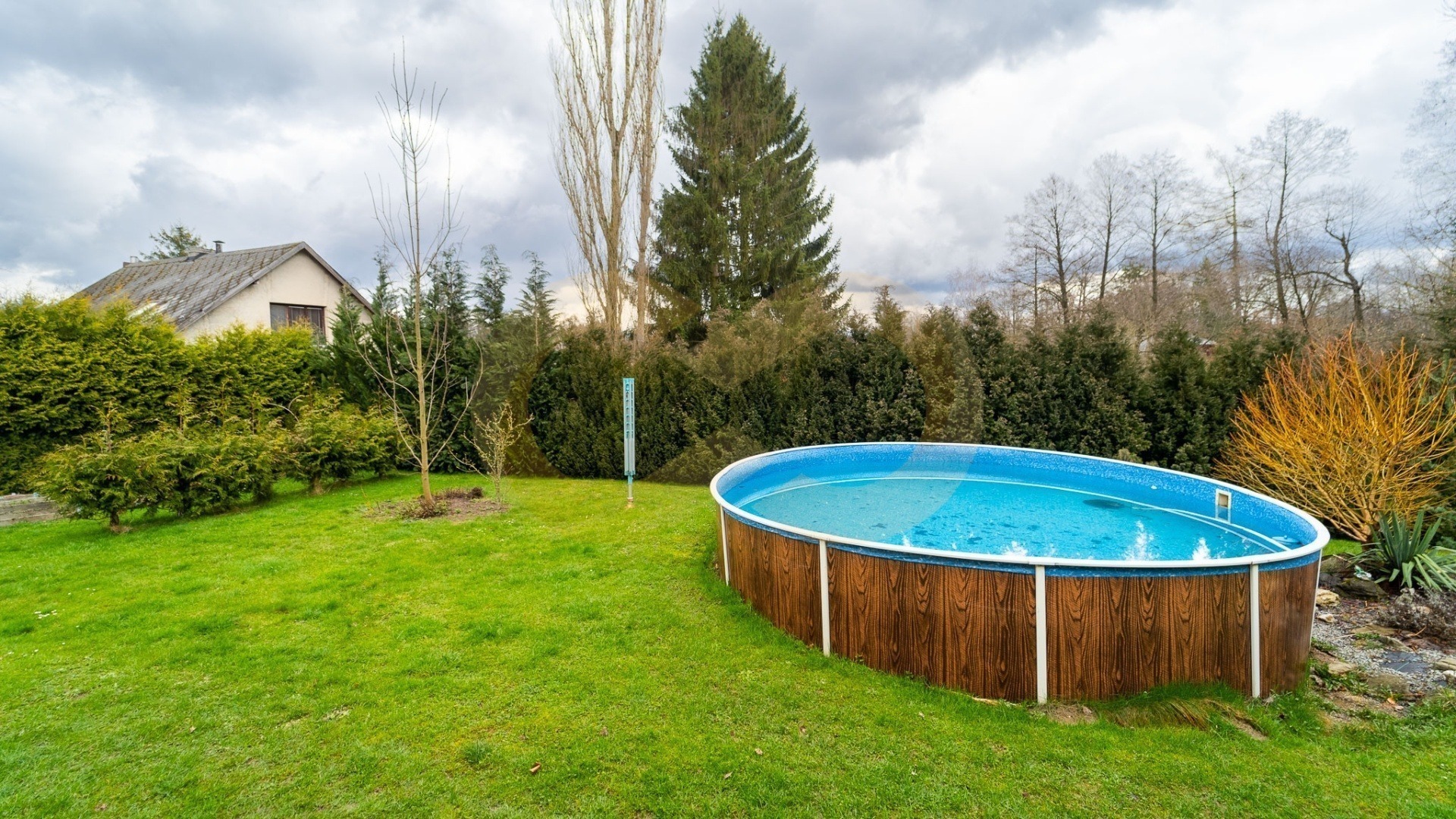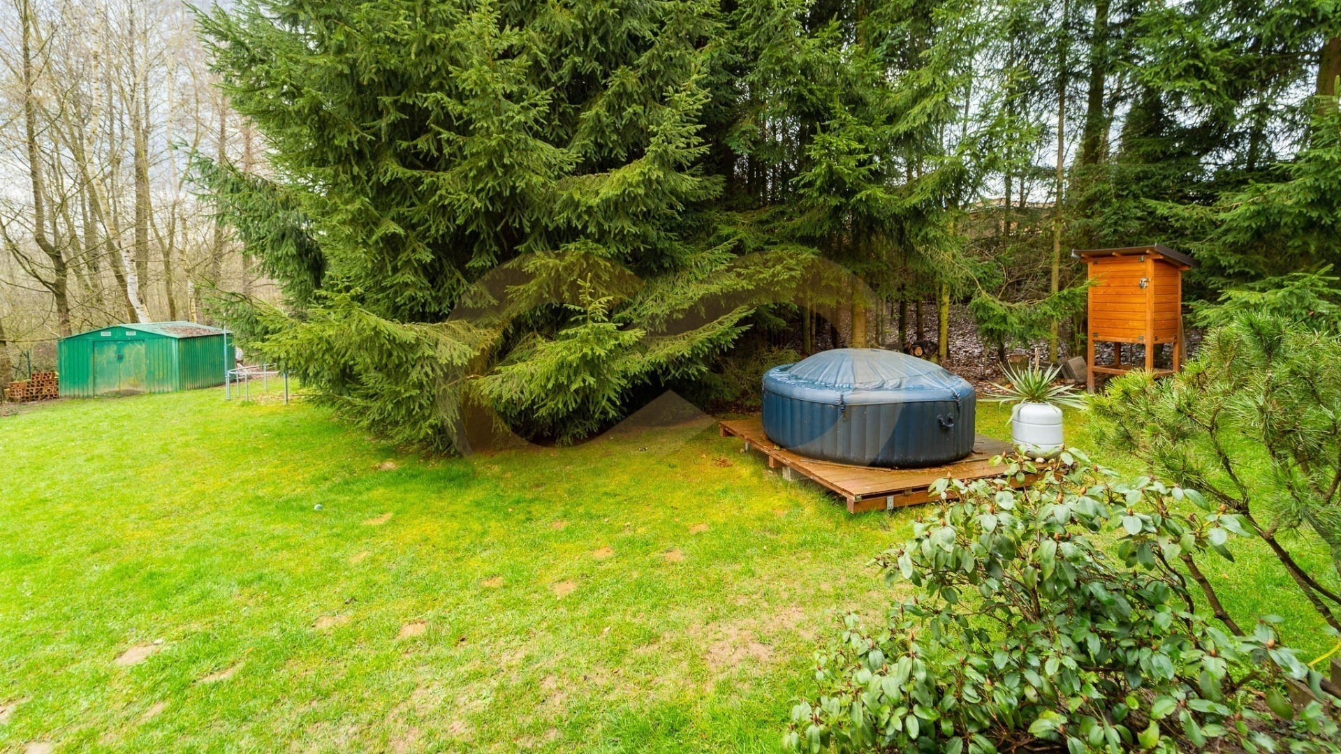 Zahrada je obklopena nejen plotem, ale také vzrostlými stromy, takže tu budete mít dostatek soukromí. Letní měsíce vám pak zpříjemní bazén a ve smíšeném lesíku si můžete nasbírat i nějaké ty houby.