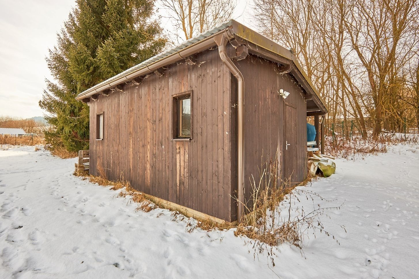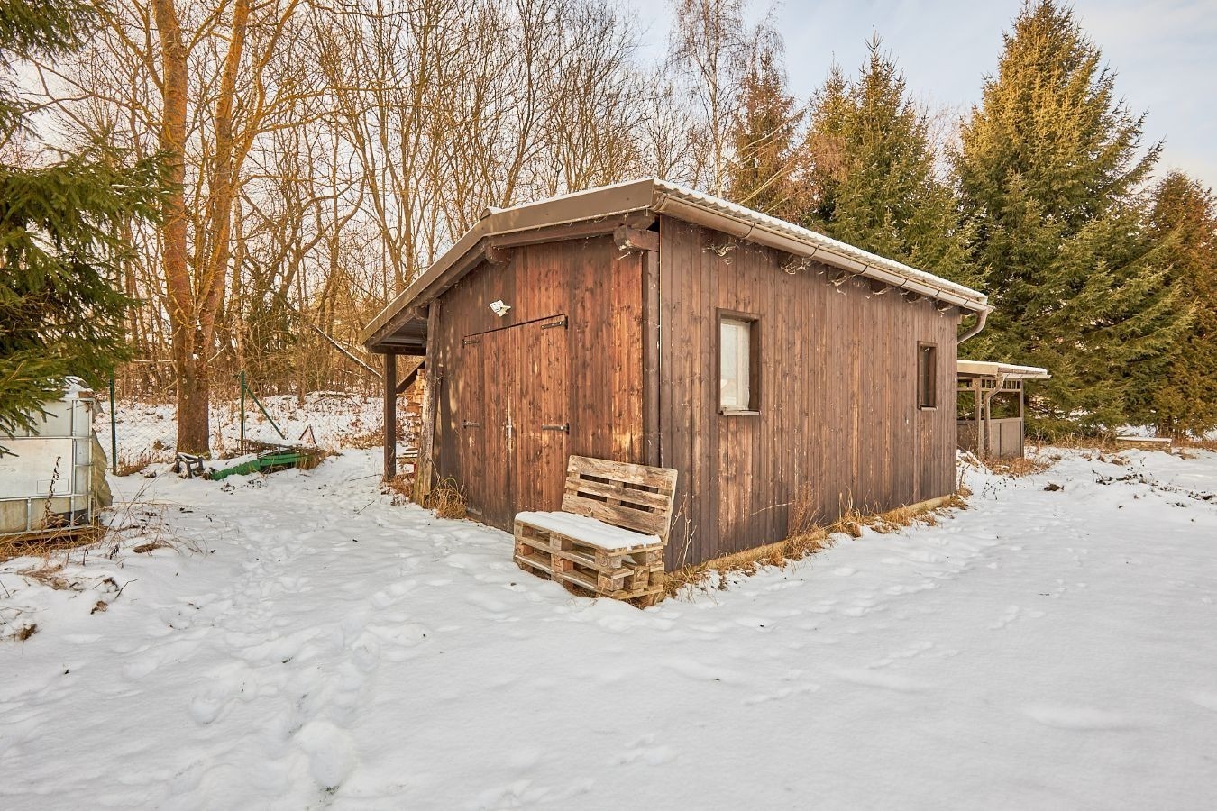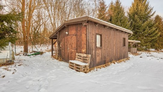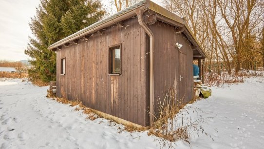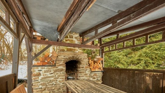 Na pozemku stojí chata s malou kuchyňkou a venkovním krbem. Pokud se stavbou nespěcháte, můžete v ní zatím trávit víkendy. A vhod určitě přijde i až se začne kopat.