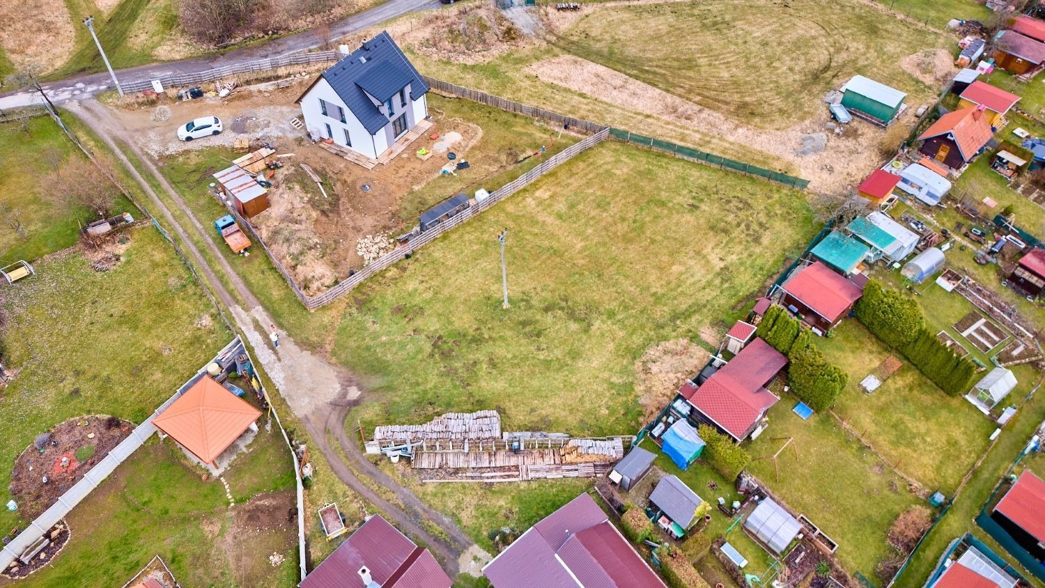 K pozemku vede nezpevněná příjezdová cesta a všechny inženýrské sítě (elektřina, voda a kanalizace) jsou přivedené na hranici pozemku.