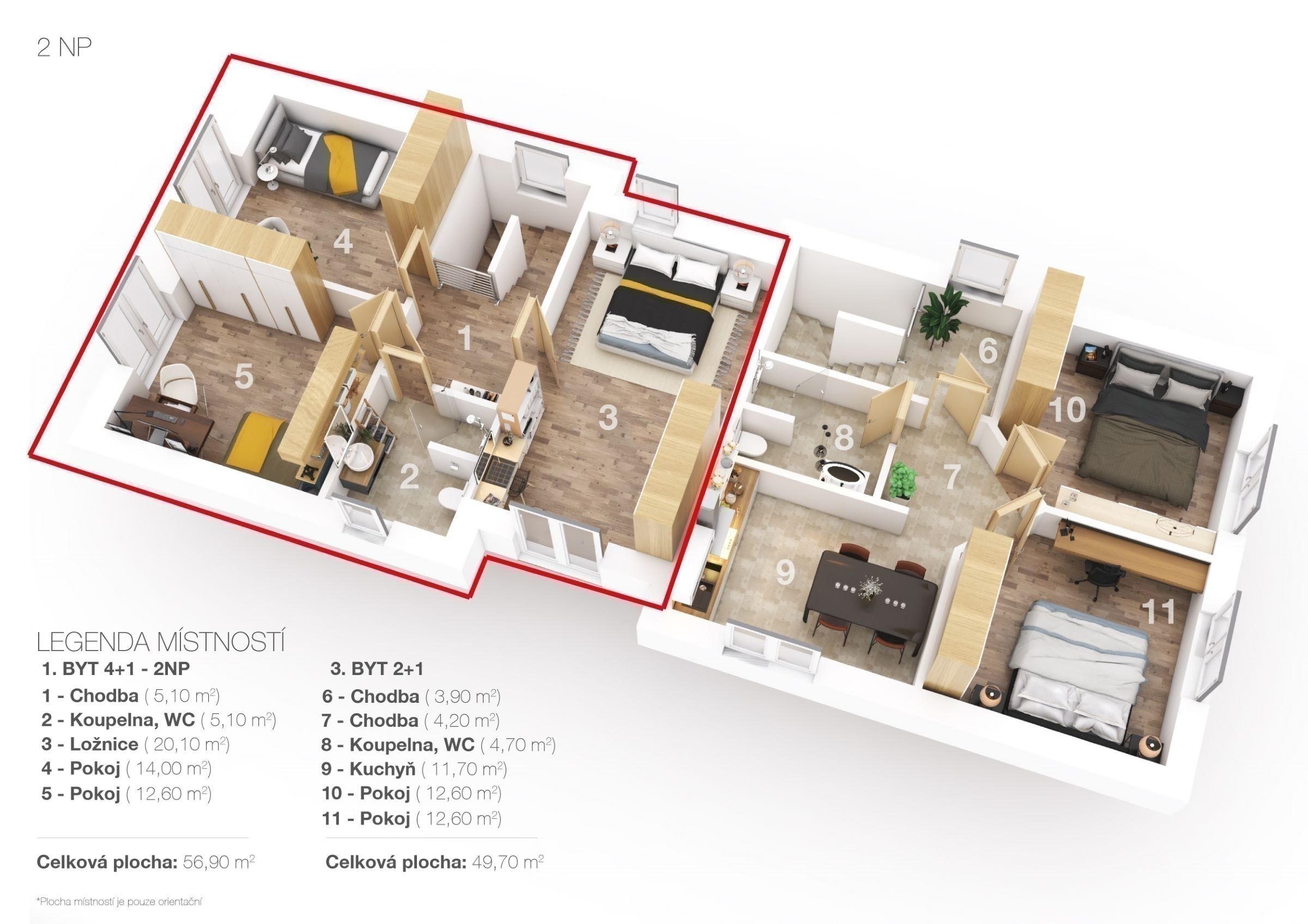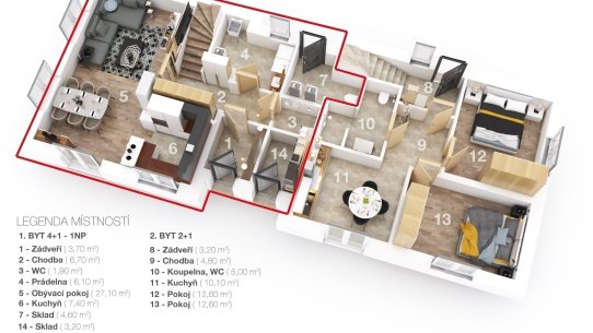 Největší byt 4+kk s výměrou 117 m2 a zahradou cca 560 m2 má vlastní vchod z přední strany domu a dvě krytá parkovací stání. Je řešený jako mezonet a patra propojuje schodiště z chodby.