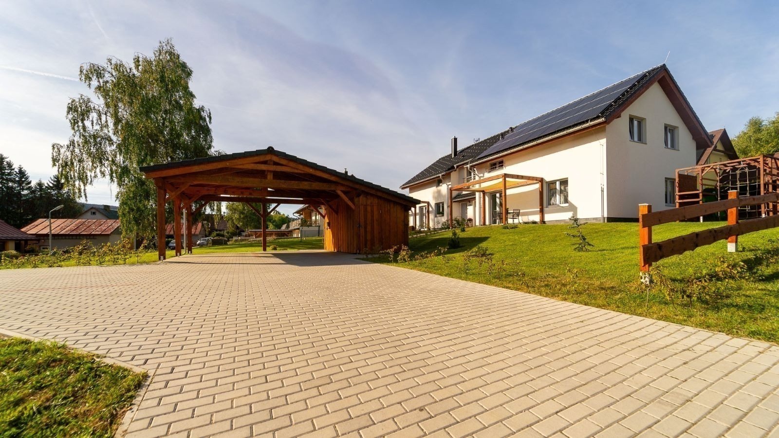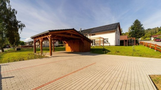 Stojí na upraveném pozemku o velikosti 1275 m2 s dětským hřištěm, částečně krytým parkovištěm pro 5 aut a zázemím pro lyžaře a kolaře.