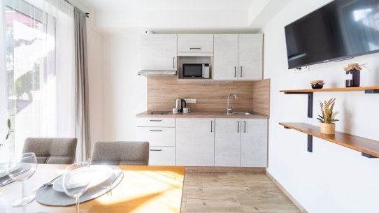 Apartmán má dva pokoje, plně vybavenou kuchyni, koupelnu se sprchou a toaletou.
