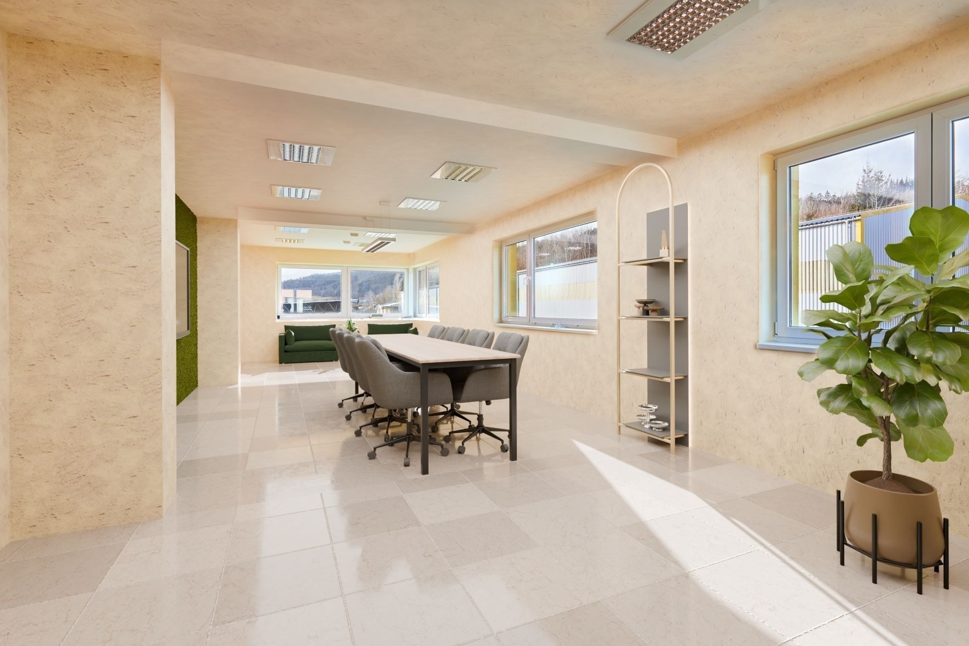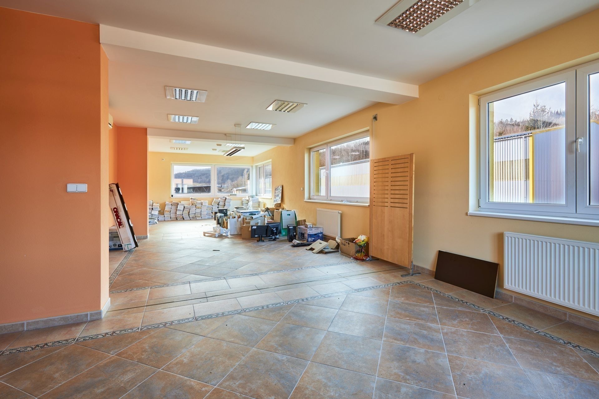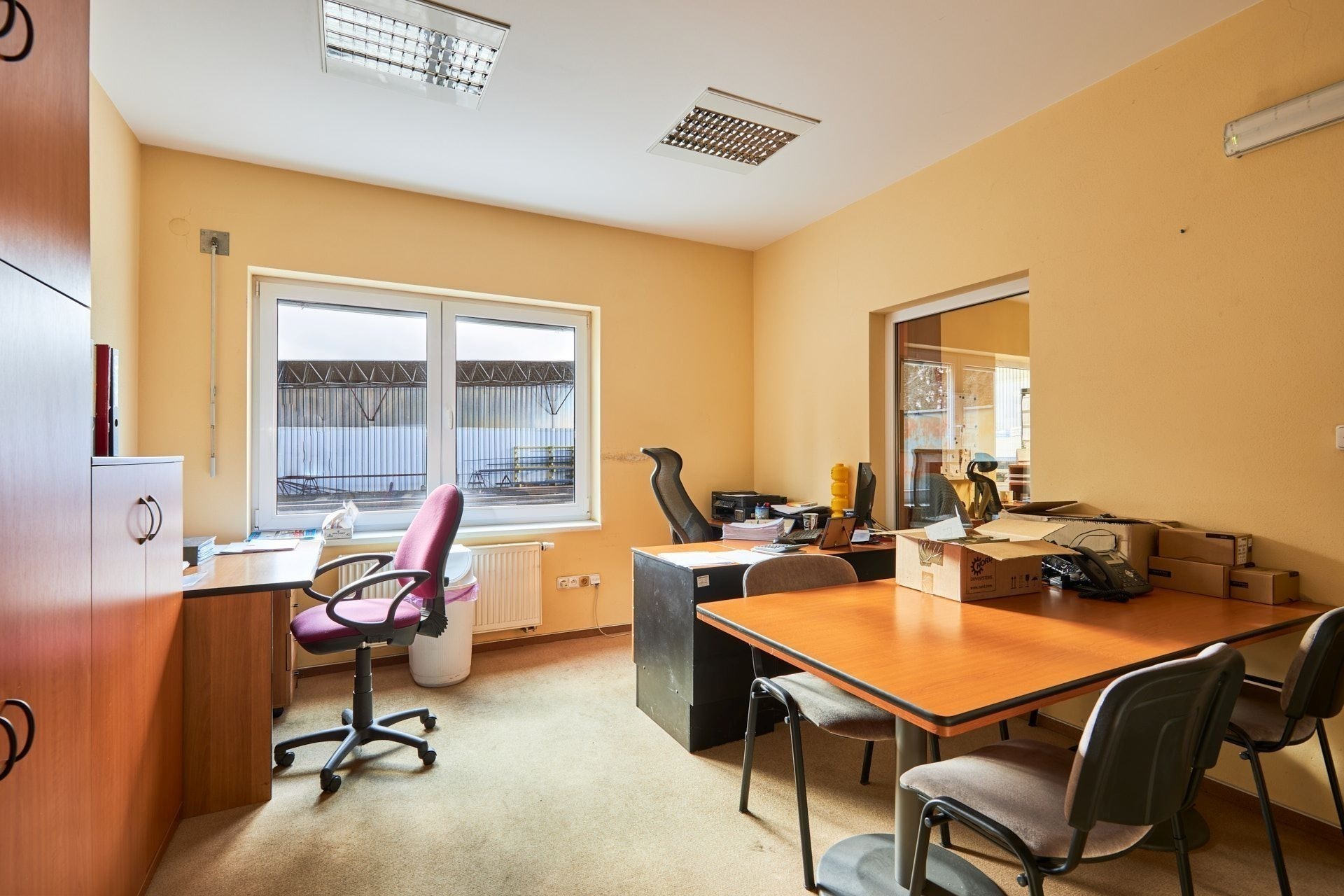 Potřebujete samostatný prostor pro materiál, hotové výrobky či zásoby? Sklad se třemi sekčními vraty poskytne pohodlnou a přehlednou manipulaci se zbožím. Hrubý beton na podlaze sice není ideální pro každodenní paletový provoz, ale pro bezpečné uložení věcí je více než vhodný.