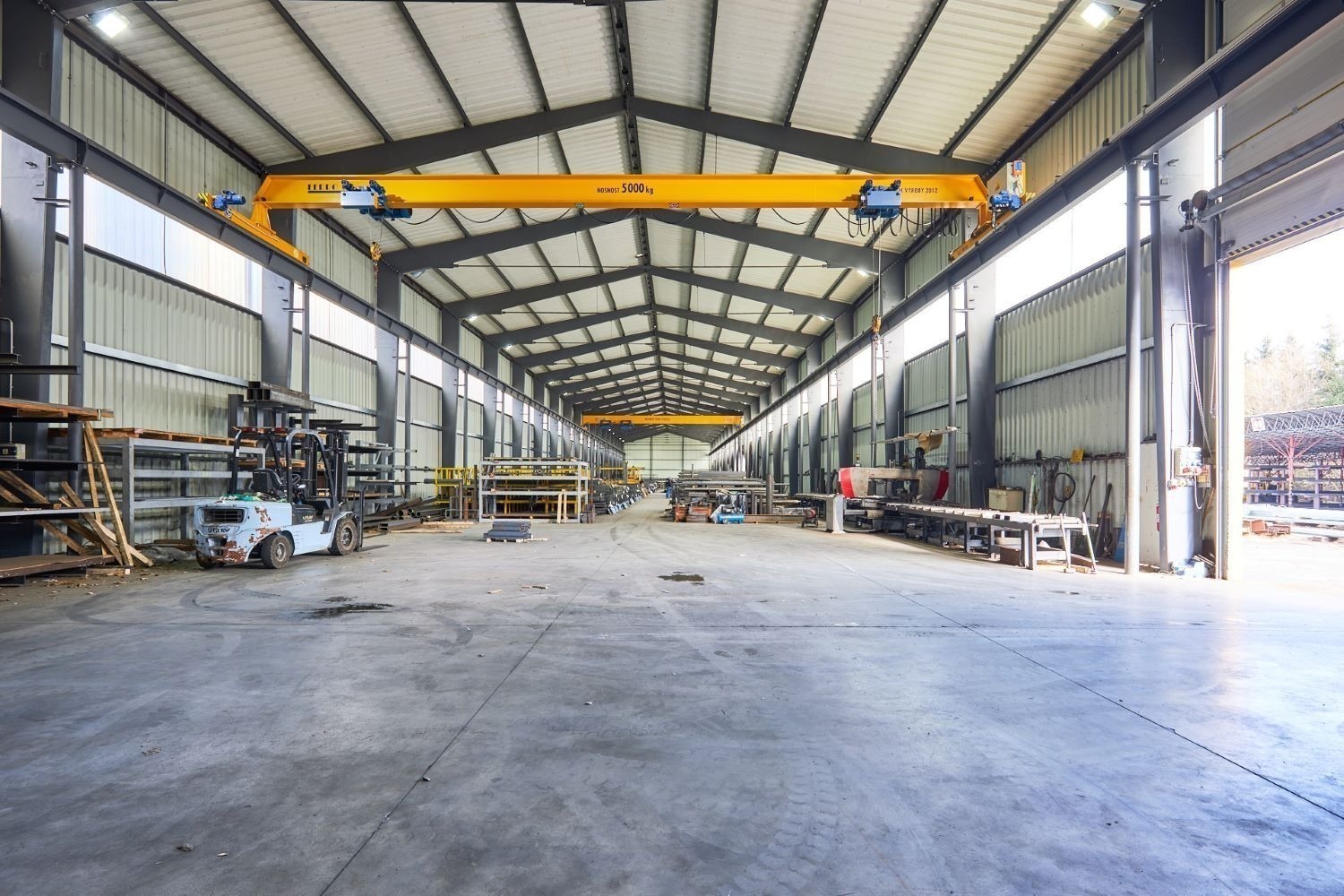 Uvnitř vás přivítá leštěná betonová podlaha, po níž se paletové či vysokozdvižné vozíky pohybují doslova jako po másle. Dva jeřáby instalované v konstrukci haly se postarají o rychlou nakládku i vykládku, klidně hned dvou kamionů najednou. Tato víceúčelová hala tak zvládne bez problémů pokrýt jakoukoliv náročnější výrobu nebo logistické aktivity.