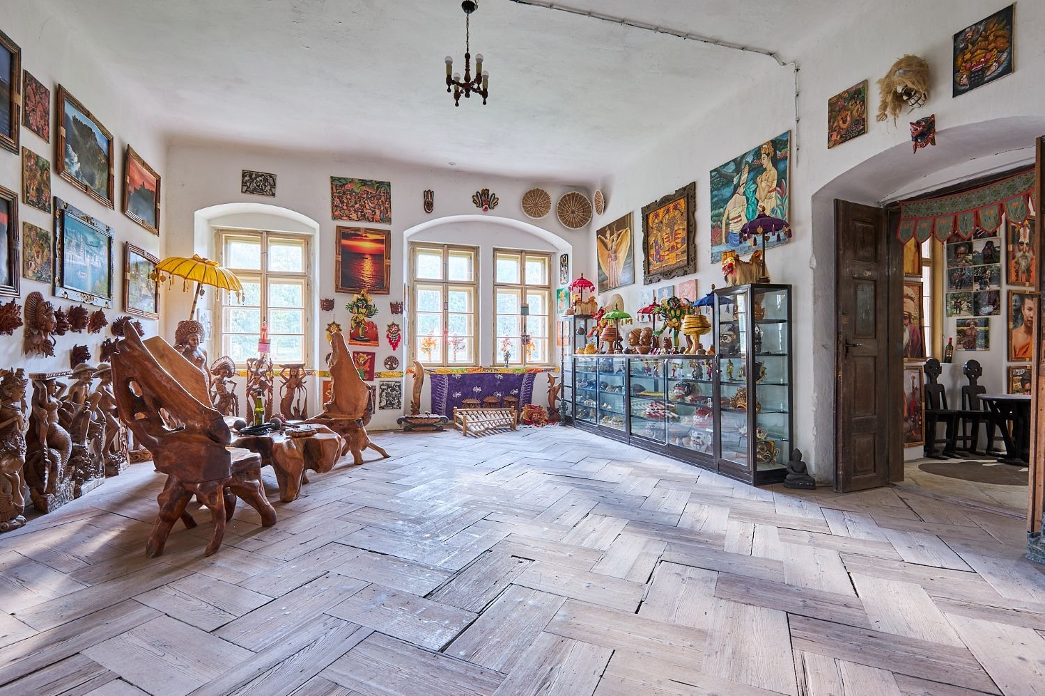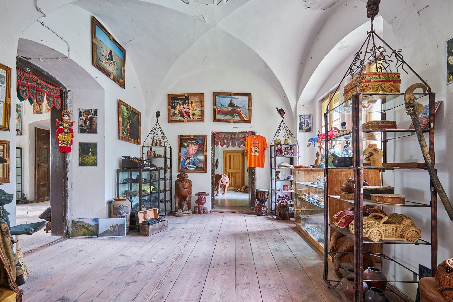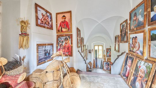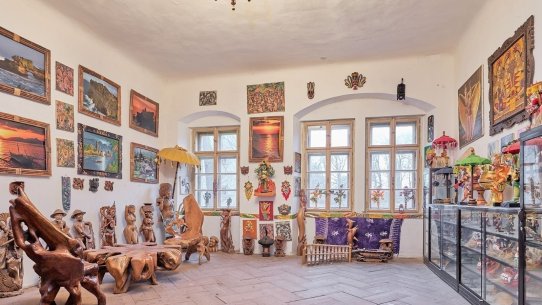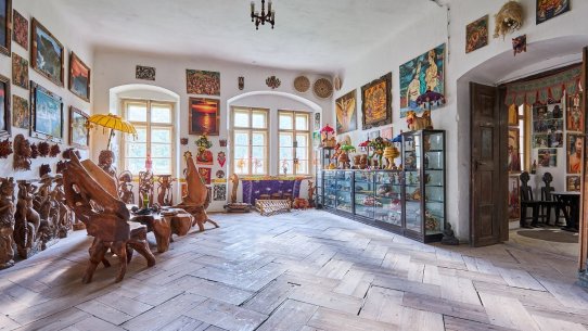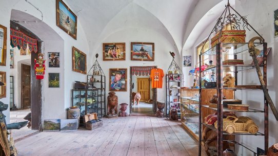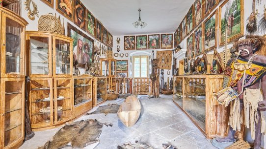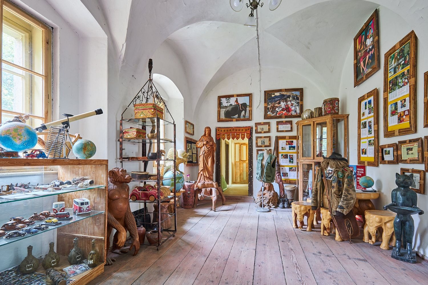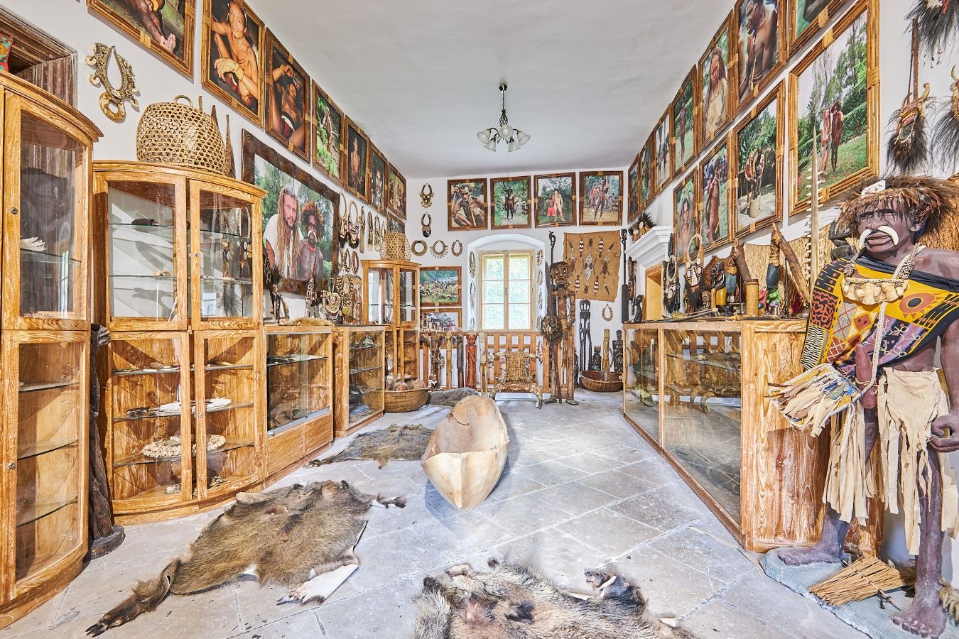 V části zámecké budovy majitel zřídil unikátní expozici etnografických předmětů, které přivezl ze svých dobrodružných cest za domorodými kmeny ve více než 120 státech.
