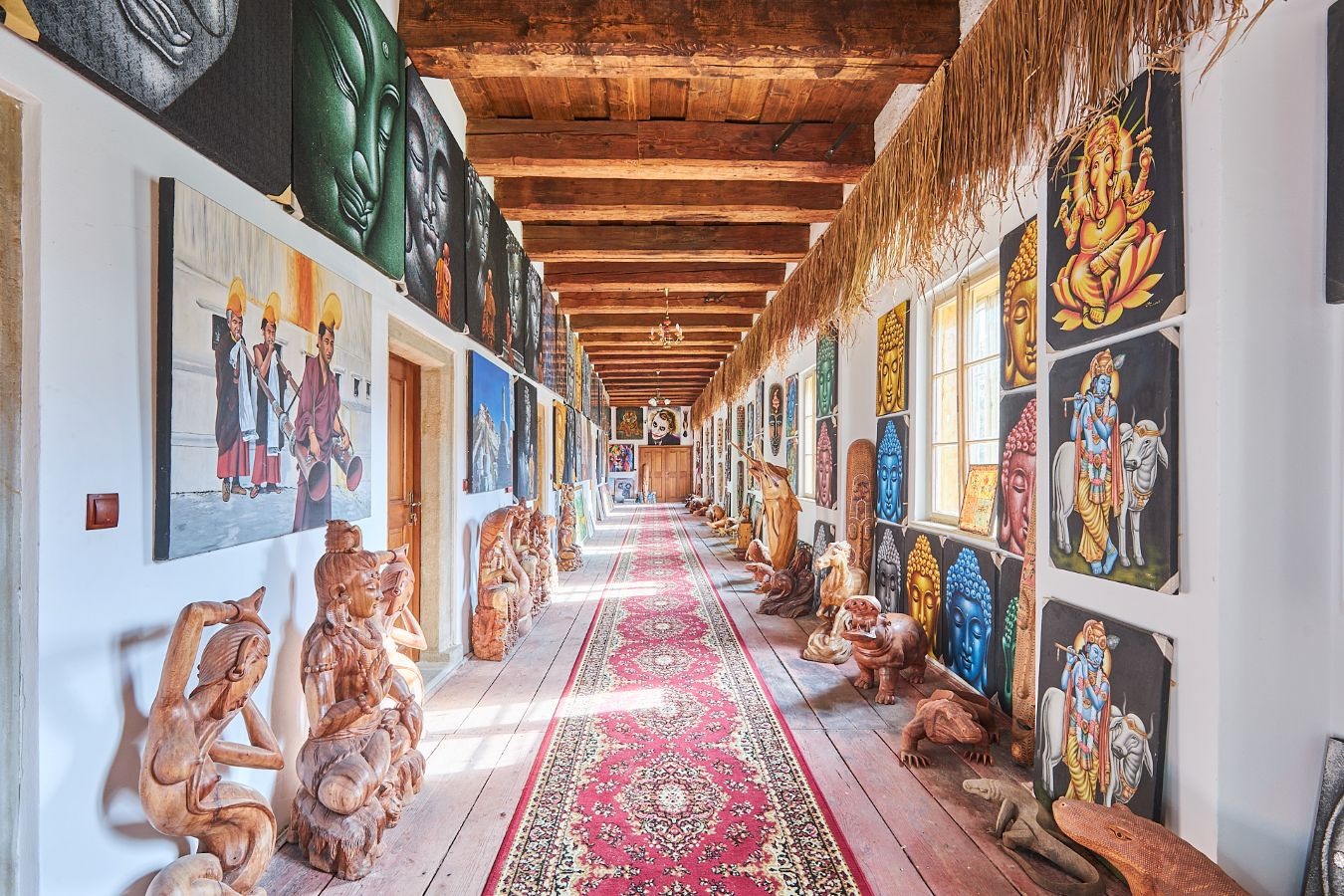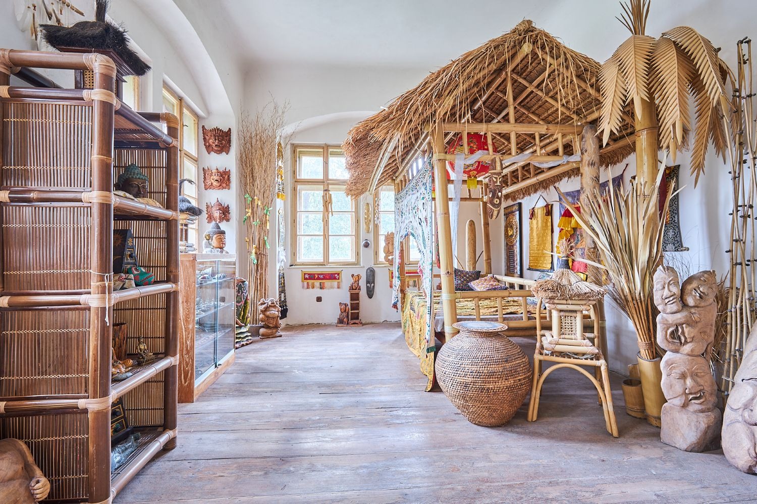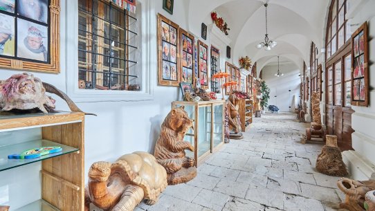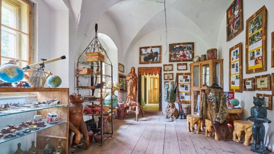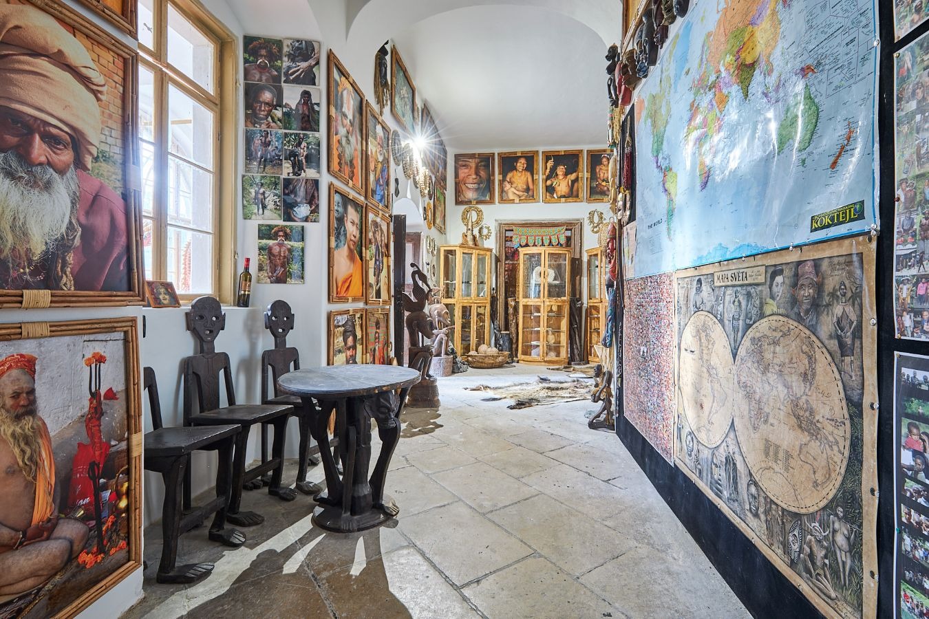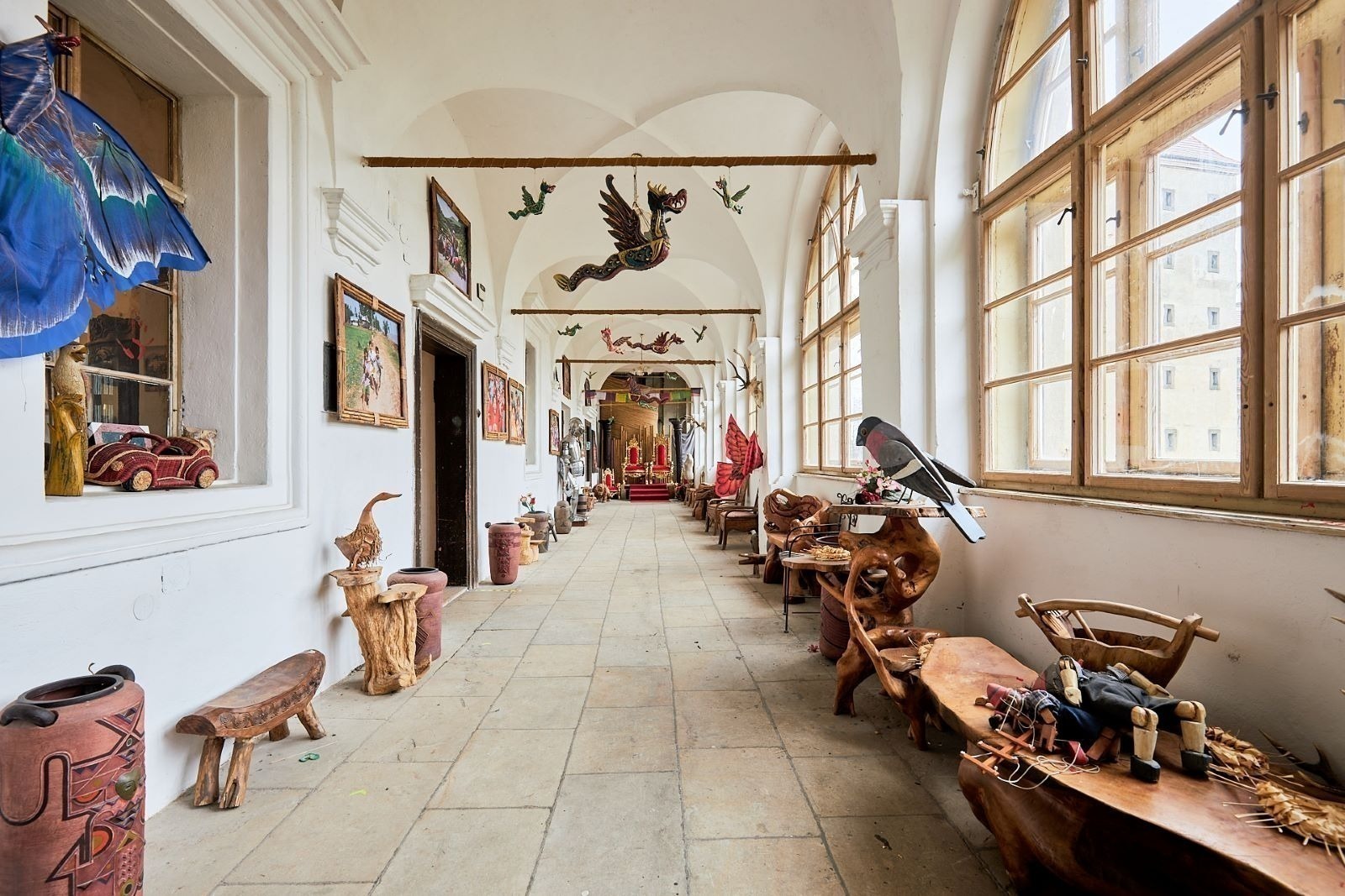 V části zámecké budovy majitel zřídil unikátní expozici etnografických předmětů, které přivezl ze svých dobrodružných cest za domorodými kmeny ve více než 120 státech.