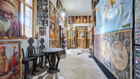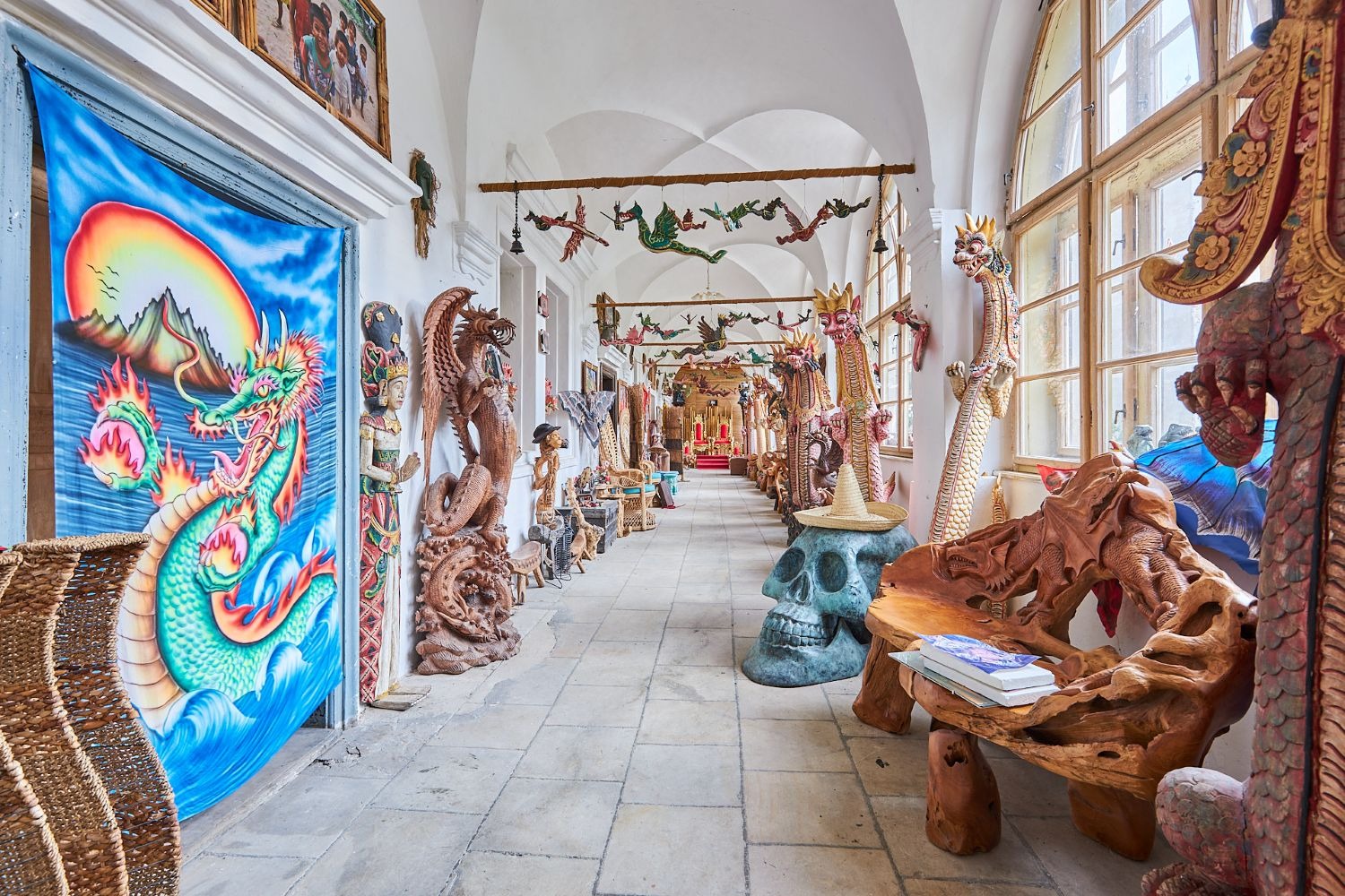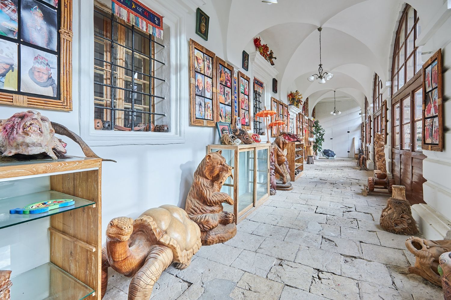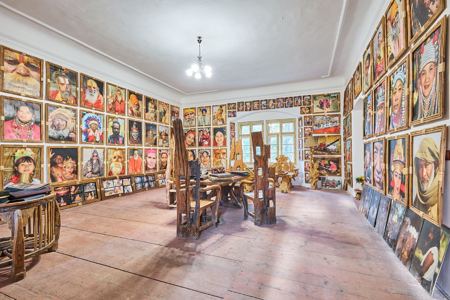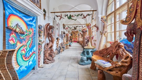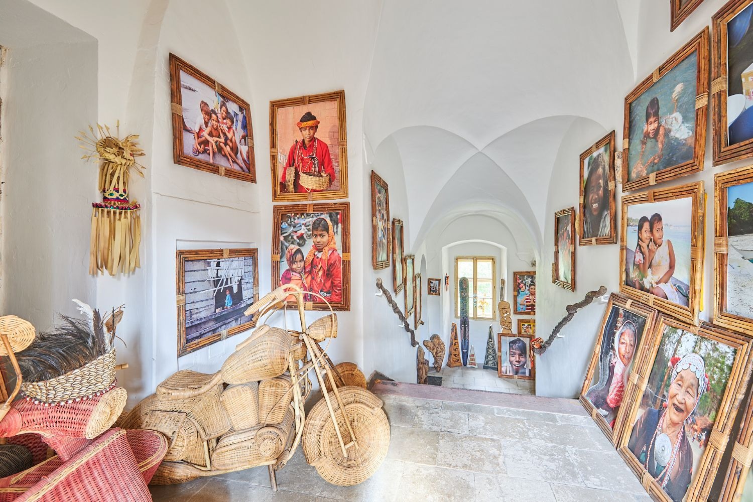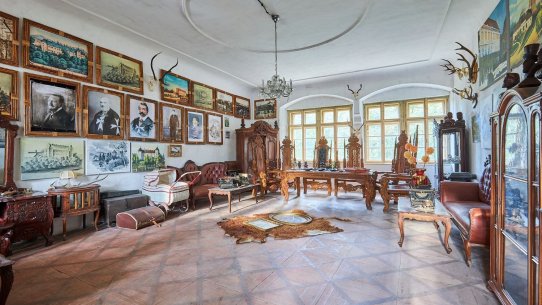 V části zámecké budovy majitel zřídil unikátní expozici etnografických předmětů, které přivezl ze svých dobrodružných cest za domorodými kmeny ve více než 120 státech.