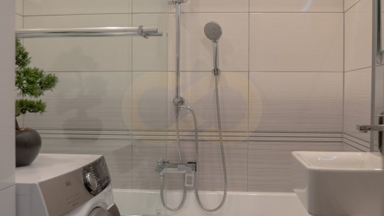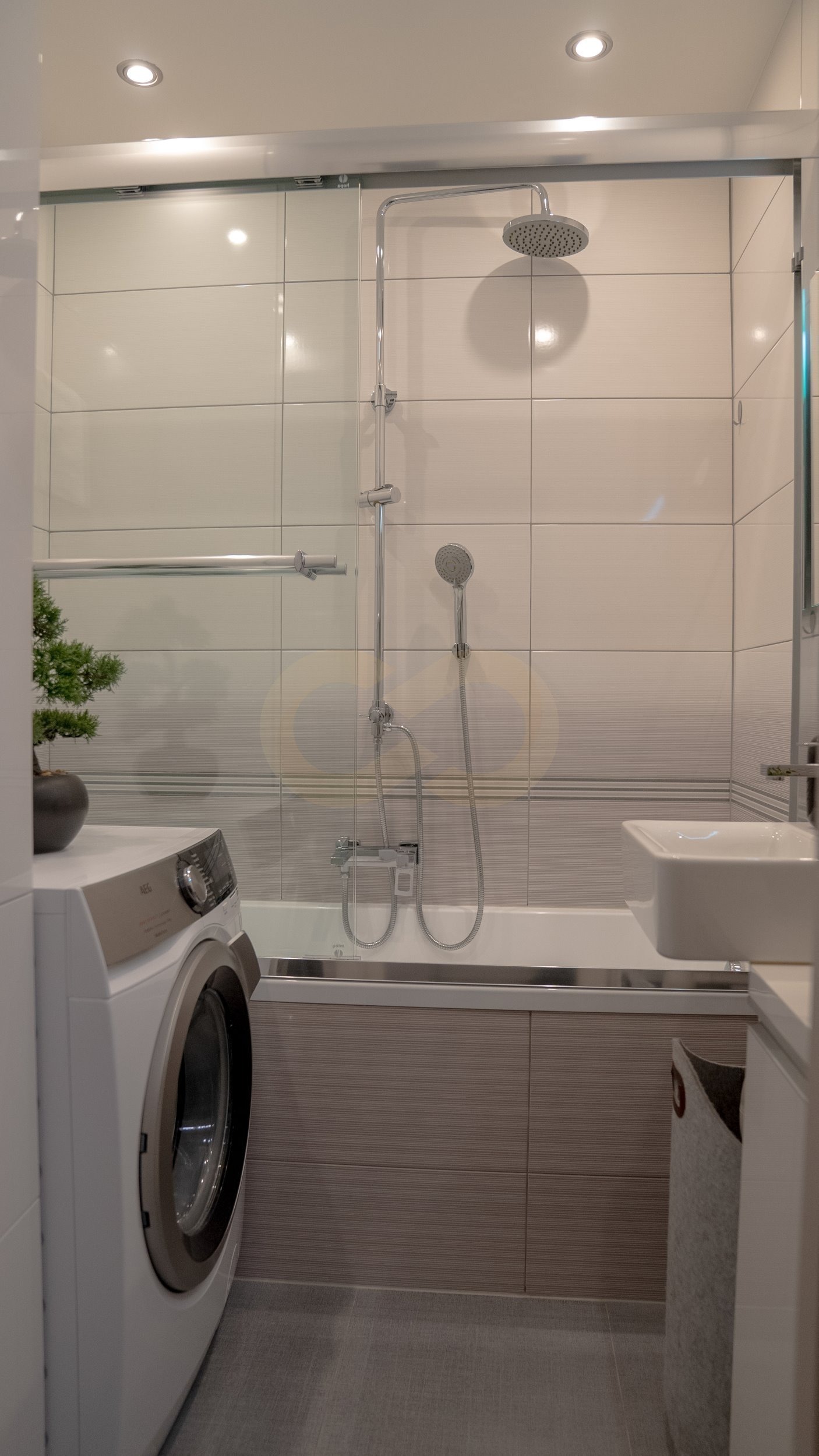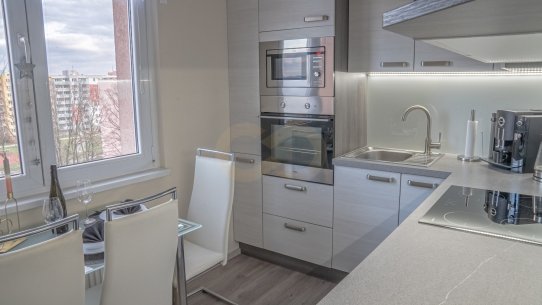 Byt je jako ze škatulky, před pár lety totiž prošel rekonstrukcí. V kuchyni je elegantní linka s vestavěnými spotřebiči, v koupelně zase moderní velkoformátové obklady a vana se zástěnou pro sprchování.
